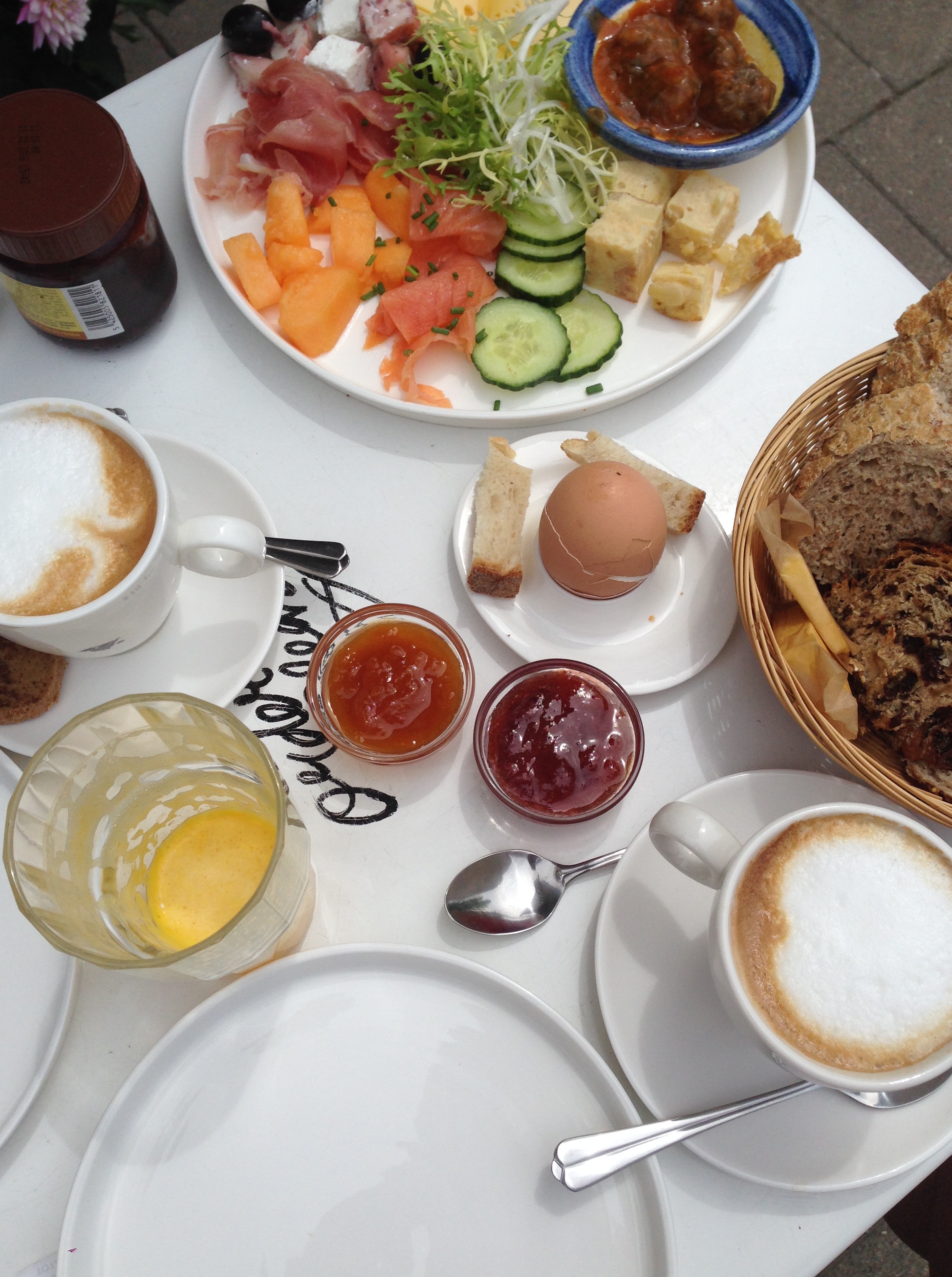Het hoeft weinig uitleg dat we hiervan smikkelen. Alleen de inktvis geraakt er bij mij op dit uur van de dag (hoewel het inmiddels eigenlijk al 13u30 is) nog niet in. Leuk vind ik dat je telkens combinaties kunt maken op je boterham of gewoon op je vork geprikt: gerookte ham met perfect rijpe meloen, gerookte zalm met komkommer, … Hoewel ik niet echt een koffiekoekenmens ben, verdienen de croissants hier toch een speciale vermelding. Ze hebben het misschien zelfs in zich om mij te bekeren!