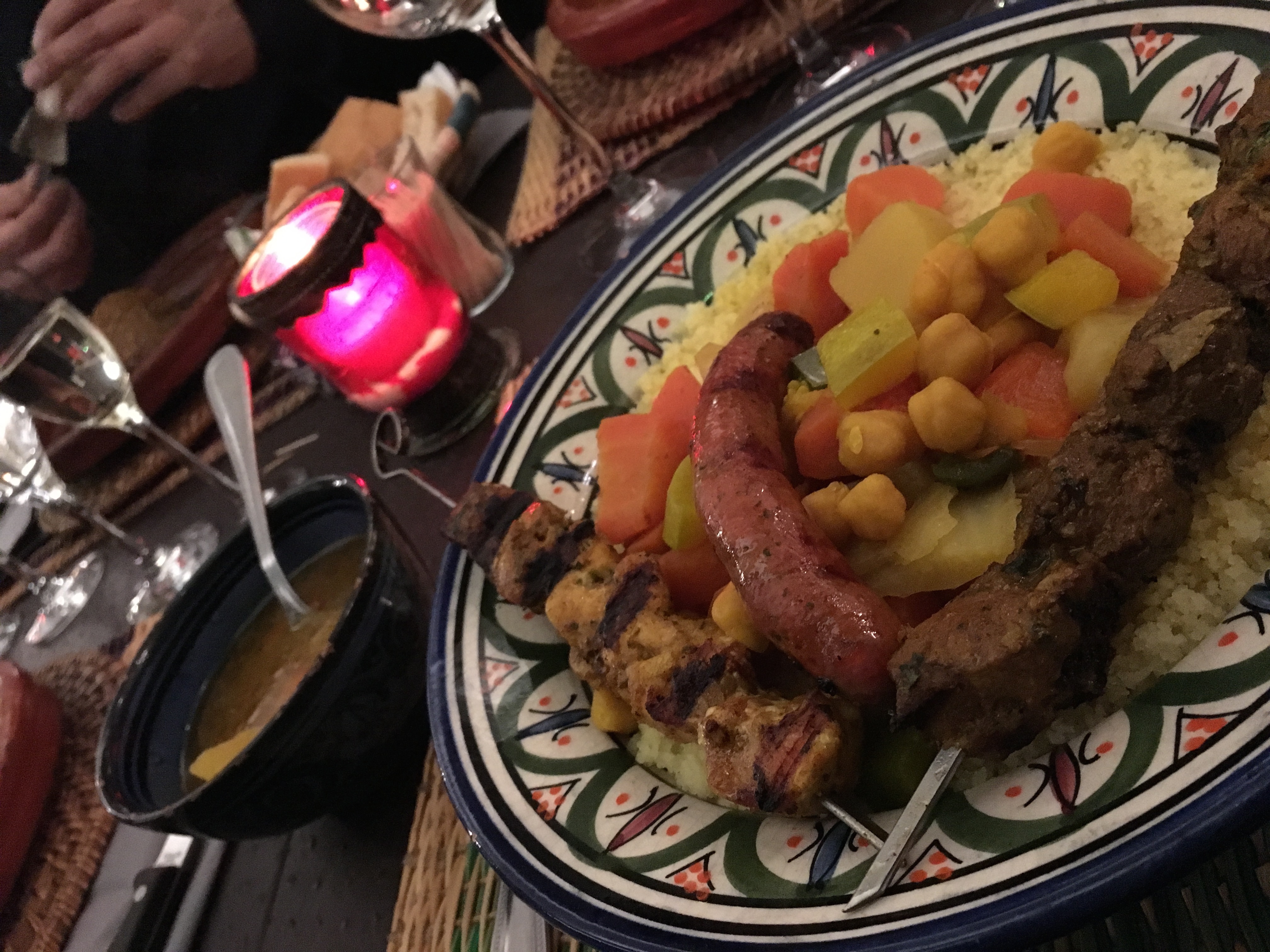 De gerechten komen op tafel en in mijn geval blijkt het zonder die grote kommen van bij Mouss’tafel te zijn. Wel krijg ik nog een extra portie bouillon om mijn royale couscous te bevochtigen. Even proeven… Zeker niets mis mee! Ik eet met smaak en dat lijkt niet anders bij de disgenoten die voor de tajine met lam kozen.