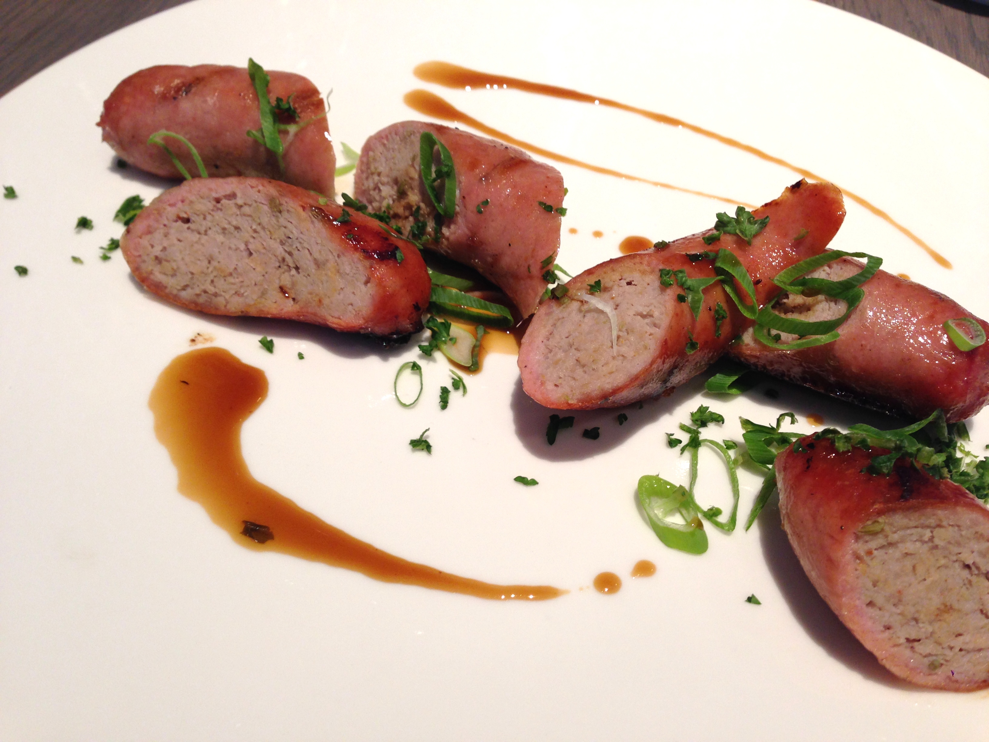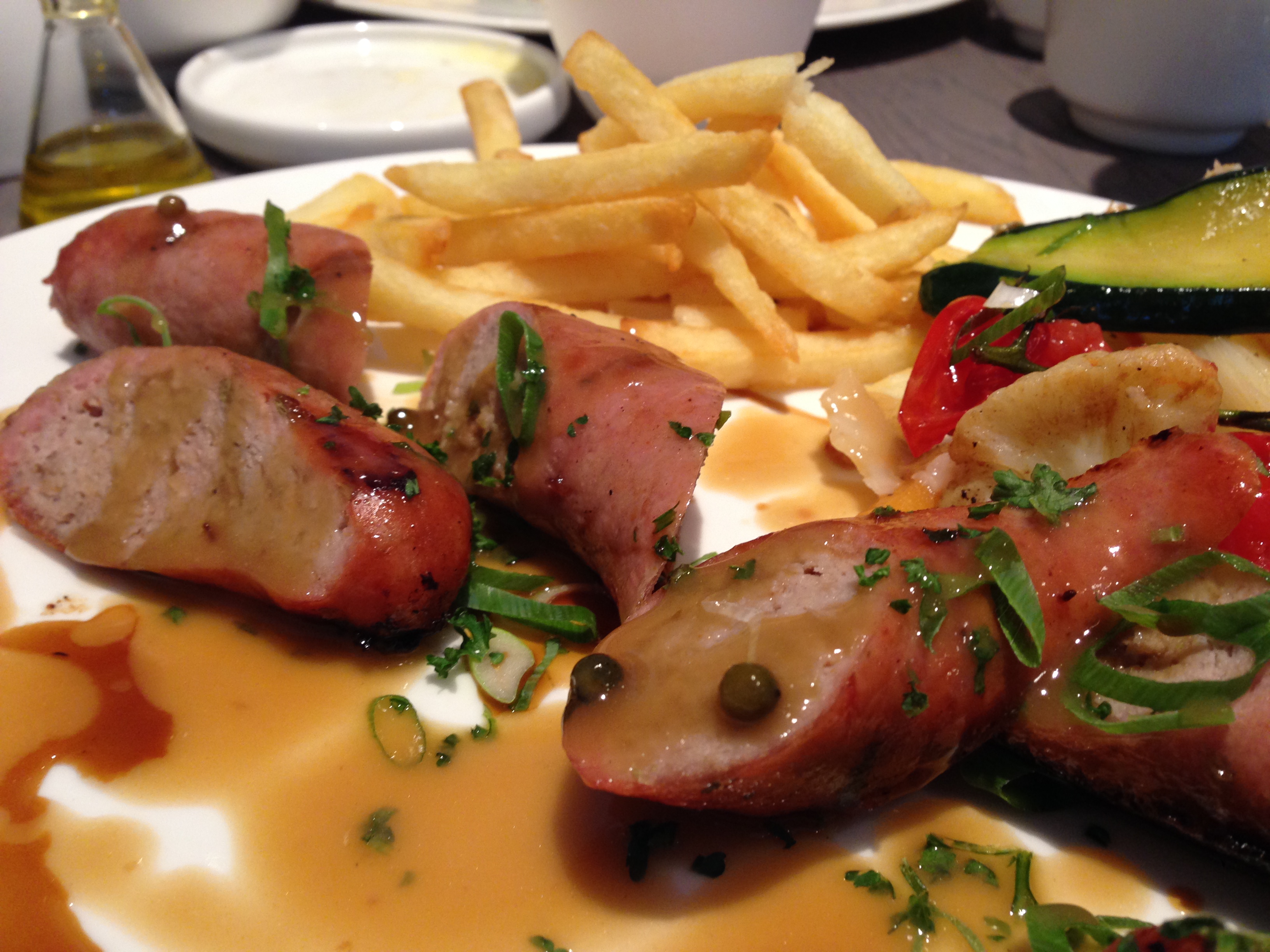 Het plan is om het bescheiden en bondig te houden. Dat in combinatie met een zwak voor de specialiteiten van het huis – zeg maar de USP van een restaurant – leidt ons tot de in eigen atelier bereide, gegrilde worst (€ 17). Ik kies de venkel, mijn vriendin de pistache & boschampignons. Daarbij staat op de kaart dat alle gerechten geserveerd worden met garnituur naar keuze. Warme seizoensgroenten of rauwkostsalade: warm graag! Frietjes, puree of aardappel in de schil: allez dan, frietjes! Vleesjus, béarnaise, champignon-roomsaus of peperroomsaus: moeilijk, want past béarnaise bij pistache & boschampignons en peperroom bij venkel? De dienster lijkt onze twijfel niet meteen te snappen: ze denk eigenlijk dat er geen saus geserveerd wordt bij de worst, hoewel dat toch duidelijk zo op de kaart. Nevermind! We volgens ons buikgevoel.