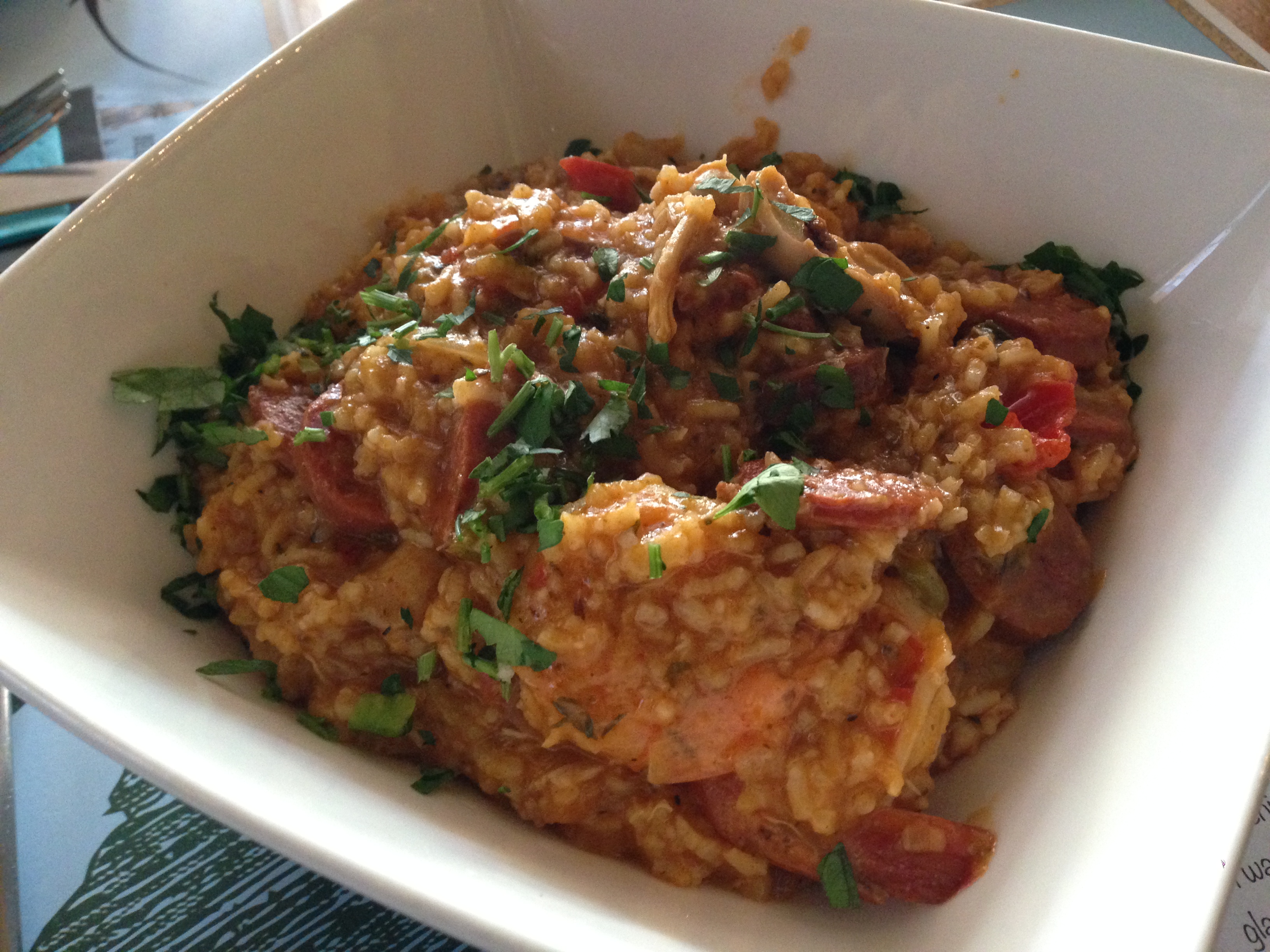 Zoals je op de foto kan merken, scoort jambalaya niet meteen in fotogeniek wezen. Nochtans zit de smaak van het gerecht prima: cajun paella dekt de lading. Smeuïge rijst met groentjes, cajunkruiden, kip, chorizo en scampi. De portie lijkt bij het opdienen niet al te groot, die ogen-groter-dan-buik-gedachte trek ik echter volledig terug. Ik weet dat je dergelijke gerechten puur eet, maar ik zou er als hardcore sla-eter toch wel wat groen bij lusten. Ook de andere borden vallen in de smaak, in het bijzonder over de hondshaai hoor ik lovende woorden.