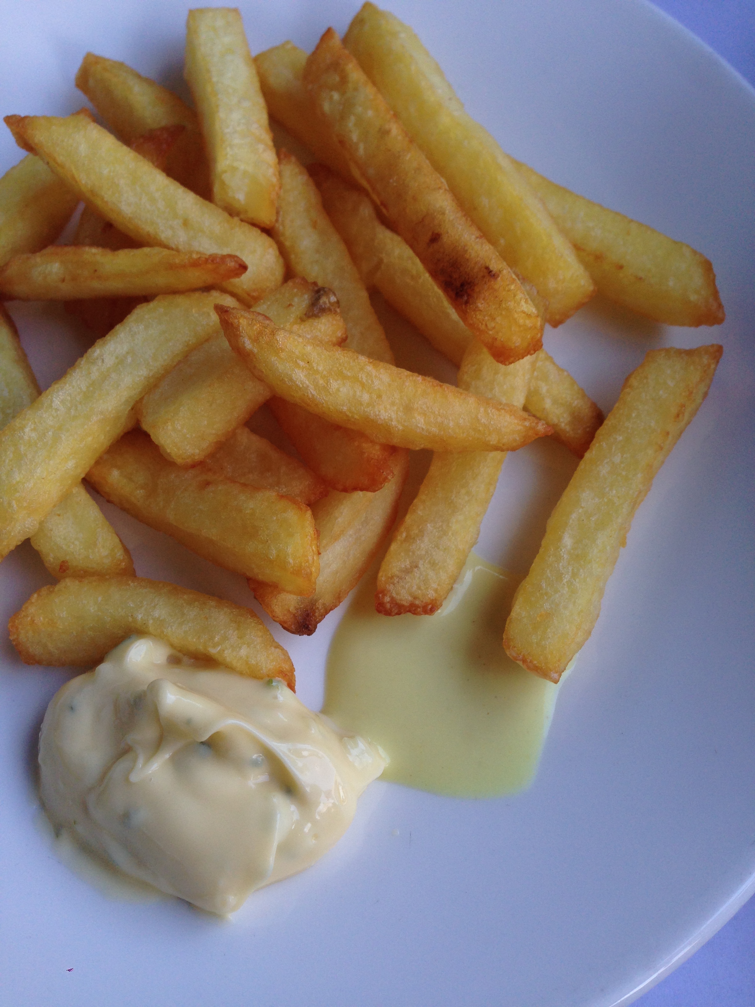 Tevens nog een dikke duim voor de goudgele frietjes en de begeleidende sausjes: een mash-up tussen mayonaise en tartaar enerzijds en een meer liquide mosselsaus.