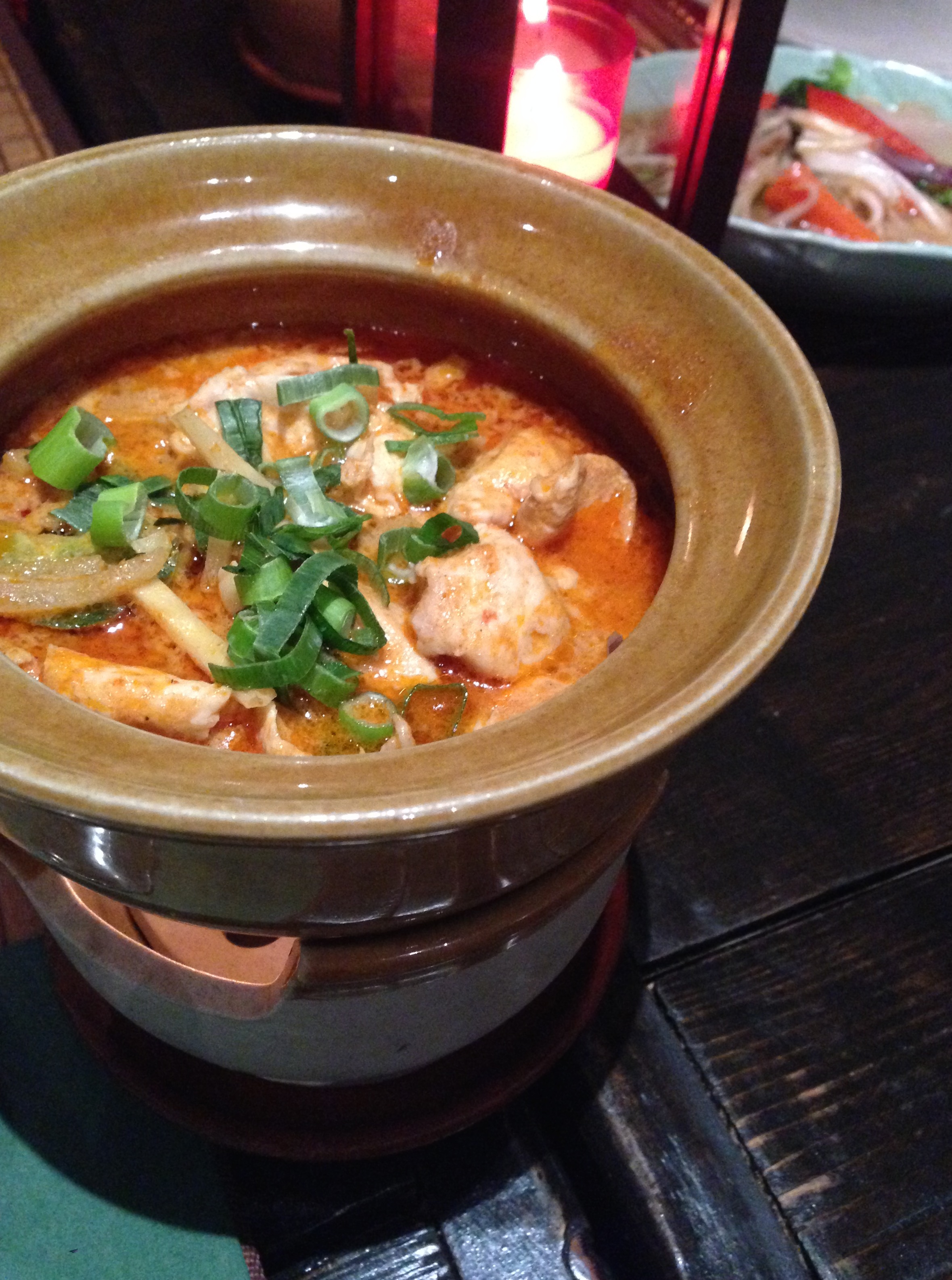 Wanneer deze verschijnen, zie ik alle gezichten opklaren. De stoofpotjes komen in keramieken schaaltjes met daaronder een theelichtje, waardoor mijn rode curry bijvoorbeeld uitnodigend blijft brobbelen. De Keang Phet Kai (€ 14,50 – rode curry van kip met kokosnootmelk, bamboescheuten en verse zoete basilicum) voldoet, maar verrast zoals verwacht niet. Ik proef even van een paar naburige borden waar er iets minder standaardkeuzes gemaakt zijn, zoals eend met lychee of rund met broccoli. Stuk voor stuk lekkere Thaise keuken, bij de betere / beste van Gent.