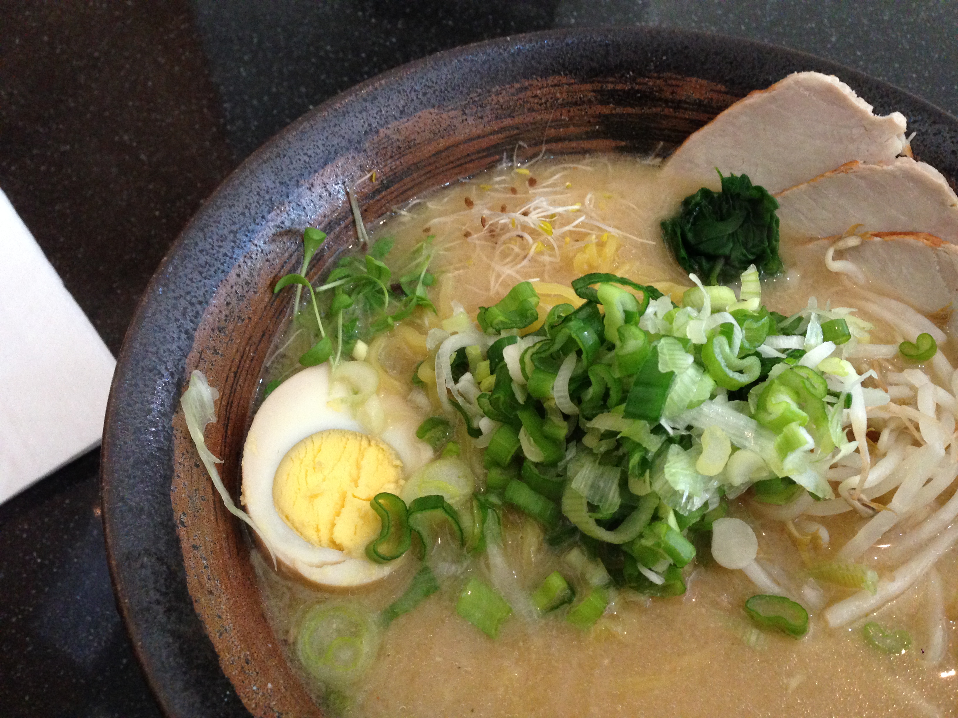 De miso ramen bestaat uit noedels en dampende bouillon als basisingrediënten. Daarbij komen sneetjes varkensgebraad, een half hardgekookt eitje en allerlei groenten: sojascheuten, luzernescheuten, cresson, spinazie, lente-uitjes en peultjes. Telkens opnieuw verwonder ik mij over de diepe smaak van de bouillon in zo’n noedelbar. Dat moet ik thuis toch ook eens proberen, maar ik heb zo’n lichtblauw vermoeden dat ik niet eens in de buurt zal komen van Nanaban. Hun soep smaakt overigens nog beter eens je merkt dat een oude Japanner er chef is.