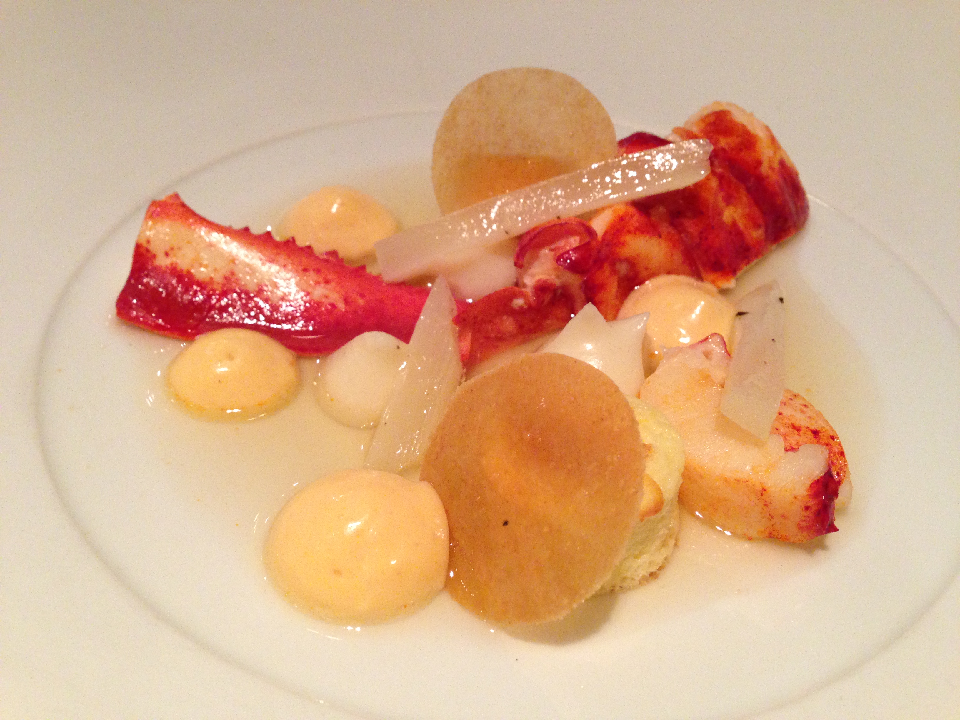 Bij het serveren ligt op de kreeft een geurende dennetop, Kerstmis is tenslotte nog niet zo lang geleden… De spitsvondige combinatie kreeft en schorseneer werkt wonderwel.