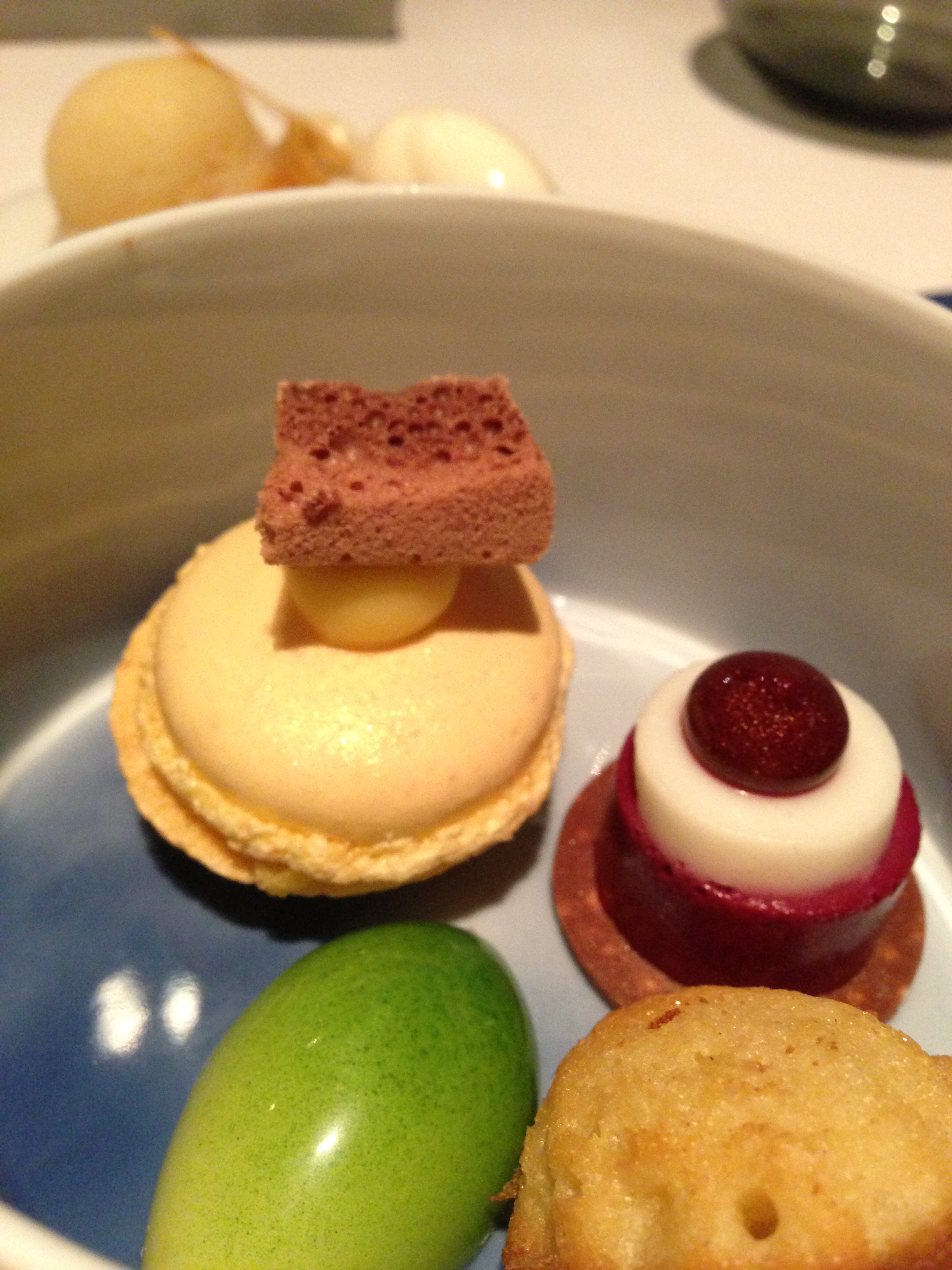 Bij de koffie en de thee verschijnt steevast nog een extraatje, zo ook in Nuance. Een bijzonder blauw potje van Pieter Stockmans met daarin vier verrassingen (versgebakken madeleintje, witte praline, bordeaux bavarois en macaron – waarvan alle details mij helaas ontgaan zijn) en twee erbovenop (kaastaart en citrussorbet). En alsof dat nog niet genoeg verwensels zijn daarenboven een witte steen met superfris yoghurtijs, crumble en een doordrenkt cakeje. Strelingen voor oog en tong, stuk voor stuk.
