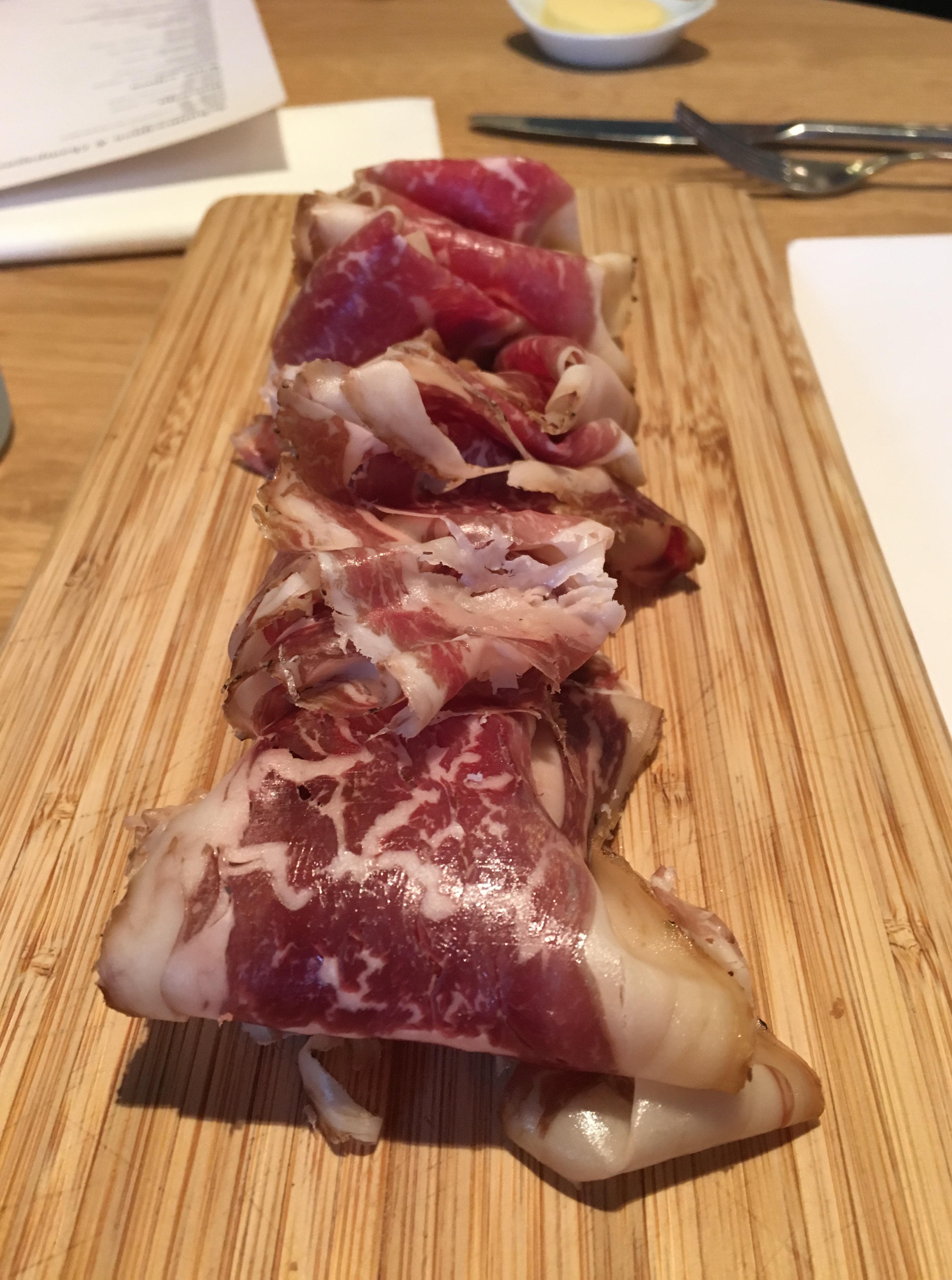 Jawadde, die Secreto! Echt terecht van de chef om hier hoog mee op te lopen. Er wordt net niet gevochten voor het laatste stukje… Terwijl we de menukaarten en het krijtbord met suggesties bestuderen, glijdt de cava rustig naar binnen. De andere dame voelt wel wat voor het menu (€ 58 voor drie gangen). Ik wil zo laat op de avond – inmiddels 21u30 – niet té zwaar meer eten, dus bij voorkeur geen menu of voor- en voorgerecht à la carte.