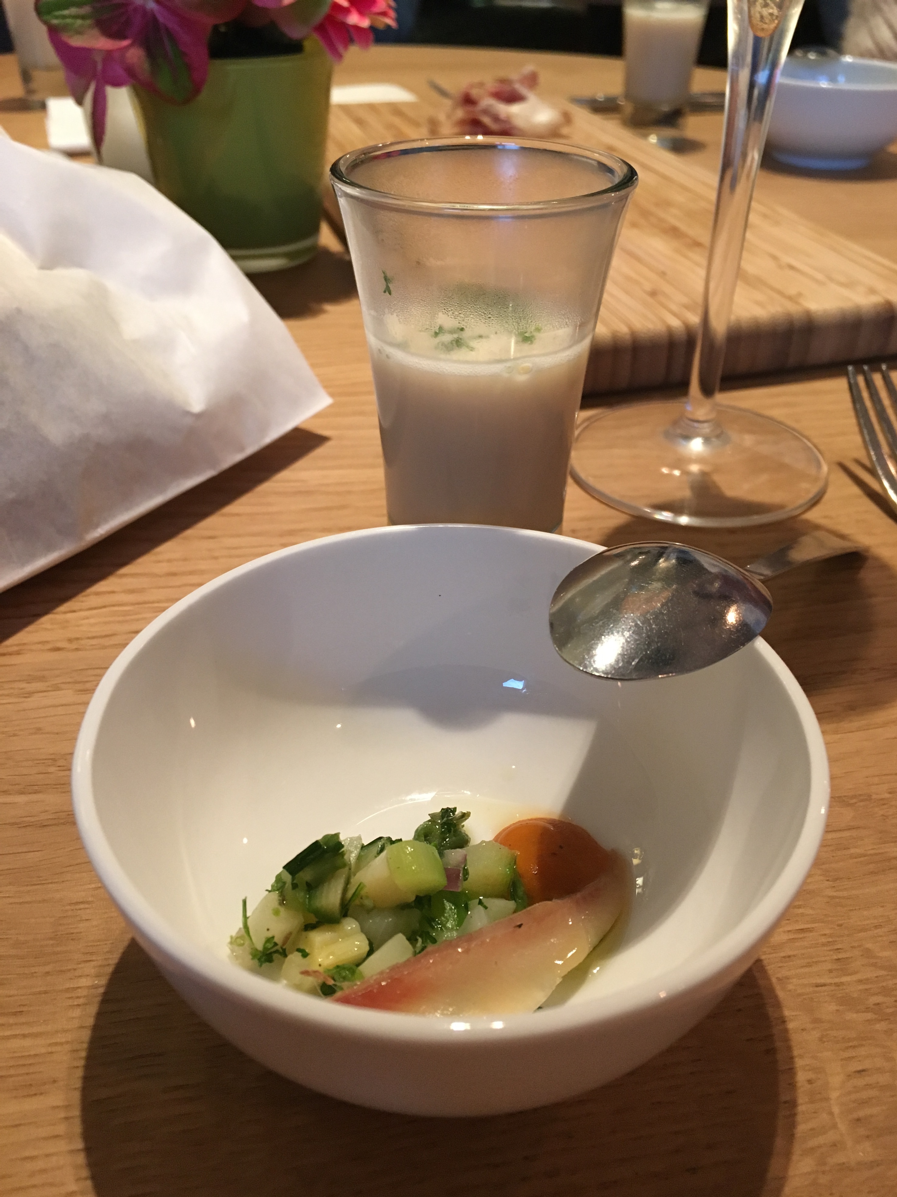 We installeren ons als eersten aan een ronde tafel en de wederhelft gaat alvast even zwaaien in de keuken. Eens voltallig komt chef Benny het menu toelichten en hij belooft voor wat lekkers te zorgen. En hij meent het: we krijgen een fles cava, een plankje Secreto en twee amuses (aspergesoep en gerookte sprot met groene asperge). Benny sprak met veel enthousiasme over zijn vlees: zowel de Secreto als het gerijpte vlees.