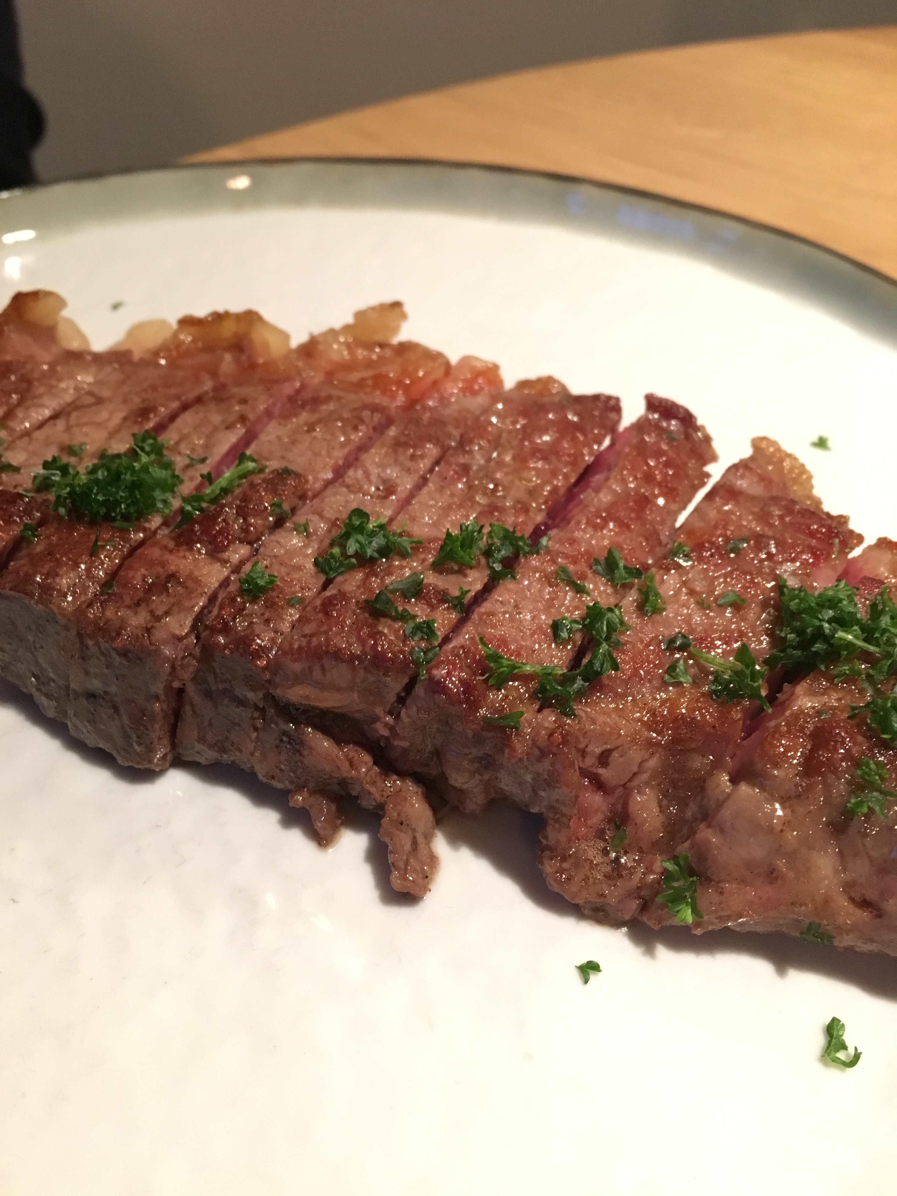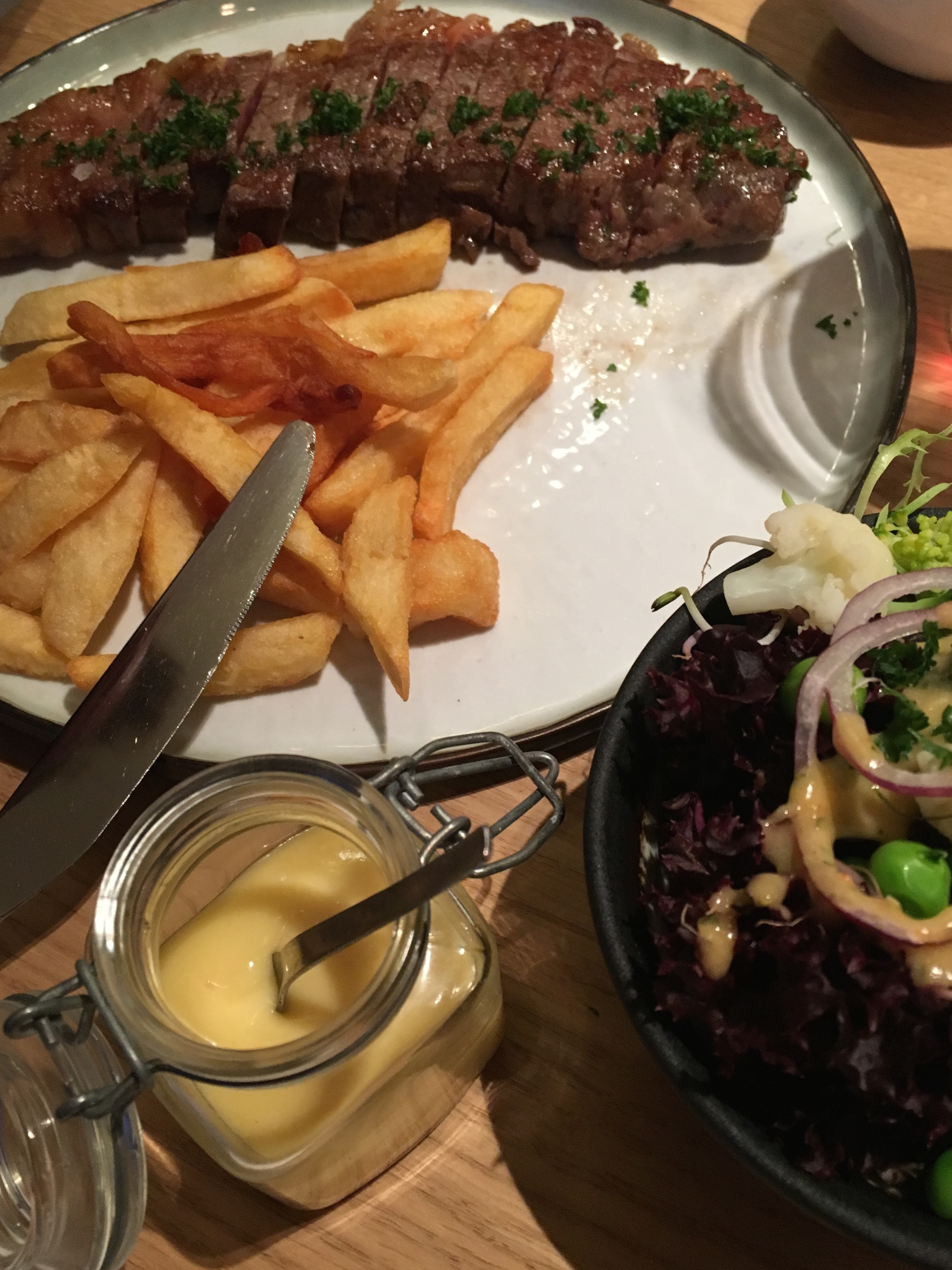 We besluiten om elk een hoofdgerecht uit te kiezen: de heren weten al lang dat ze het gerijpt rundsvlees van de week willen. De keuze bestaat uit Piemontese, Parthenaise en Black Angus (€ 34). Ze vallen op de laatste soort, in het geval van mijn vriend saignant met peperroomsaus. Ook de andere dame bezweek instant, maar dan voor de asperges. Alleen staan die enkel als voorgerecht (€ 19) op het suggestiebord en wil zij een hoofdgerechtversie: geen enkel probleem. Sympathiek van Ons Keuken!