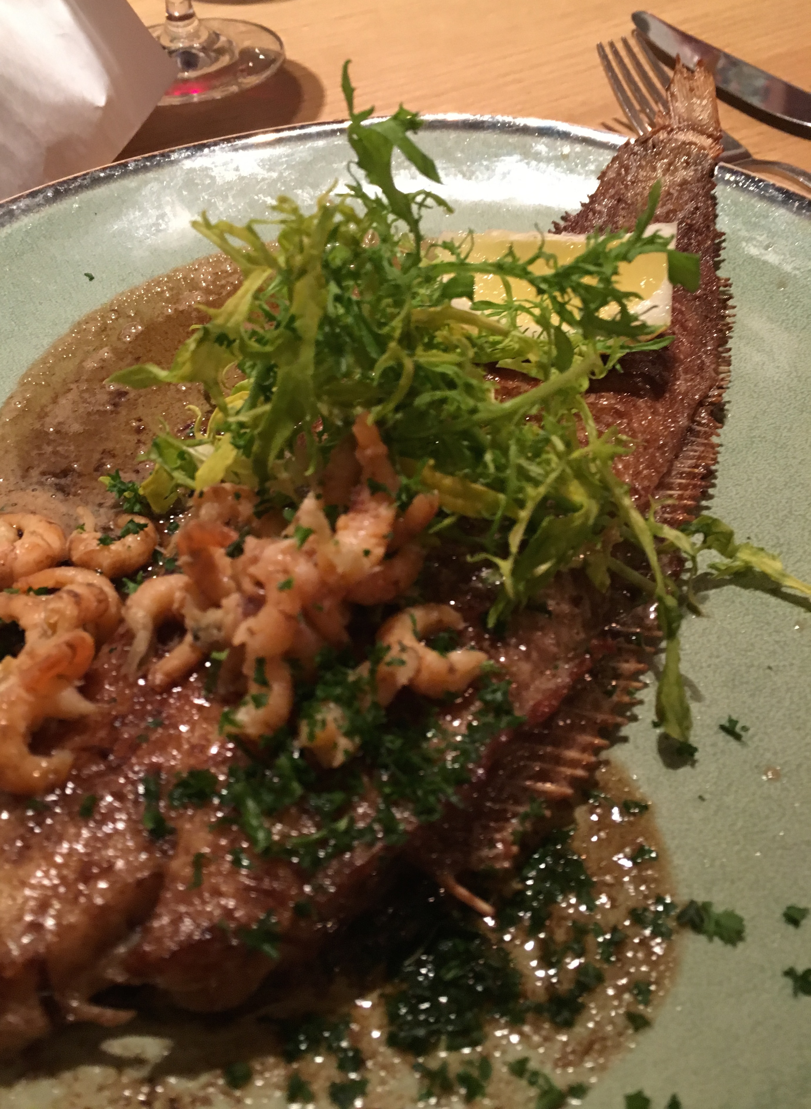 Alleen ik twijfel dus: gambas à la plancha, verse pasta, jonge groentjes (€ 29) of gebakken zeetong, handgepelde grijze garnalen, hazelnootboter, handgesneden frietjes (€ 31). Uiteindelijk zwicht ik voor de zeetong.