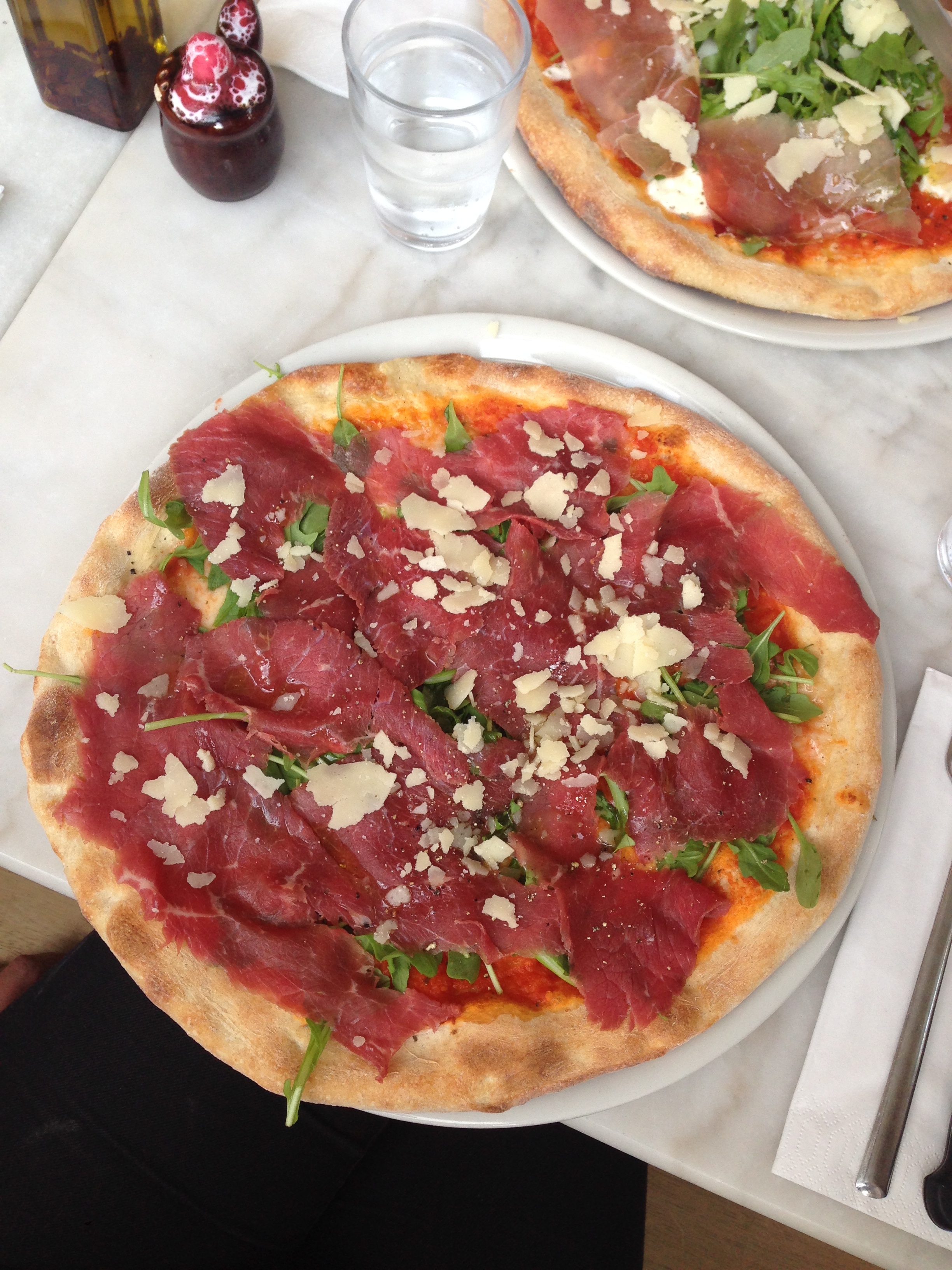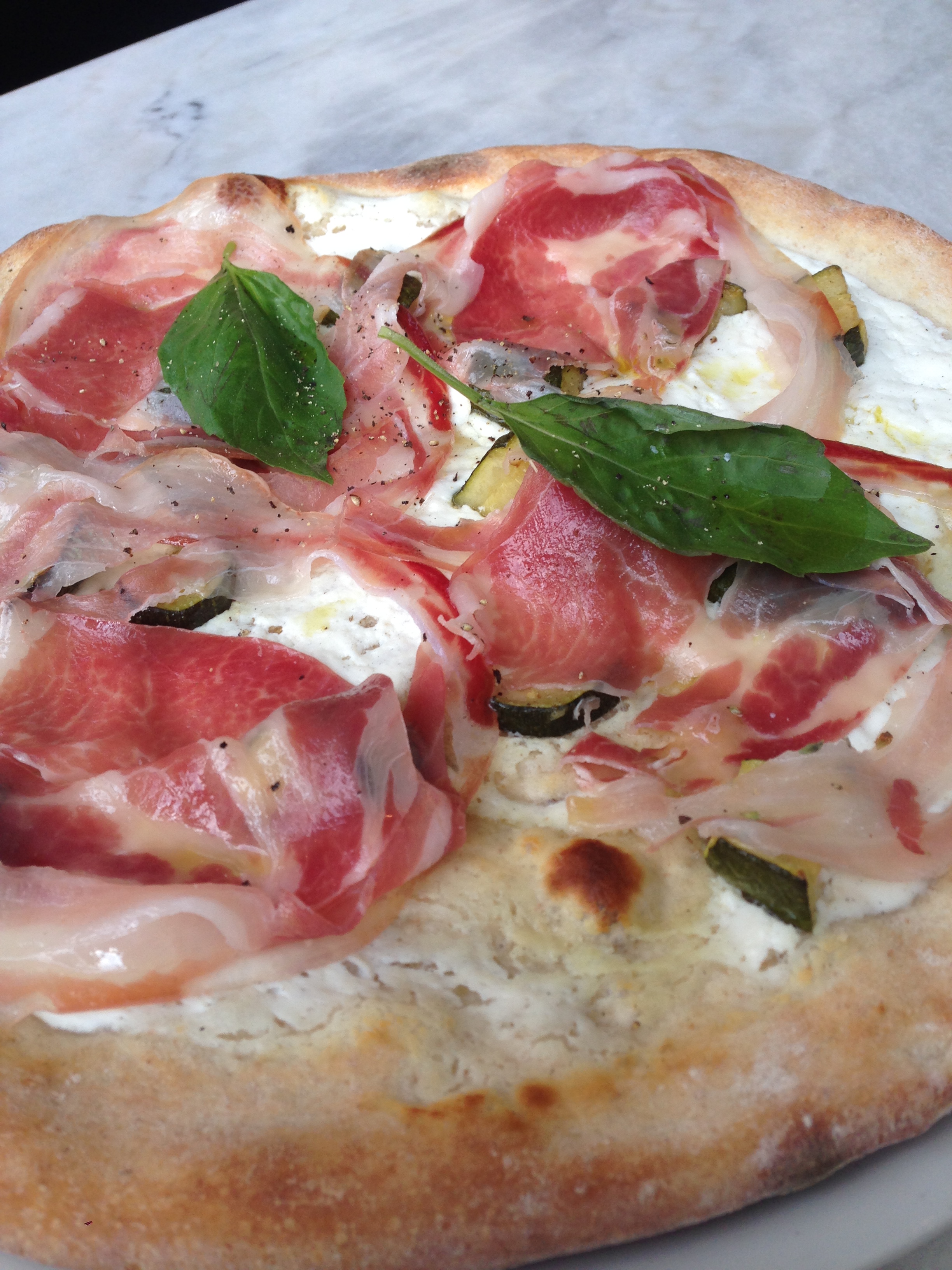De ene vriendin klaagt over een te koude pizza en het gebrek aan écht pikante olie. Ik moet zeggen dat ik mijn exemplaar met smaak opeet en met minstens evenveel tevens een stuk van de PANCETTA. De opkomst van de witte pizza / flammkuchen / tarte flambée bevalt mij wel; ik ben namelijk al een tijdje ricottaverslaafd. Meteen maak ik een mentale nota om deze combinatie thuis te testen: ricotta, pancetta, courgette, oregano.
