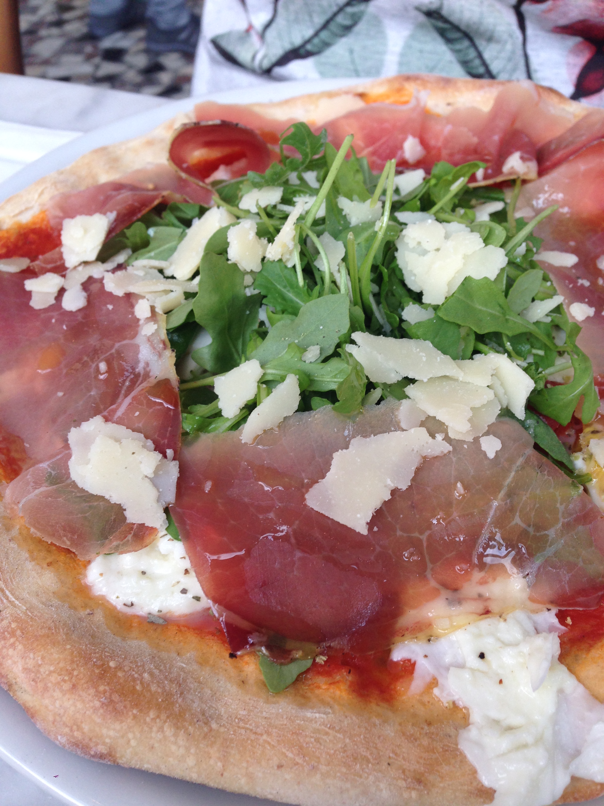 pomodoro – mozzarella di bufala – pomodorini – proscuitto crudo – rucola – basilico – grana padano | tomaat – buffelmozzarella – kerstomaatjes – italiaanse gerookte ham – rucola – basilicum – parmezaanschilfers