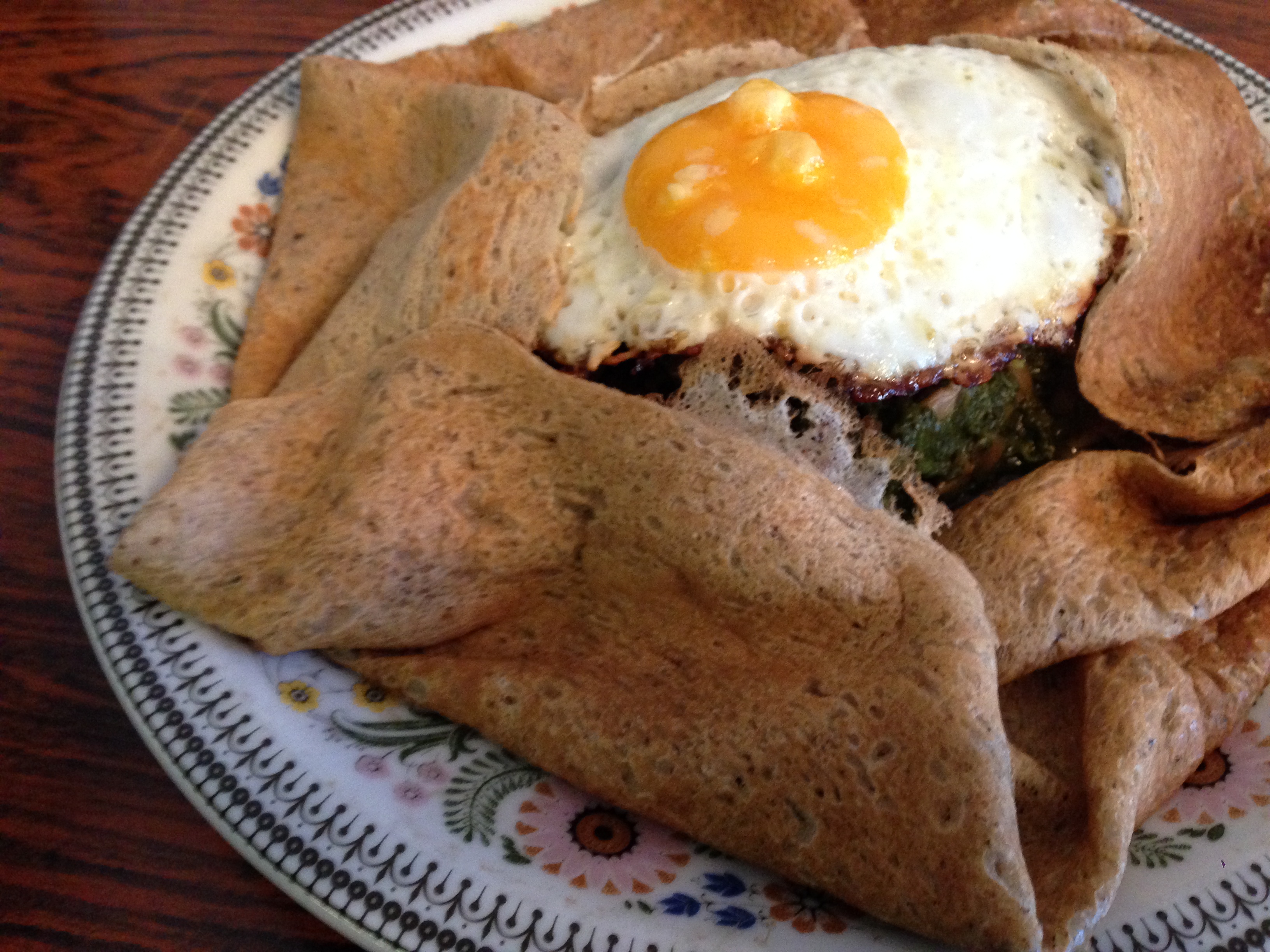Op retrobordjes verschijnt onze lunch. Ik zie blinkende oogjes aan de overkant en ook ik begin te snappen waarom iedereen van Gwenola houdt. De boekweitkoek is groter en dikker dan ik verwacht had. Erin geplooid ligt een stevige hoop spinazie met champignons en daarbovenop een speigelei. Blij dat ik mijn spiegelei-fetisj ook hier de vrije loop gelaten heb… Deze combinatie werkt perfect voor mij.