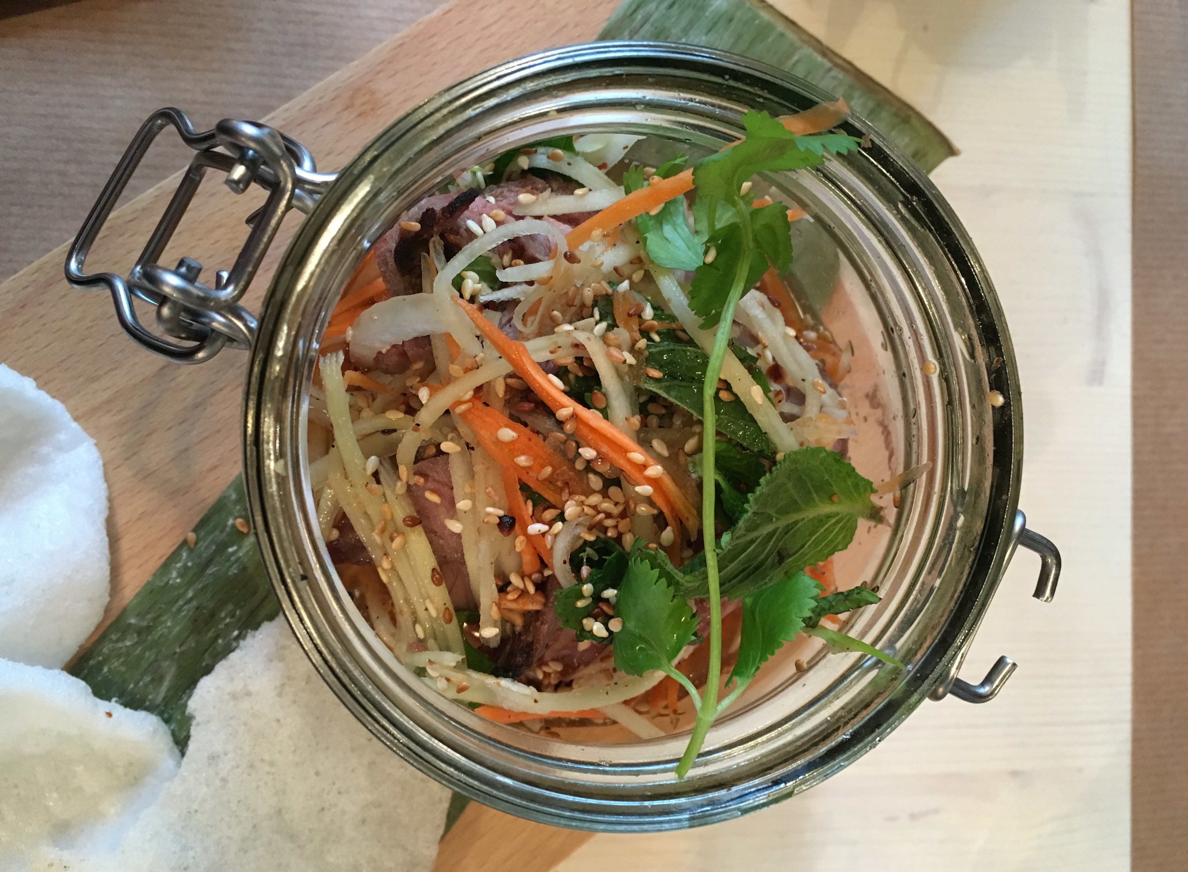 Eerst komt er Vietnamese in a jar: gòi du dù bò (‘a salad consisting out of fresh sliced papaya, carrots and topping of your choice: sliced beef’ – € 8,50). Jammer van het verlepte bananenblad, de smaak van deze starter zit wel goed. Ik val niet achterover van de kwaliteit van het rundsvlees, de vinaigrette en de frisse groenten maken het goed.