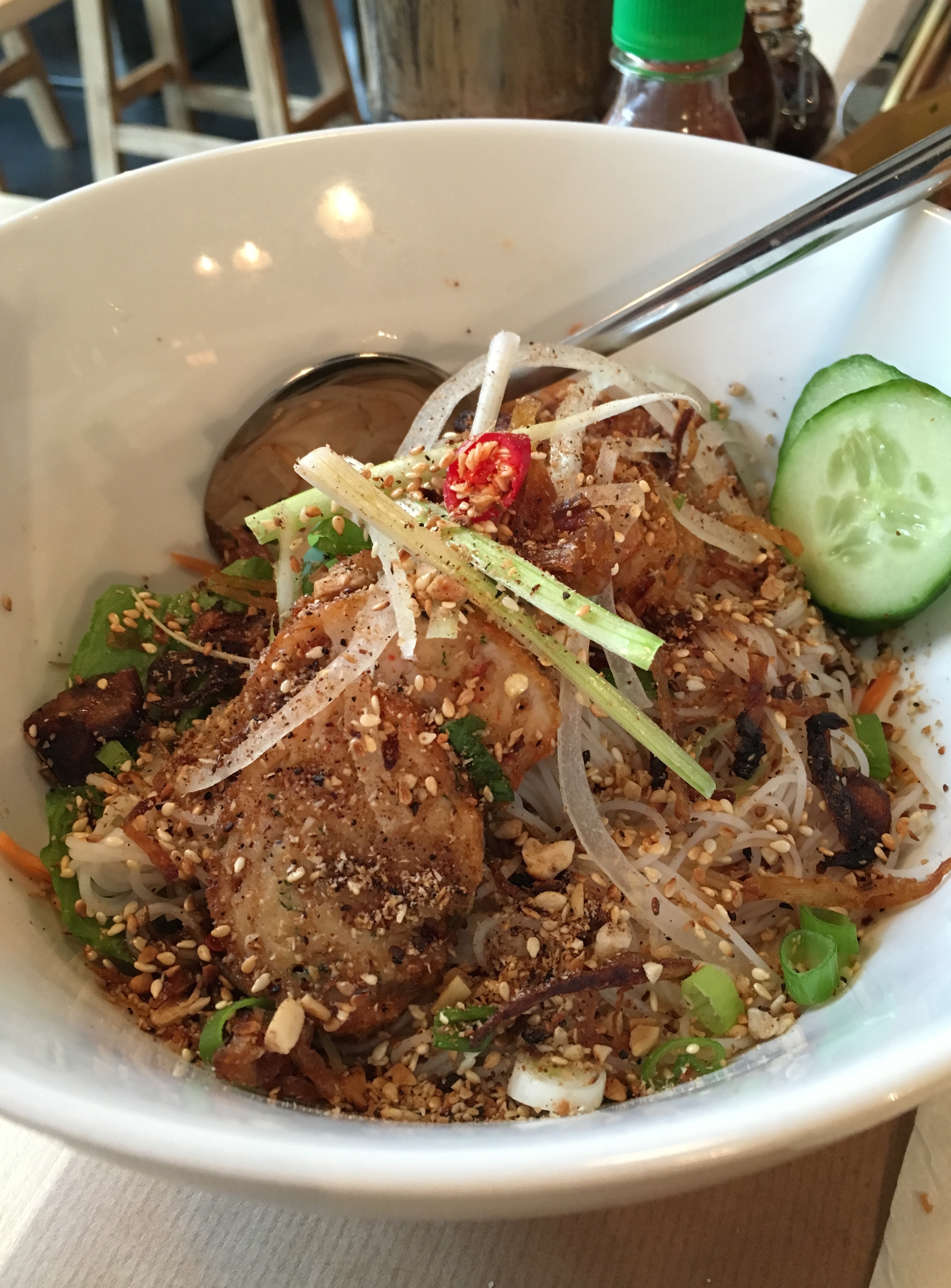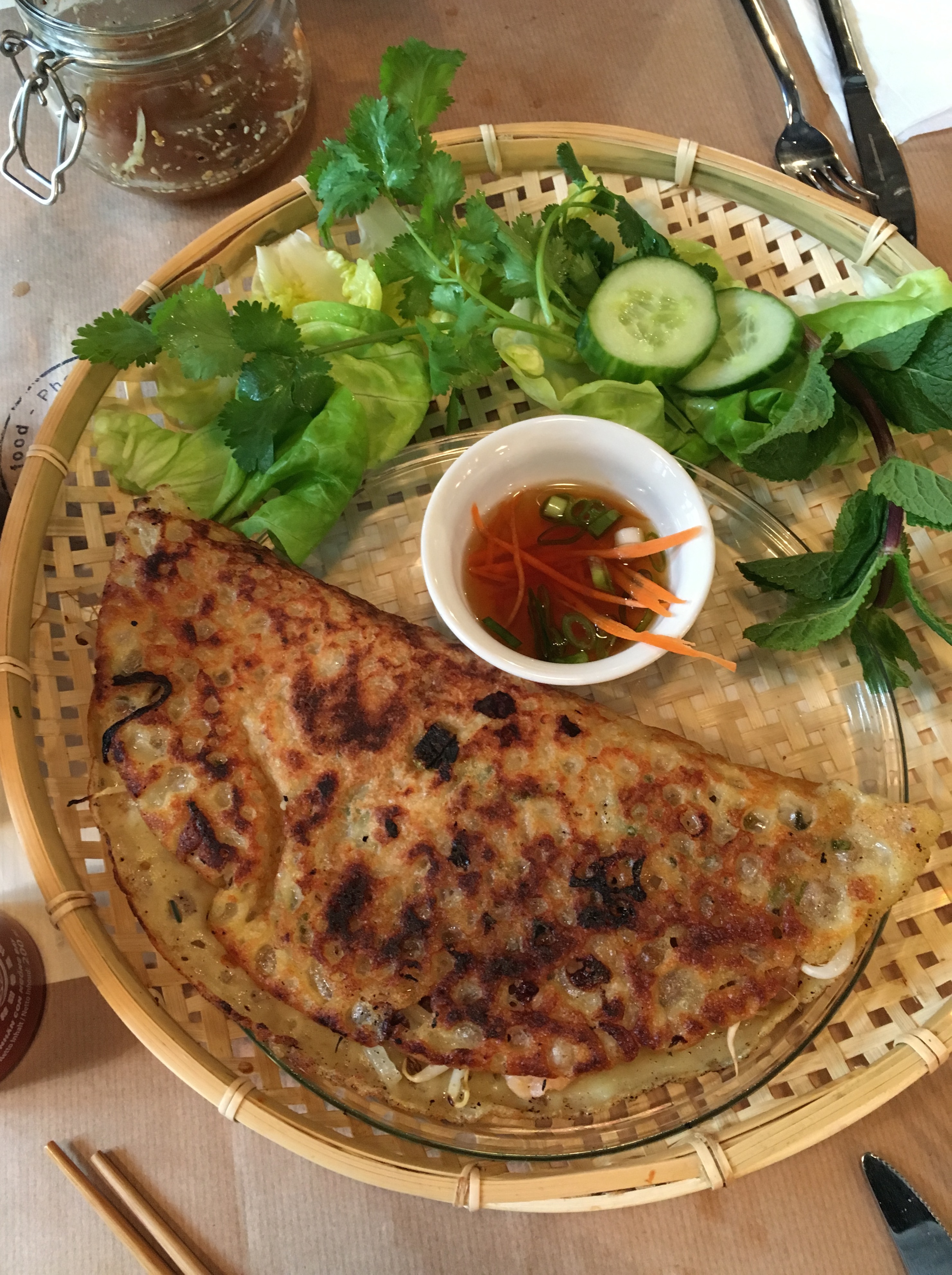 Eigenlijk zijn we al voldaan, alleen staat daar nog een bún gà (’thin rice vermicelli noodles served with lettuce, mint, cucumber, our secret sauce and topping of your choice: chicken’ – € 12,50). De noedels smaken ons, maar voor mij persoonlijk zindert de pannenkoek vooral na.