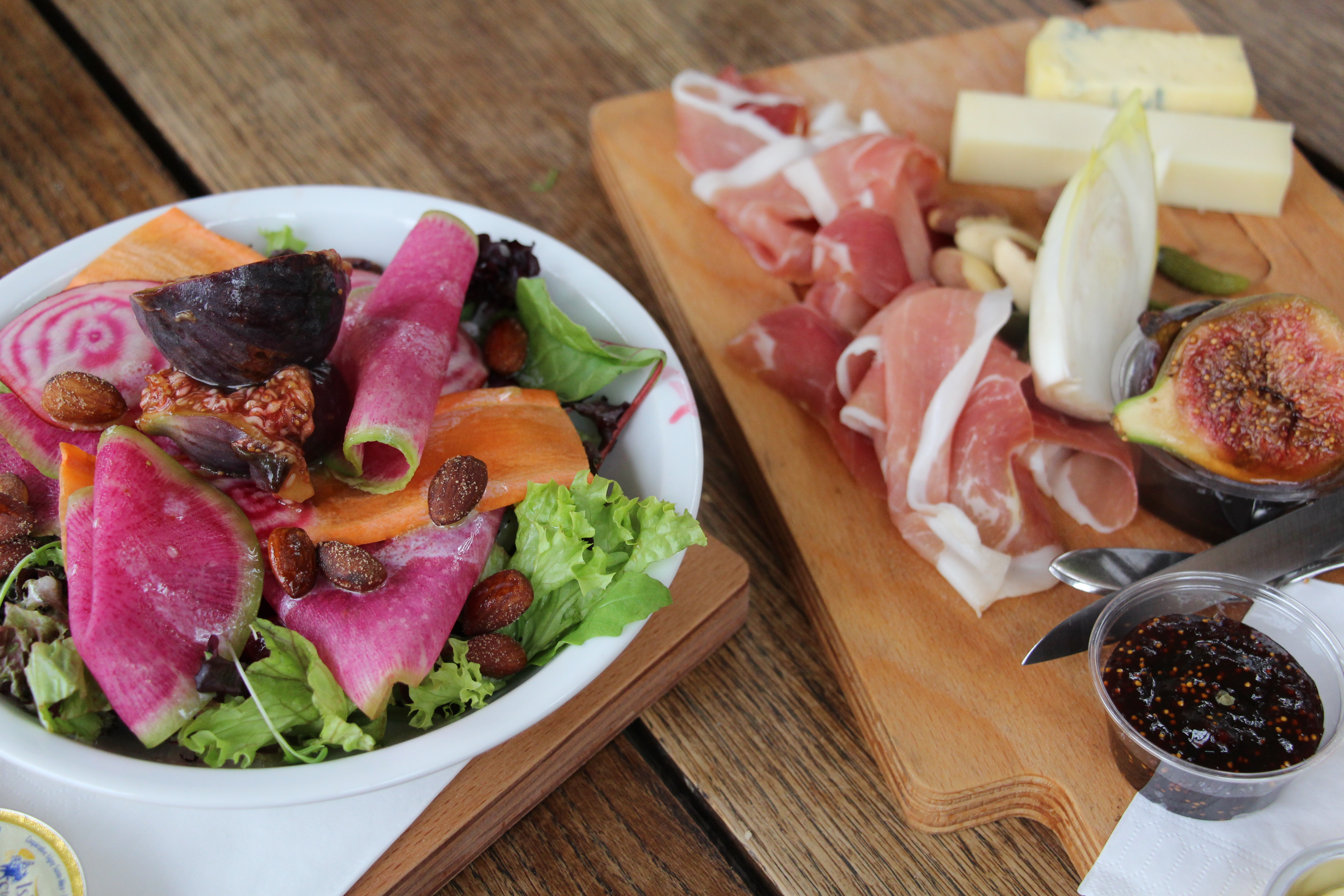 Eerst over die leuke plank met twee soorten kaas, gerookte ham, nootjes, augurkjes, witloof, port-vijgenjam, twee broodjes en boter. Gezellig eten, daar bestaat geen twijfel over! De salade van parelgort (een graansoort, eigenlijk gerst) oogt bijzonder kleurrijk en stemt mij dus al vóór het proeven goedgezind. Op de graantjes liggen verschillende groene slasoorten, partjes rode biet, plakjes wortel en enkele visueel mooie bietensoorten (Chioggia en een soort die eruitziet als watermeloen), amandelnoten en verse vijgen. Wat mij betreft de perfecte lunch! En dan moet de Flammkuchen nog komen.