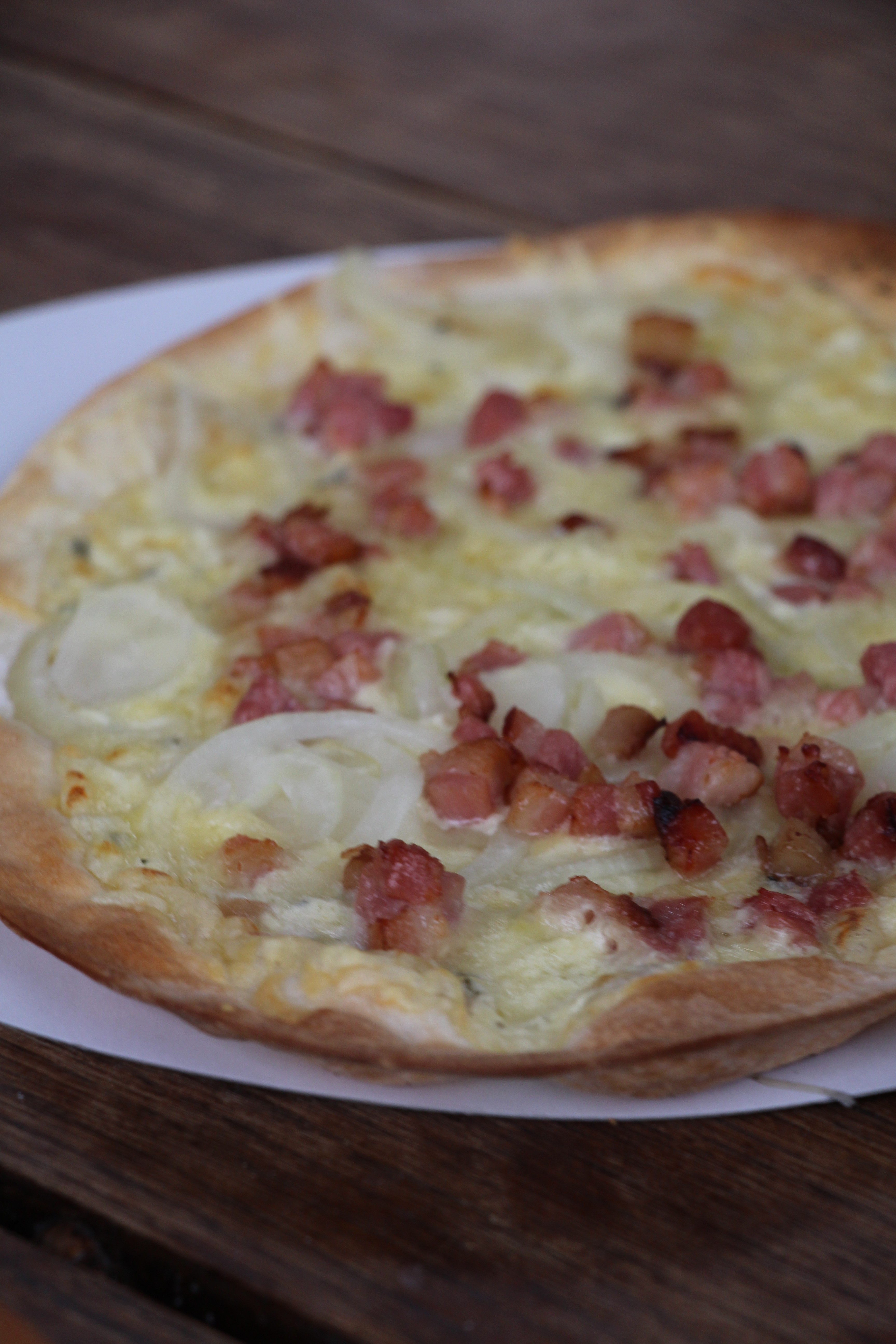Ja, ik voel meer voor witte dan voor rode pizza. Ik kan het feit dat ze steeds meer opduiken dan ook alleen maar toejuichen… Op onze pizza uit de Elzas ligt crème fraîche, gerookt spek, Gruyère, Comté, Emmentaler, zoete witte ui. Mijn wederhelft snijdt hem in acht stukken en mijn eerste gedachte is “I WANNA EAT THEM ALL!”. Toch delen we ook hier broederlijk en even twijfelen we zelfs om nog een exemplaar te bestellen.