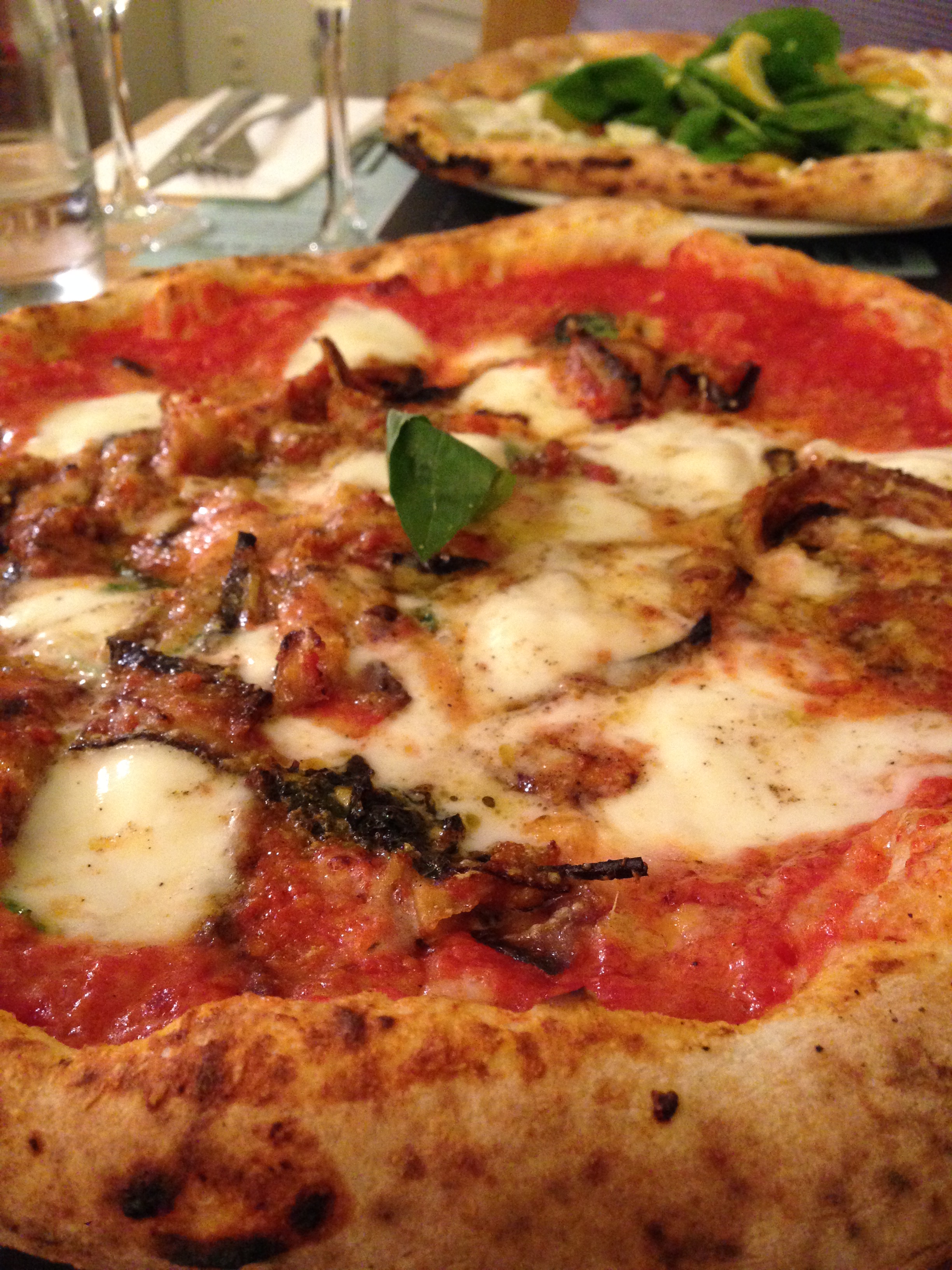 De veggiepizza valt evenzeer in de smaak. Wat is aubergine toch een dankbare groente voor vegetariërs, zeker als je ze goed bereidt! Ik vermoed dat de aubergines op voorhand langzaam gegaard en misschien zelfs gemarineerd zijn, want ze hebben te veel smaak om snel even in een houtoven klaargemaakt te zijn. We werken af met pikante olie en smullen.