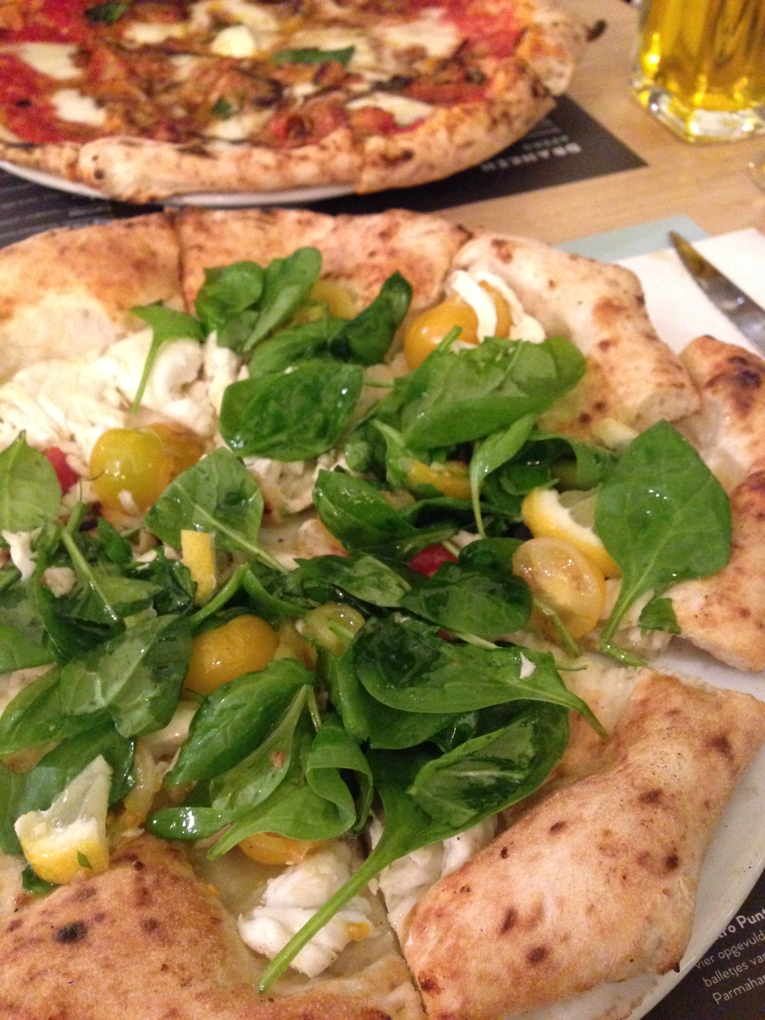 Bij Bellini eet je pizza met een dikke opgeblazen (niet slecht bedoeld) korst, alleen blijkt de bodem tijdens het eten iets te slap uit te vallen. En hiermee rond ik mijn rondje minpunten meteen al af… Dit moeten we nog eens overdoen bij terrasjesweer!
