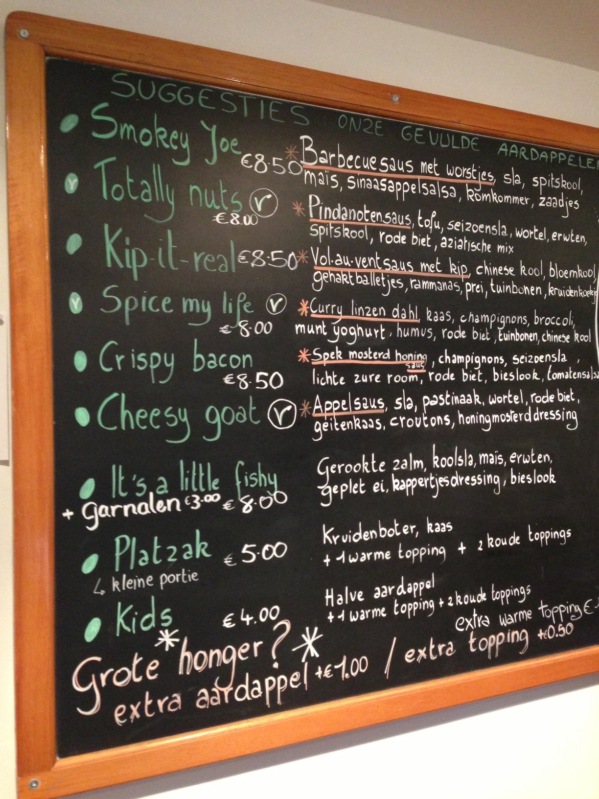 Hoe werkt het? Ofwel kies je voor ‘goodness in 4 steps’: 1) aardappel + 2) look- of kruidenboter + 3) saus + 4) groenten en toppings. Ofwel opteer je voor één van de welbenoemde suggesties. Ik twijfel lang tussen de ‘Kip-it-real’ en de ‘Spice my life’, maar ga uiteindelijk voor de laatste en vegetarische patat. Mijn vriend bestelt ‘It’s a little fishy’. Alle aardappelen kosten € 8 – behalve die met vlees € 8,50 wegens de hoge vleesprijs (opnieuw op een briefje vermeld). Ze houden trouwens ook rekening met iets minder of meer: een extra aardappel kost € 1, de suggestie ‘Platzak’ slechts € 5.