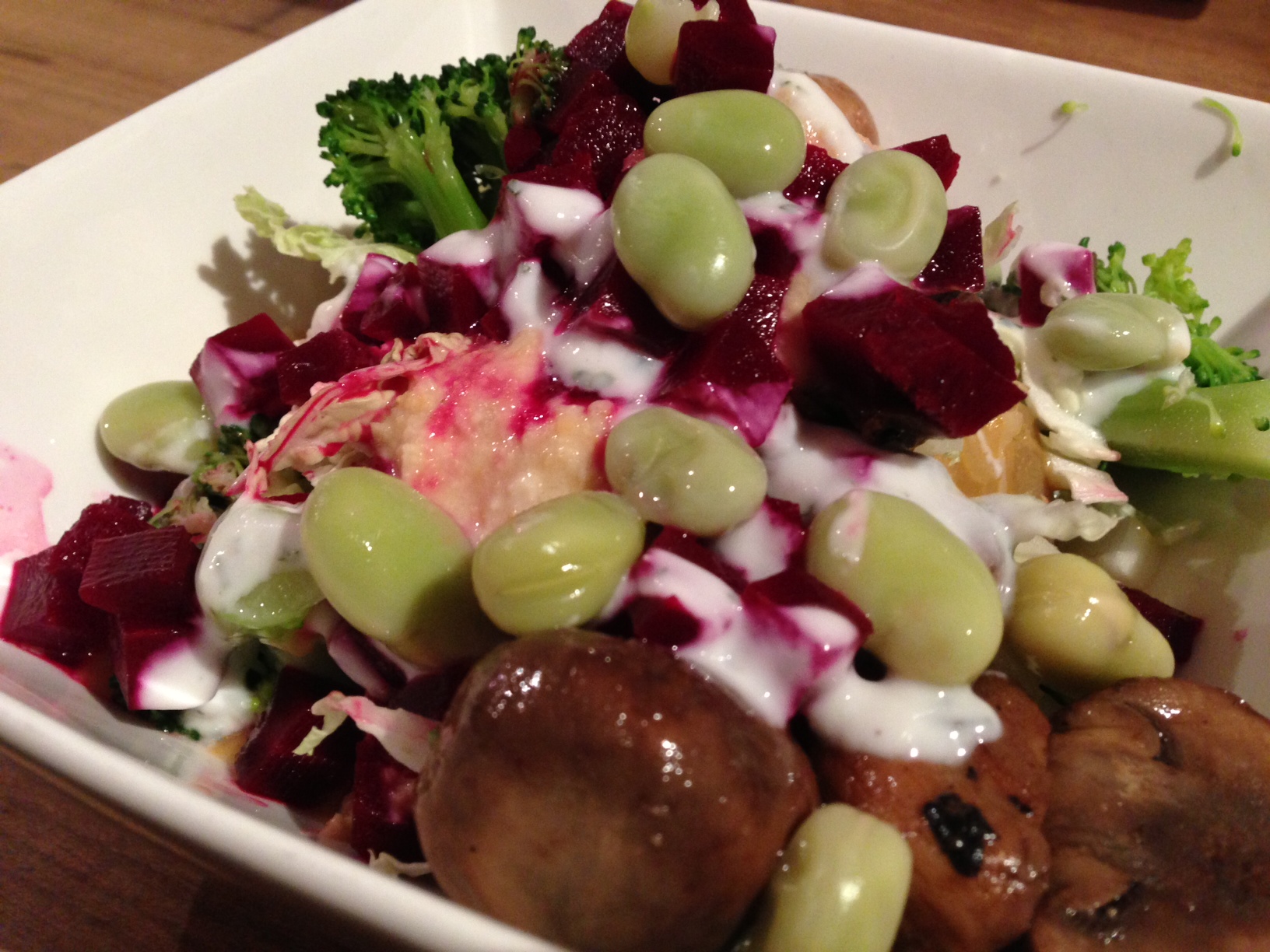 Voor ons staat een vierkant diep bord met daarin een dampende aardappel en een behoorlijke hoop vanalles. In mijn geval is dat Indische dahl (linzencurry), kaas, broccoli, champignons, tuinbonen, muntyoghurt, humus, rode biet en Chinese kool. En in het geval van de overkant gerookte zalm, koolsla, maïs, erwten, geplet ei, kappertjesdressing en bieslook. Eenvoudig concept, maar het werkt absoluut. De stevigheid van de aardappel zorgt voor een goedgevulde maag bij het lege bord, de groenten dan weer voor een onopgeblazen gevoel. Perfecte balans, voor zowel ’s middags als ’s avonds.
