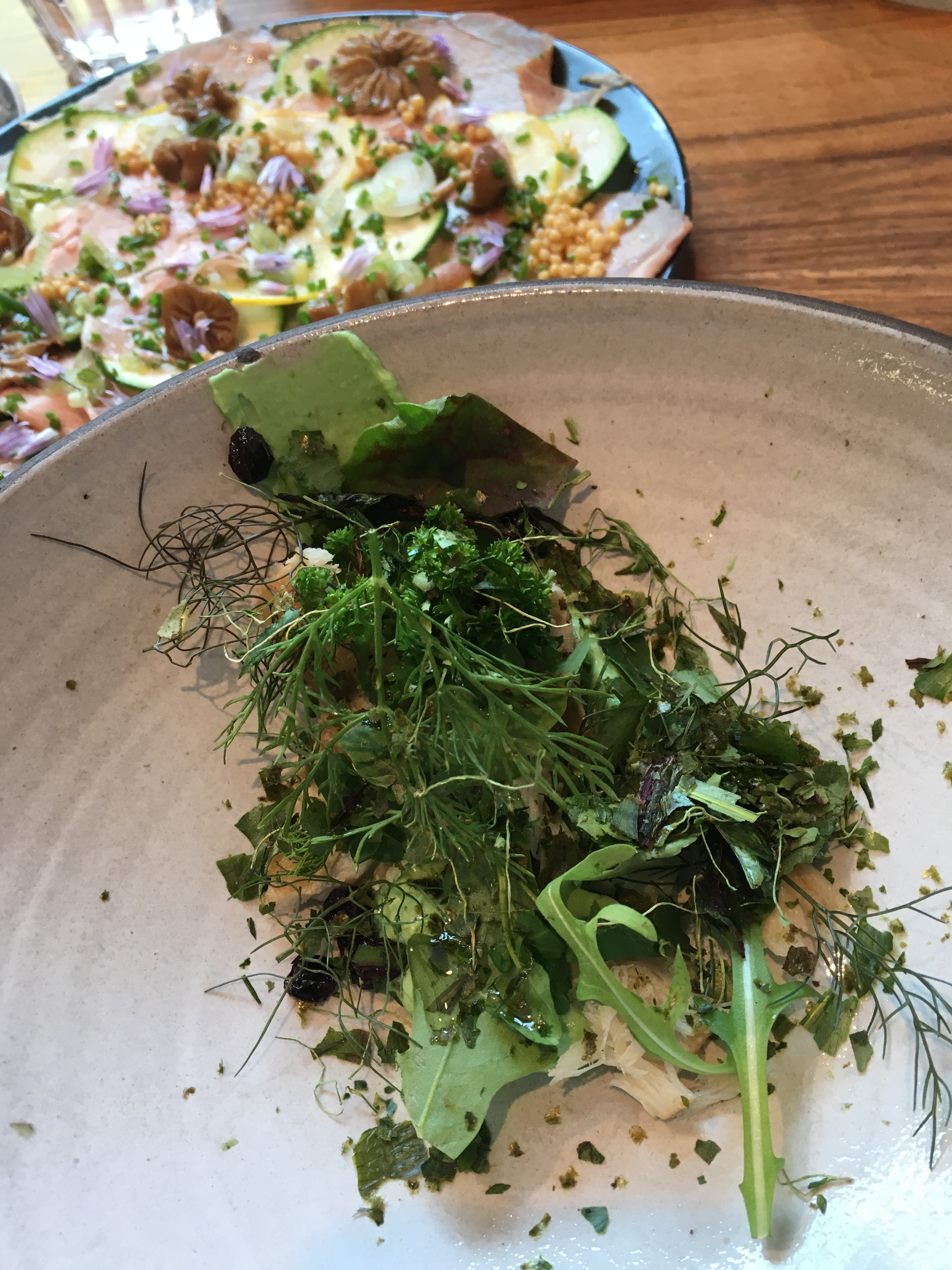 Jullie merken het, twee plaatjes. En meteen valt de evolutie op ten opzichte van mijn eerste bezoek: team Publiek is overduidelijk on a roll. Die mousserons moest ik even googlen, het blijken de paddenstoelen te zijn – altijd fijn om mijn culinaire woordenschat uit te breiden… Moeilijk om het lekkerste hapje aan te wijzen: ik neig naar de makreel, mijn vriendin blijkt nogal wild van de courgette- en varkenscarpaccio.