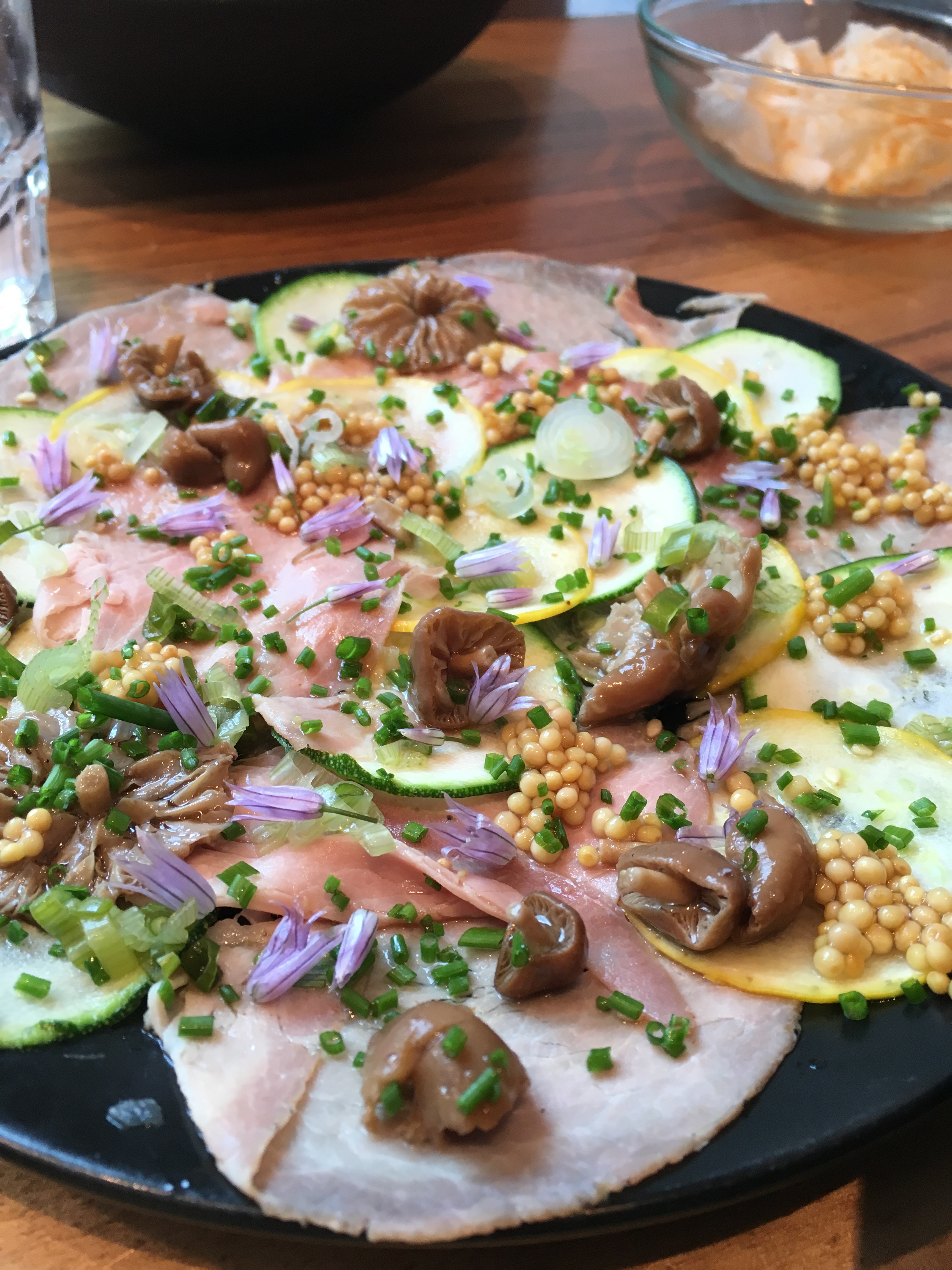 Ondertussen stel ik voor om de lunch met het extra voorgerecht (€ 28 + € 10) te bestellen. We zijn hier tenslotte om een verjaardag te vieren én ik ben ook wel benieuwd naar die gedroogde entrecôte. Dat is dan beslist!