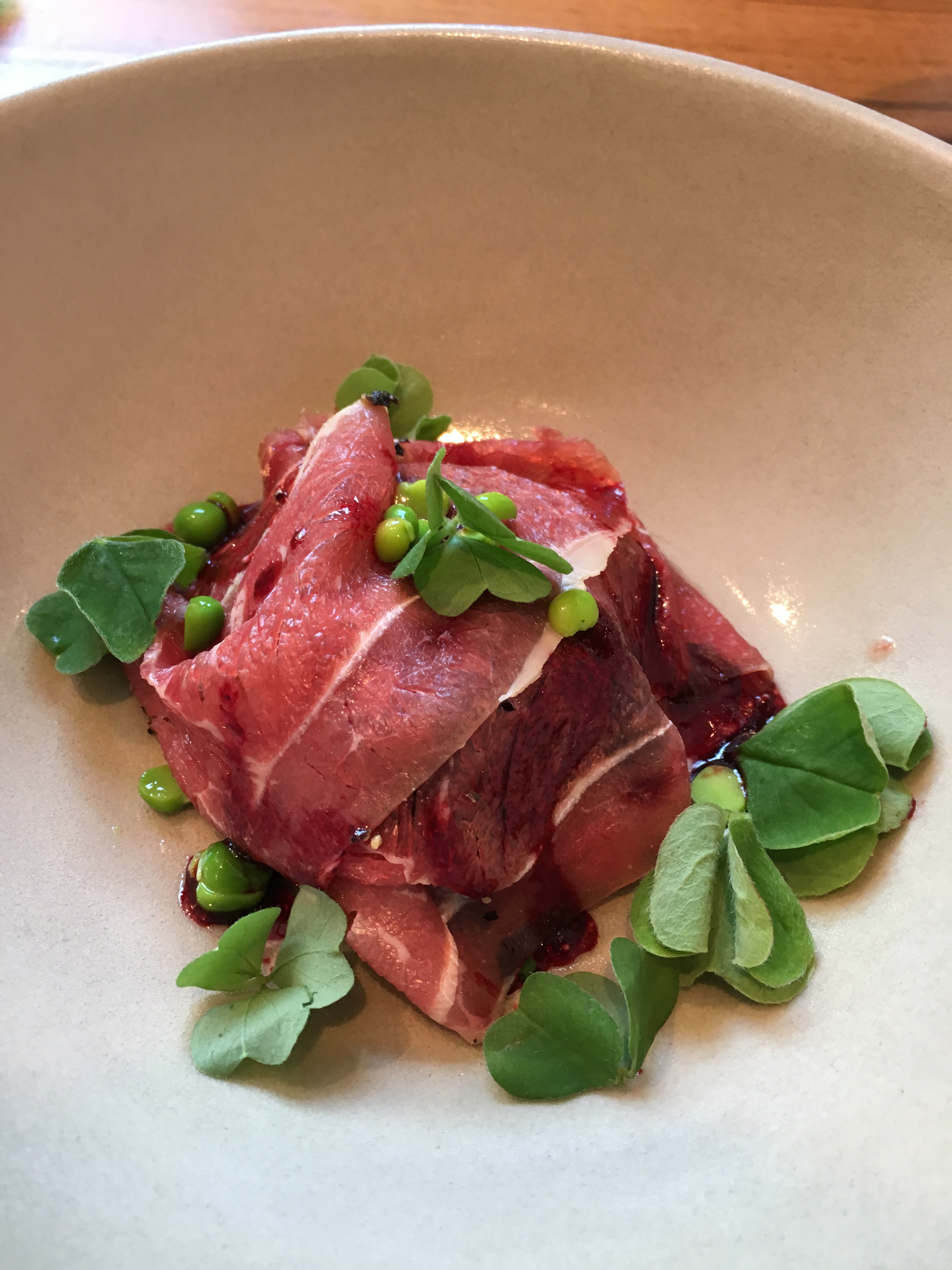De gedroogde en gezouten entrecôte van Limousinrund, rode biet, doperwtjes ziet er alvast beeldig uit met dat klaverkruid – niet 100% zeker of dit de juiste naam is. Onder het rund schuilt het meest verrukkelijke onderdeel van dit gerecht: onderaan een crème van rode biet met daarop in de oven gegaarde rode biet. Die diepe smaakt treft mij en doet mij alvast vermoeden dat dit wel eens mijn favoriet van de dag zou kunnen worden.