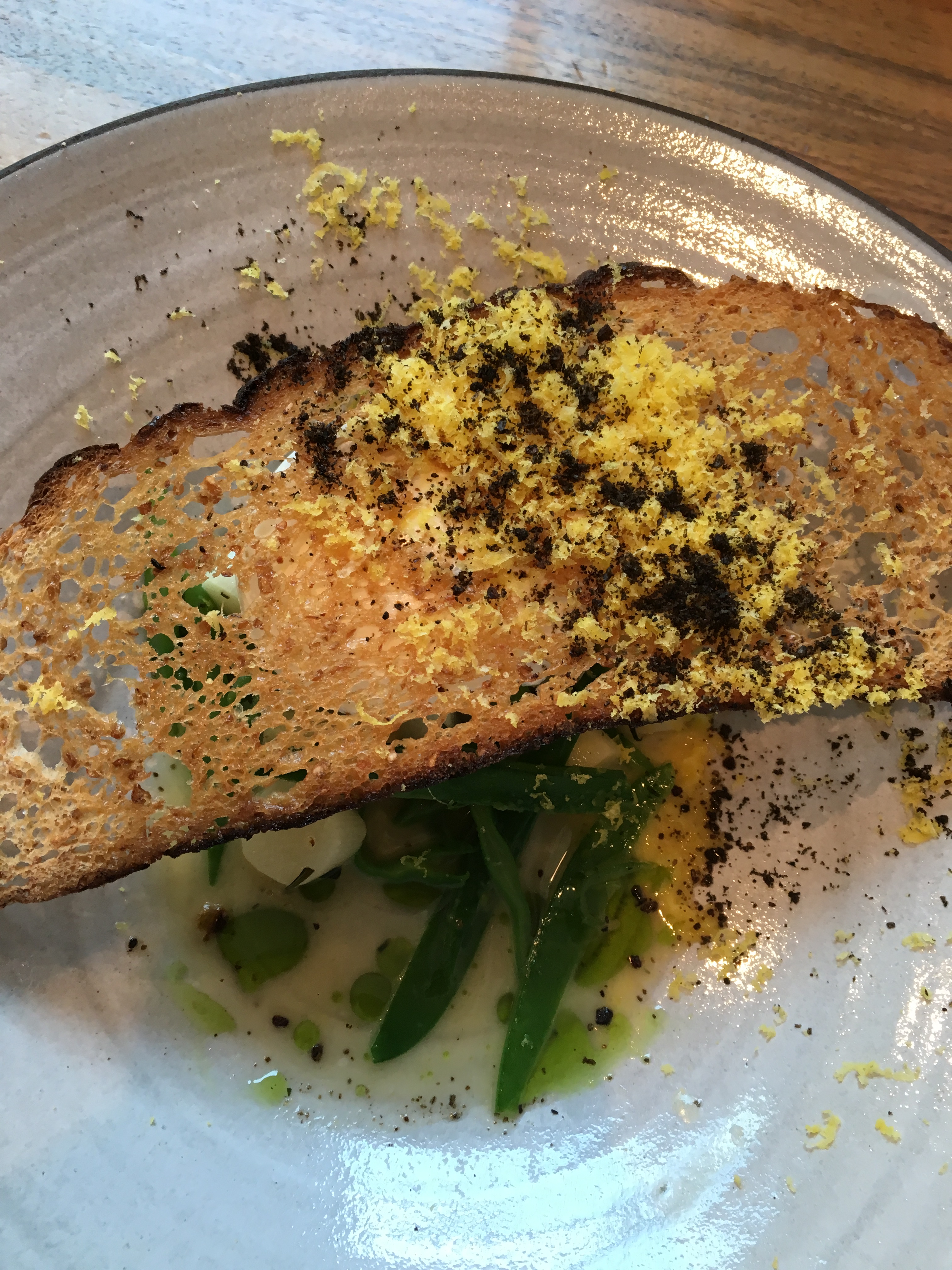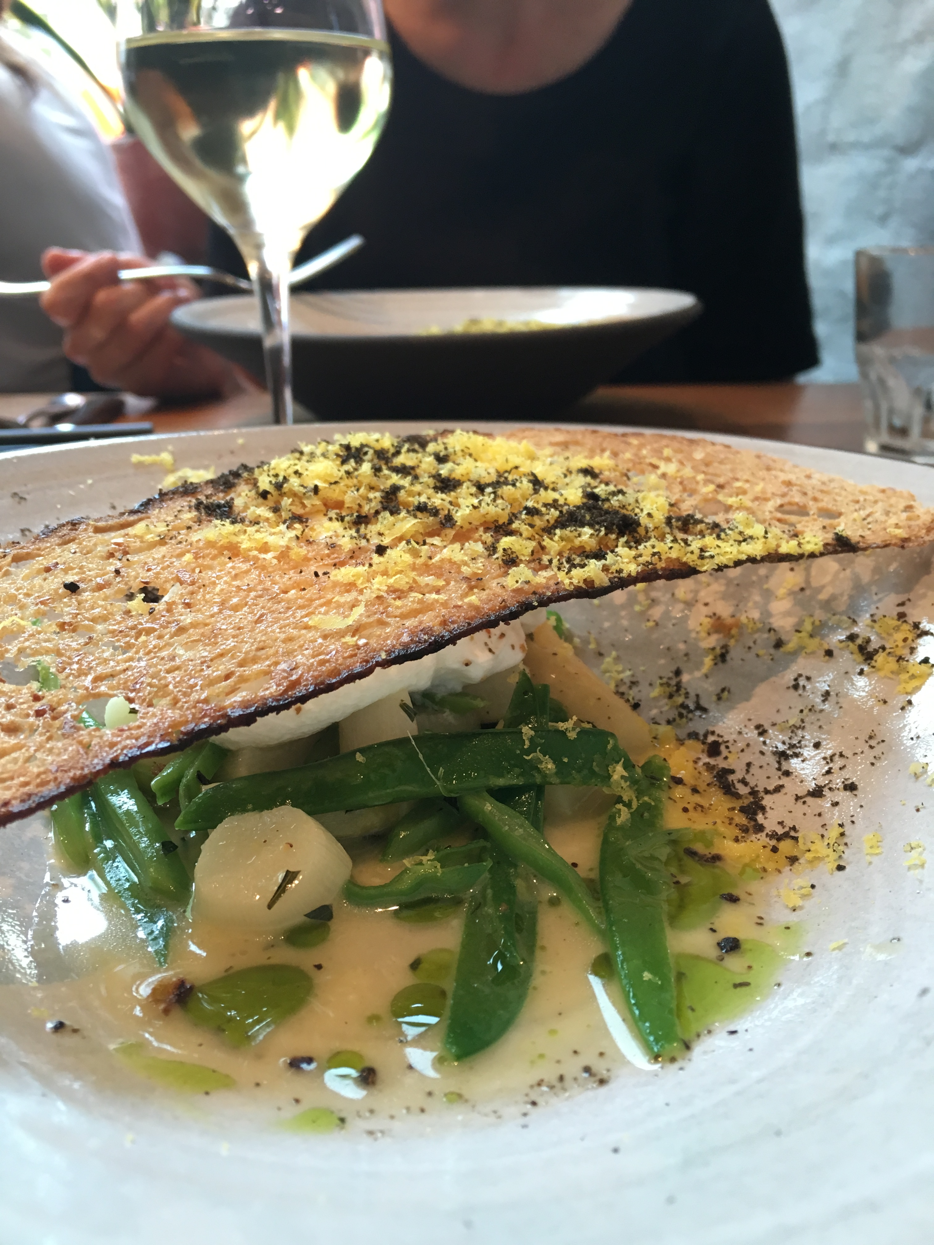 De volgende gang bestaat uit gepocheerd hoeve-ei, witte asperge, boontjes en daslook en springt meteen in het oog door de opvallende presentatie met een flinterdun sneetje getoast brood als dakbedekking. Gerechten die je kunt catalogeren onder de noemer ‘ode aan een ei’ doen het doorgaans goed bij mij. Ook hier geniet ik, alleen blijft mijn superenthousiasme over de vorige gang nog wat nazinderen.