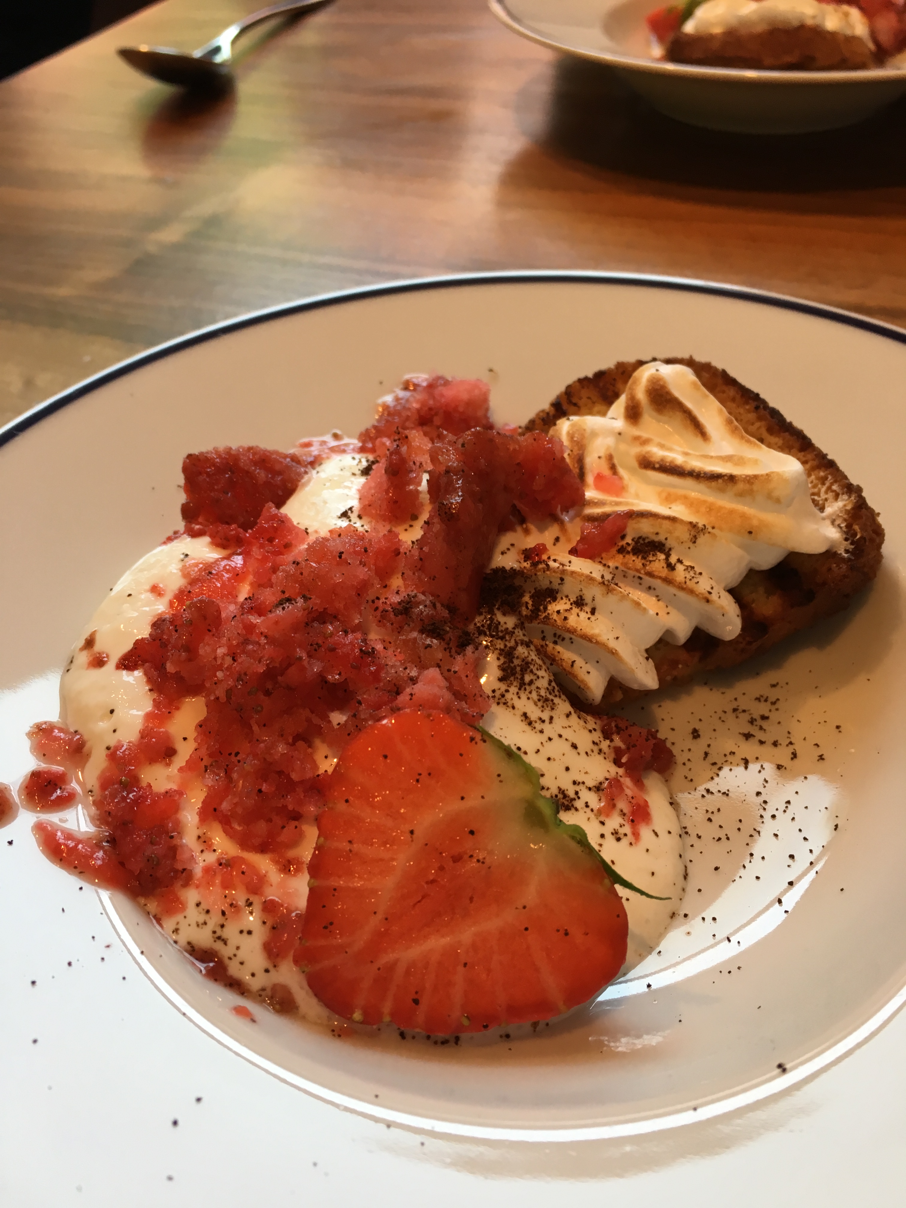 Intussen loopt onze verjaardagslunch naar z’n einde. Wanneer de kaas-of-dessert-vraag gesteld wordt, weet ik wat mijn vriendin zal antwoorden – namelijk ‘Gegrilde cheesecake, bittere citroen, bevroren aardbei graag!’. Ik volg, maar als niet-dessertmens voel ik achteraf toch een tikkeltje spijt… Het nagerecht met ondermeer cheesecake kan mij niet echt bekoren, wat mij betreft zou ieder restaurant een hartig én een zoet menu mogen hebben. Deels zoals bij Veranda in Antwerpen: twee voorgerechten, één hoofdgerecht en geen dessert. En goed, misschien dan voor de zoetekauwen ook een variant met één hoofdgerecht en twee desserts.