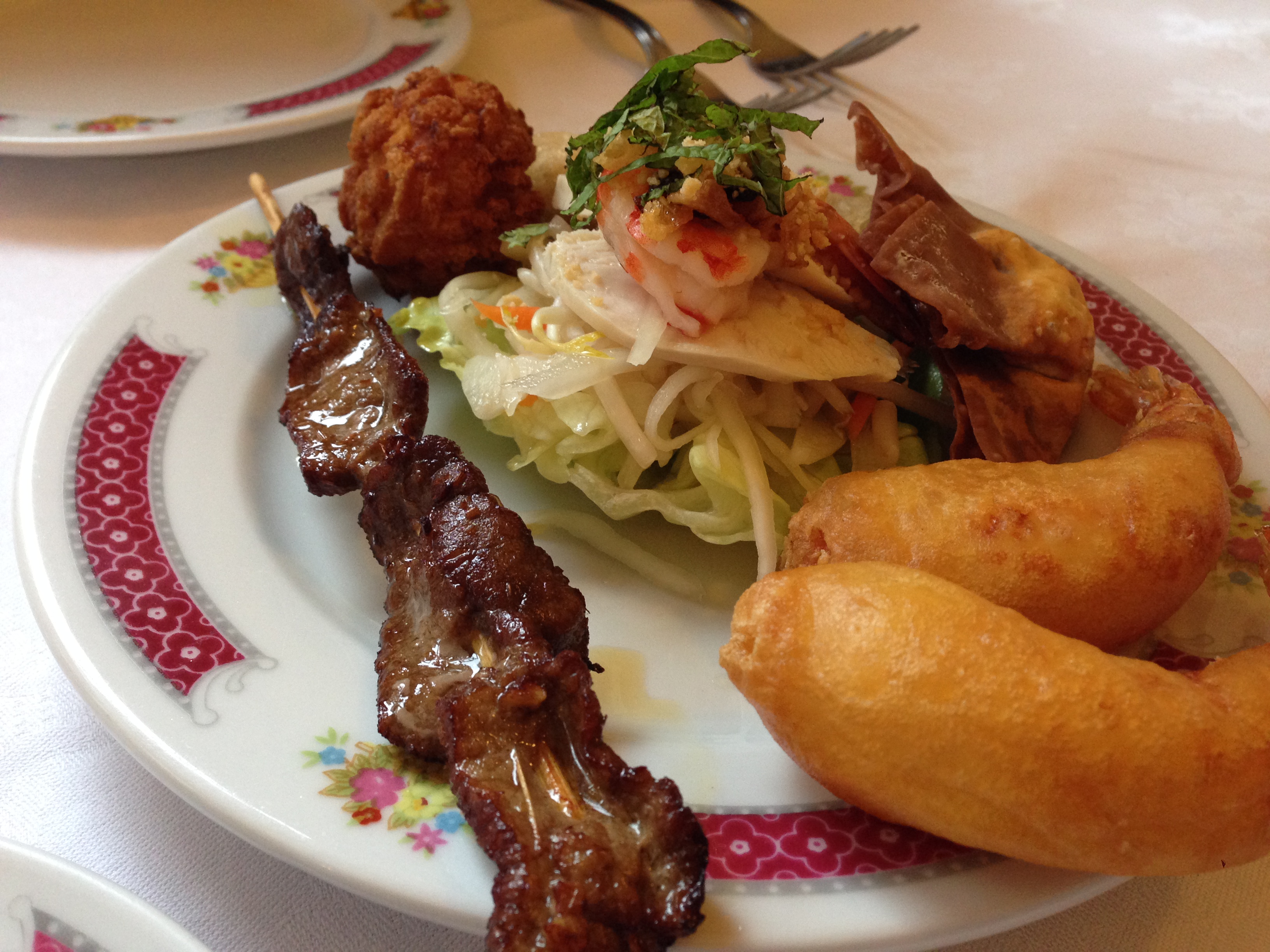 Even later kunnen we de tweede – in de veronderstelling dat de kroepoek voor de eerste was – honger stillen. Op zo’n typisch Aziatisch bordje uit de jaren negentig ligt in het midden een fris mini-slaatje met kip en scampi. Daarrond verder een rundbrochette en nogal wat gefrituurds (scampi, loempia, driehoekige flap, kroket). Stuk voor stuk smakelijke starters, al stimuleert te veel frituurvet mijn humeur niet.
