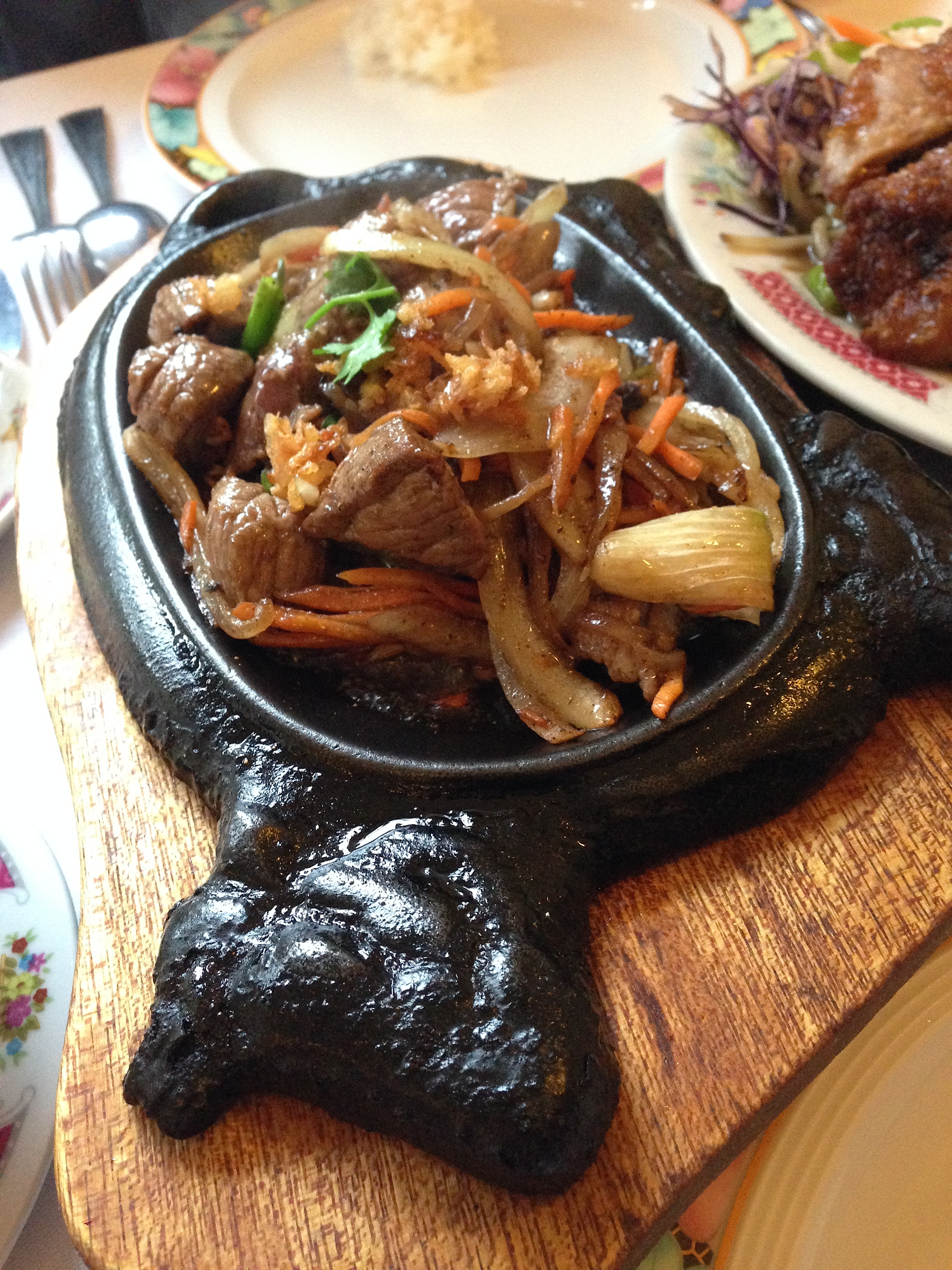 Eerst proef ik de gebakken eend: krokant vel, mals vlees, gewokte groenten (waaronder sojascheuten en witte kool) als bed voor de vogel. Niet mijn beste Aziatische eend ooit, maar best te pruimen als je de prijs tegen de kwaliteit afzet. Ik eet een deel van het vel en het onderliggende vet op, maar na een tijdje kan ik dat niet meer aan en zuiver ik het vlees eerst helemaal vooraleer het te consumeren. Over het rund met z’n vijf smaken valt weinig op te tekenen: na het sissen blijft uiteindelijk een eenvoudig lekker gerecht over.