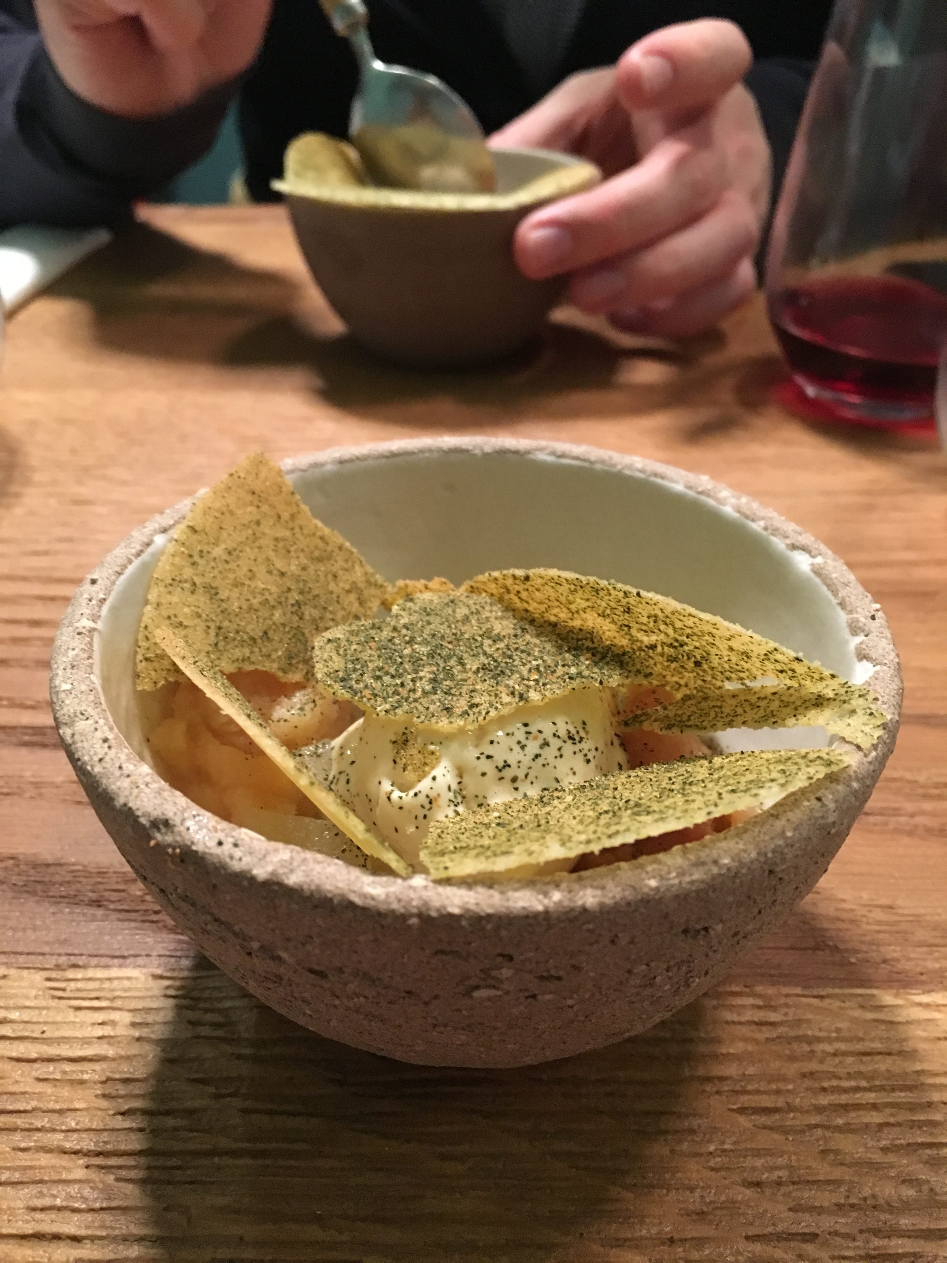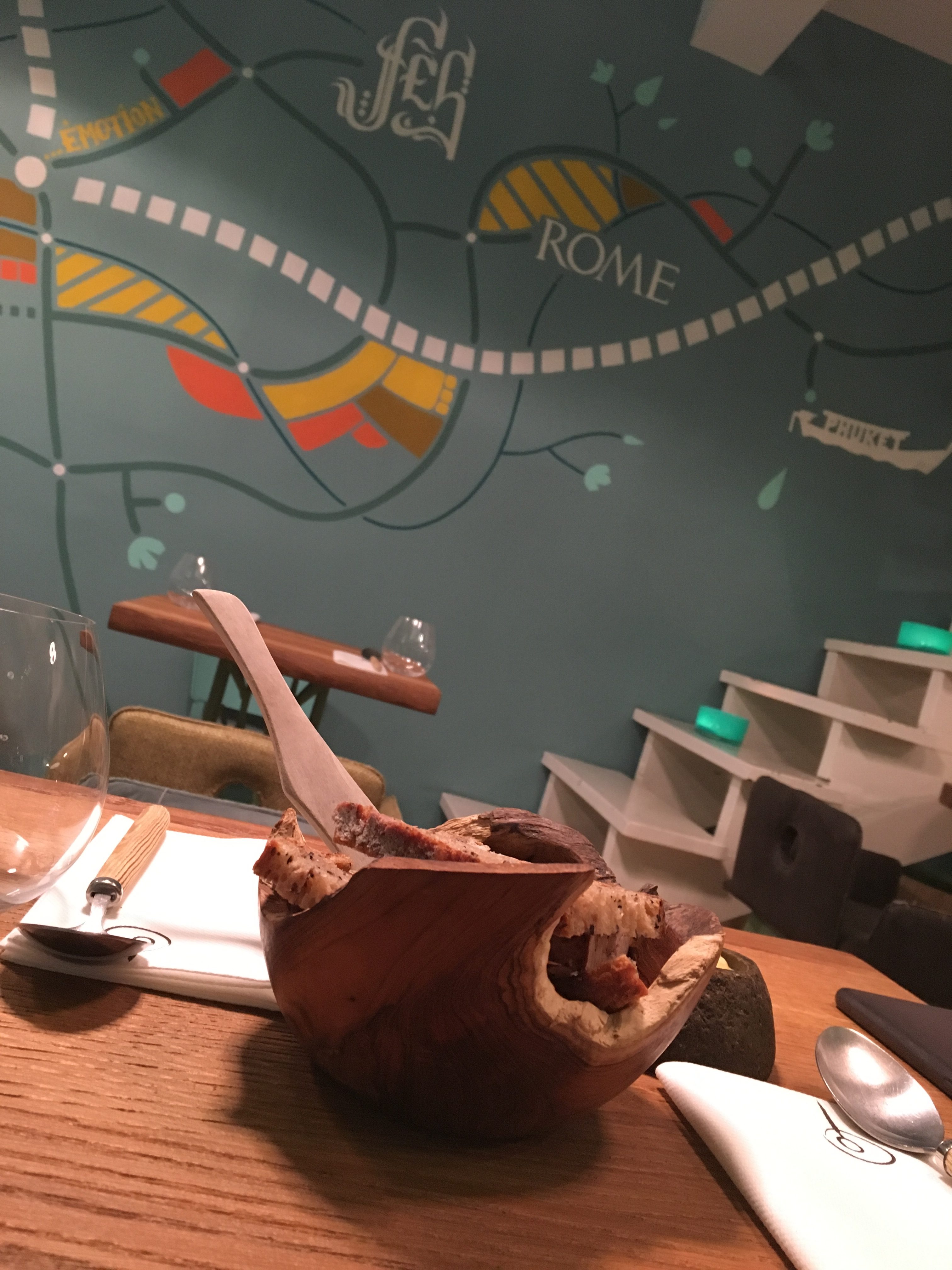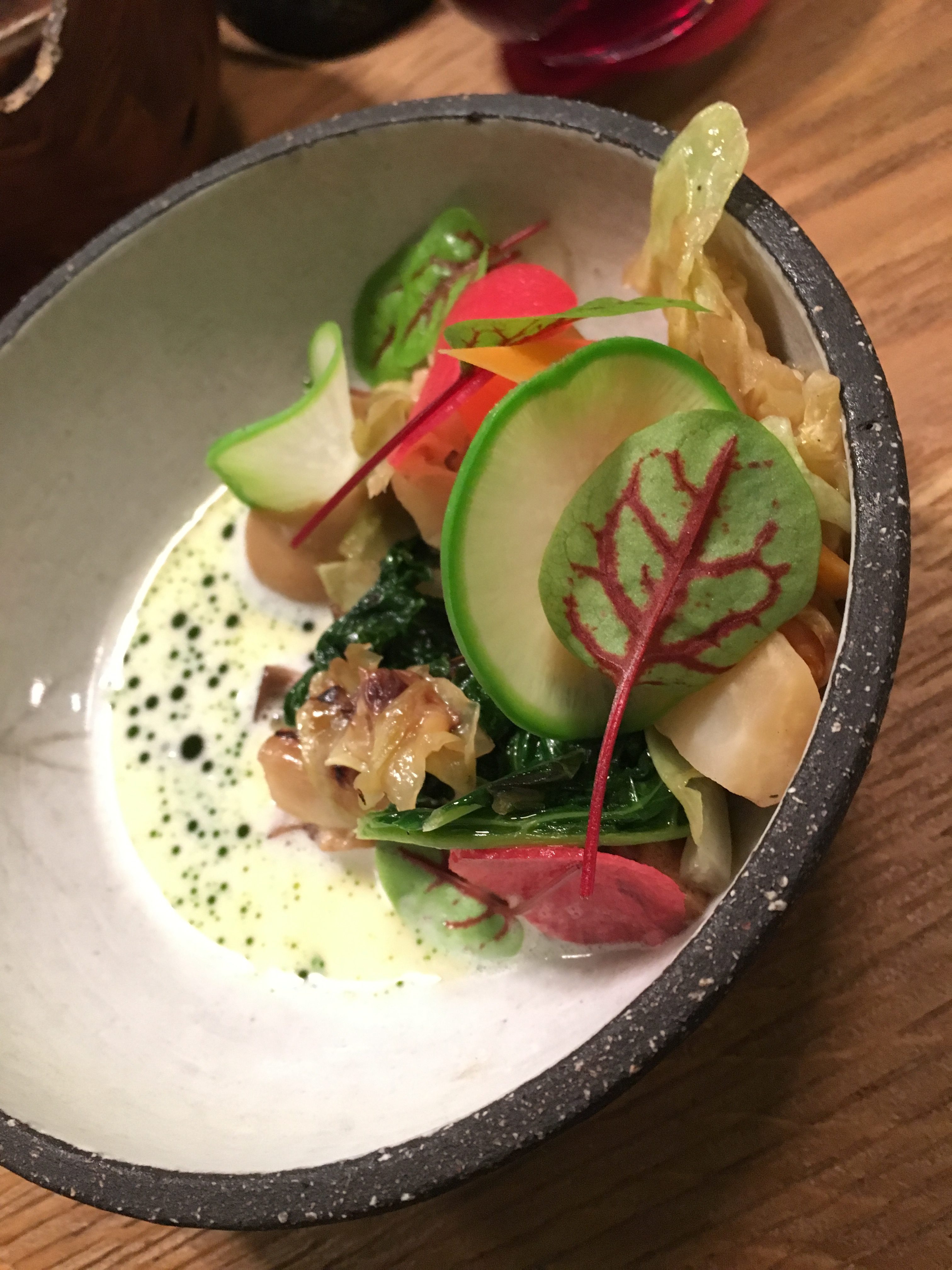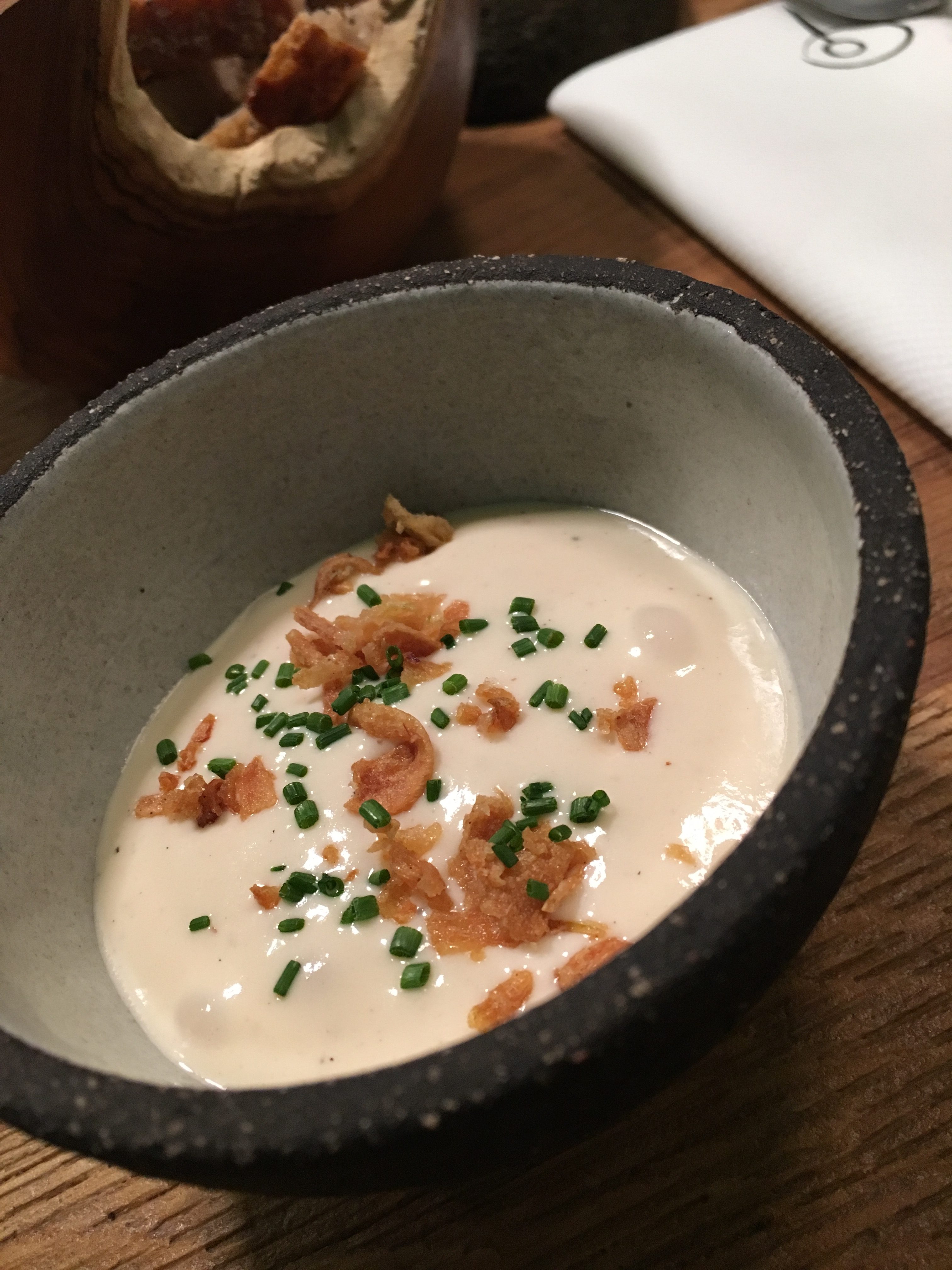 Wederom gebruik ik de zinnen van de chef zelf, omdat ik het niet beter kan verwoorden: ‘SAN is de versmelting van onze hang naar eenvoud, onze reizen die ons de ogen openen voor een pluriculturele keuken en onze creativiteit, een erfenis van L’air du temps.’ Het concept? Alles geserveerd in kommetjes, allemaal op te lepelen met één enkel bestek.