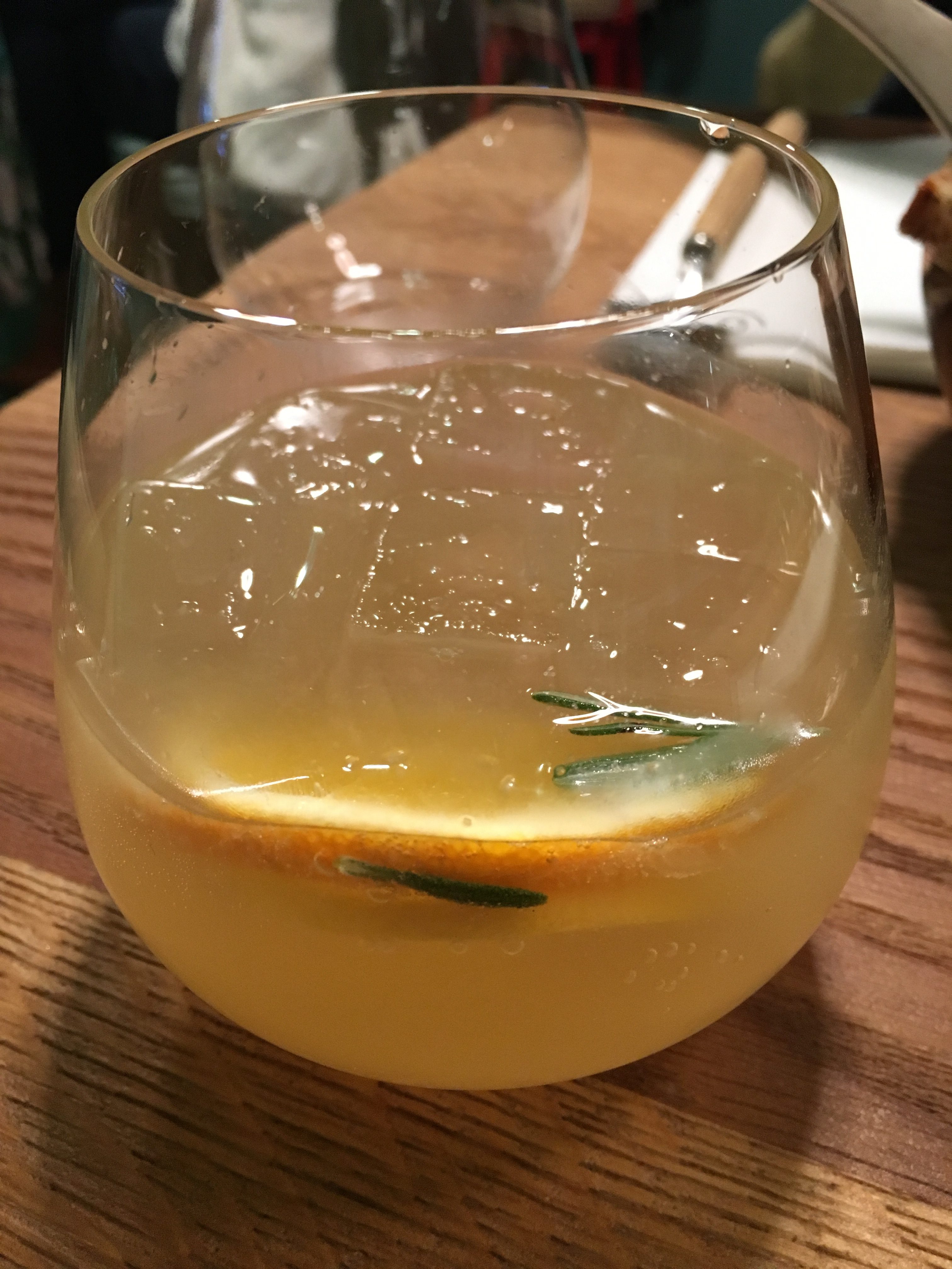 De overkant wil graag één van de speciale biertjes proeven (naam vergeten), ik vraag de aperitief van het huis met onder andere vermouth en rozemarijn. Daarbij hoort een eerste mini-bowl waarvan ik mij vooral de chorizosmaak herinner. Een geslaagde start, eentje met karakter wat mij betreft…