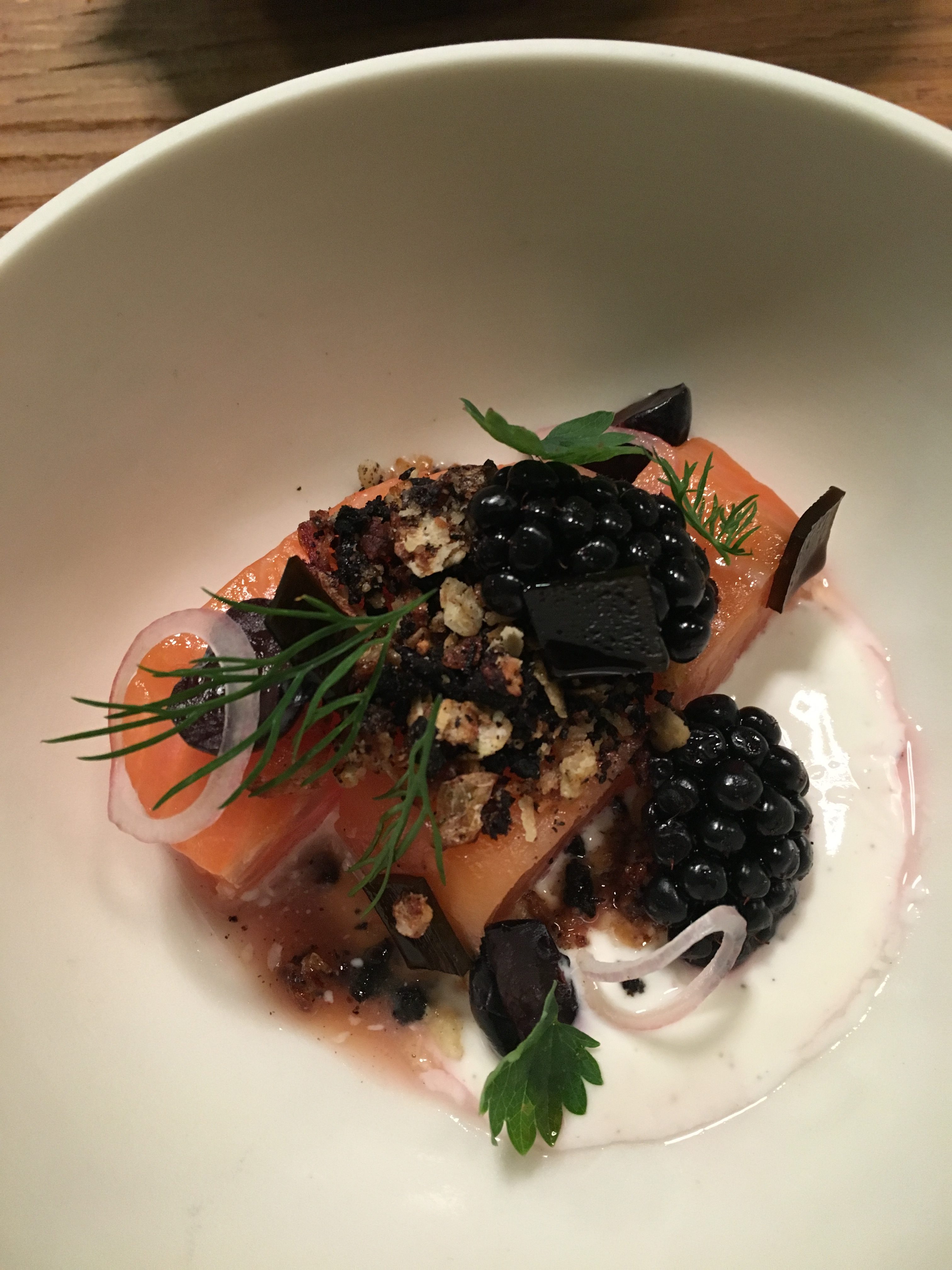 We beginnen in Oslo, met zalm – gepekelde vruchten. Meteen een mooi plaatje en dito smaken die je instant naar Scandinavië katapulteren. Ondertussen selecteerde mijn compagnon een fles rode wijn. Je merkte misschien al dat ik niet zo aandachtig was bij SAN, want ook hier moet ik verdere details verschuldigd blijven. Wel weet ik nog welke onconventionele ‘wijnkoeler’ ze gebruiken: een soort grof gebreide muts, dus misschien gaat het eerder om het warmhouden van de wijn. Grappig!