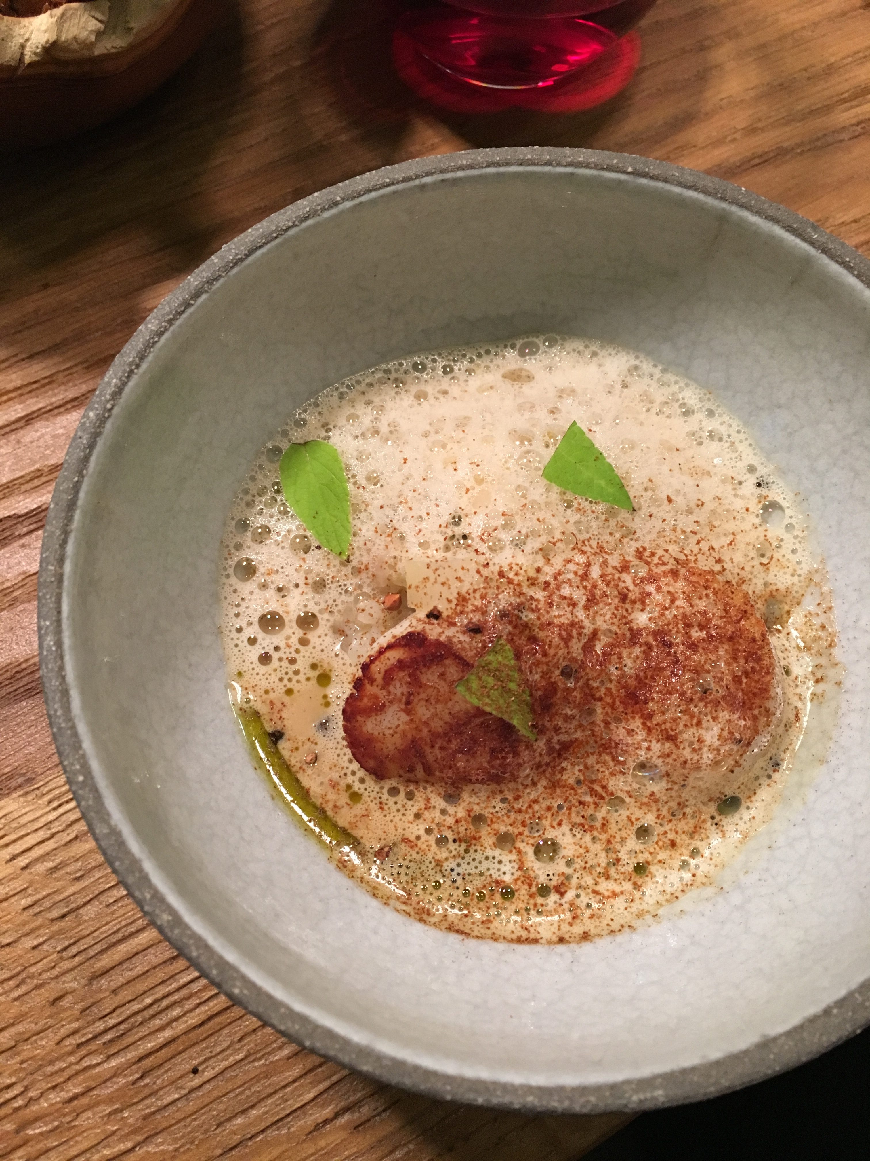 En we vliegen naar Kentucky voor sint-jakobsvrucht – mout – bourbon. Een coquille eten met een lepel lijkt niet evident, toch gaat deze leuke bereiding er vlot in… Vlot, dat is ook het juiste woord voor het serveertempo bij SAN: niet te snel noch te traag, net goed. Dat doet veel aan een eetbeleving! Ze hebben dat natuurlijk iets beter onder controle als er met een vast menu (en dus geen à la carte) gewerkt wordt.