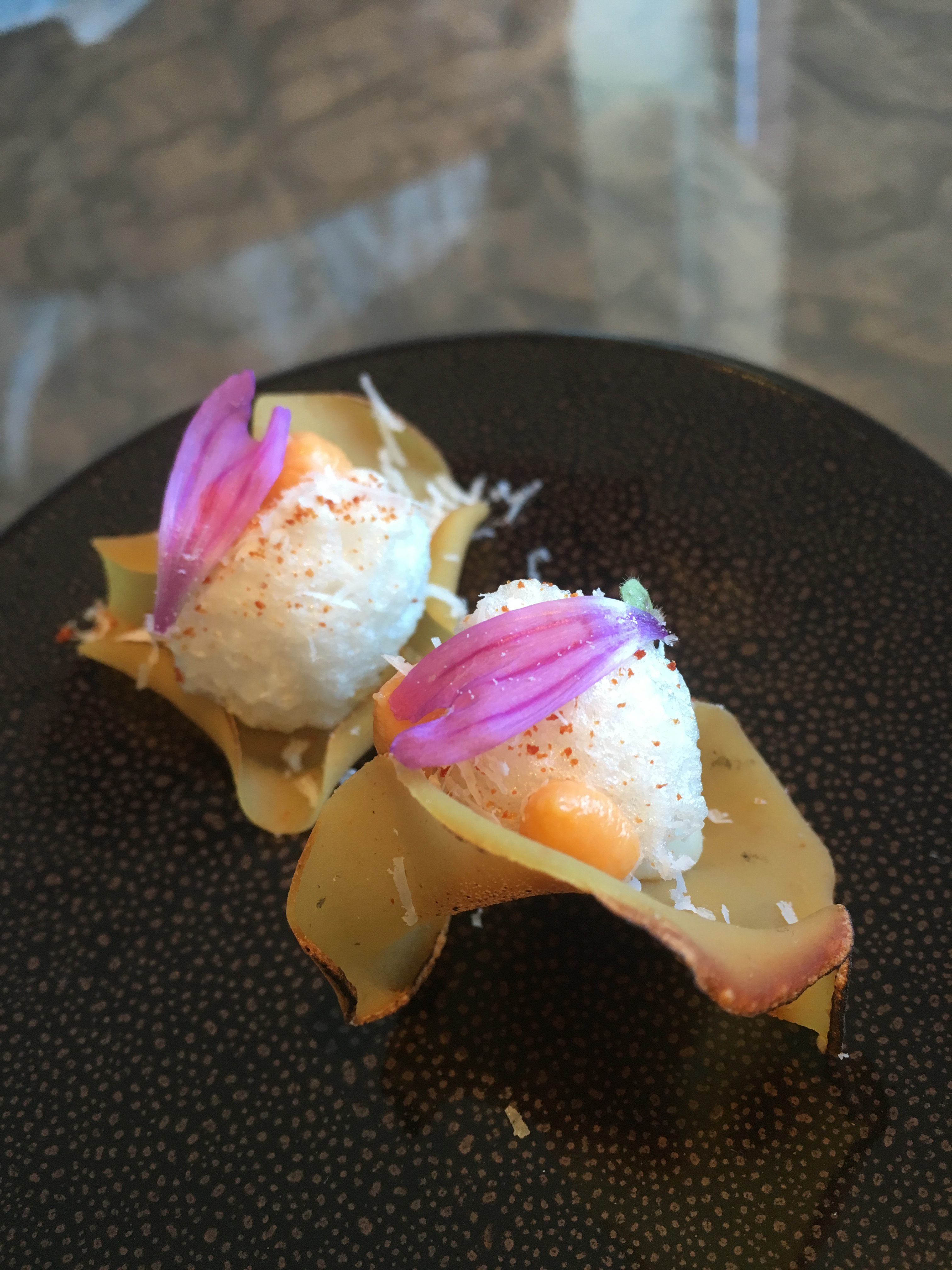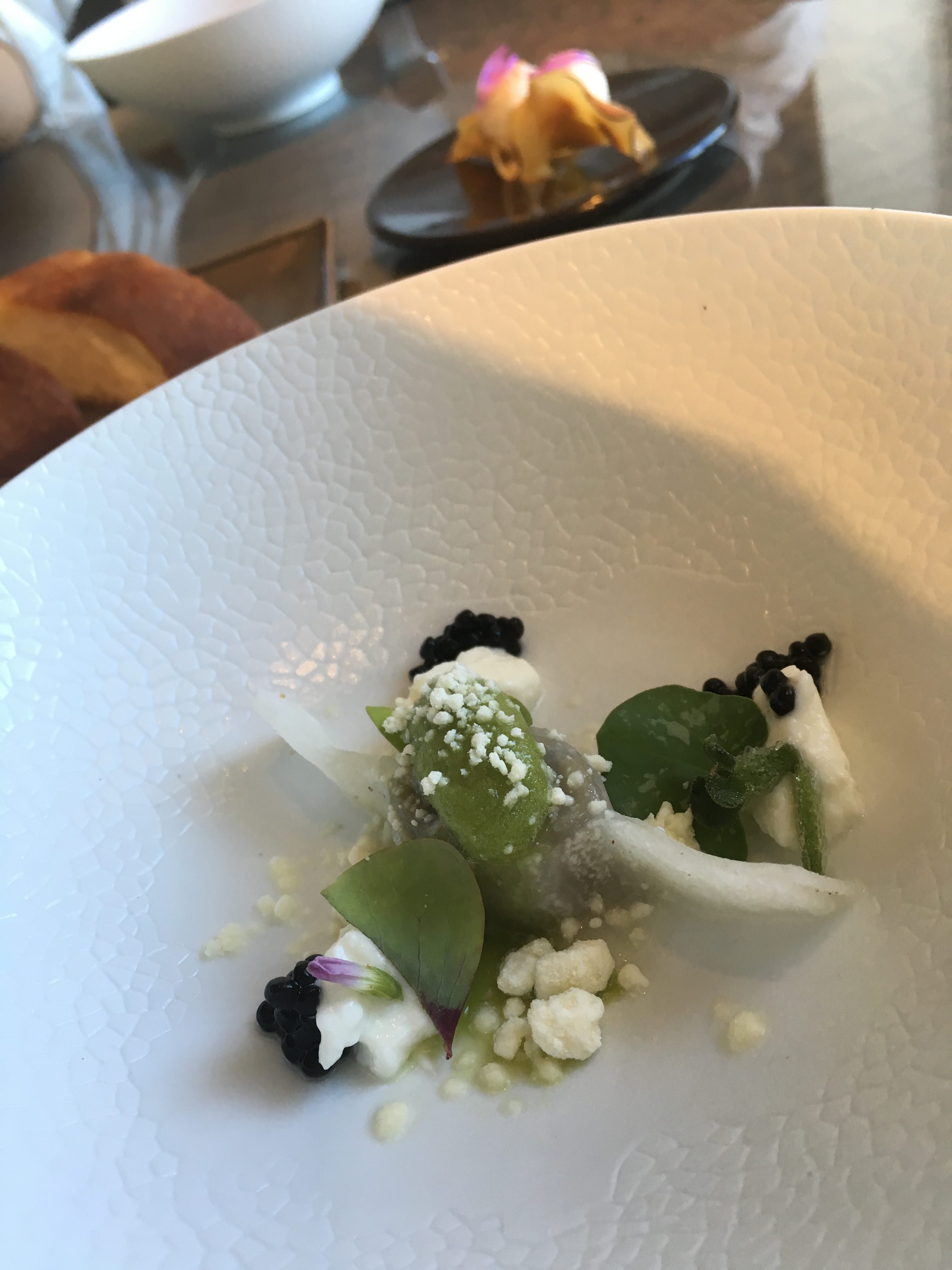 De eerste keuze van de dag laat ik aan de birthday boy (genaamd @gtje) over: een glas champagne van huismerk Ruinart. Enwel, ja! Ik wou net hetzelfde zeggen… Ook de tweede keuze laat ik aan hem over: hij twijfelt niet lang over ‘all the way’ en dat betekent 8 succulente – ik citeer letterlijk de menukaart – bereidingen met aangepaste wijnen (€ 265). Zelf corrigeer ik wel even bij dat laatste, want ik verkies de laatste jaren steevast een BOB-arrangement bij X-gangenmenu’s om op een enigszins heldere manier zo’n culinaire trip door te komen. Geloof me, ik beleefde ooit enkele andere sterrenervaringen waarbij de desserts achteraf niet meer dan een wazige herinnering bleken…