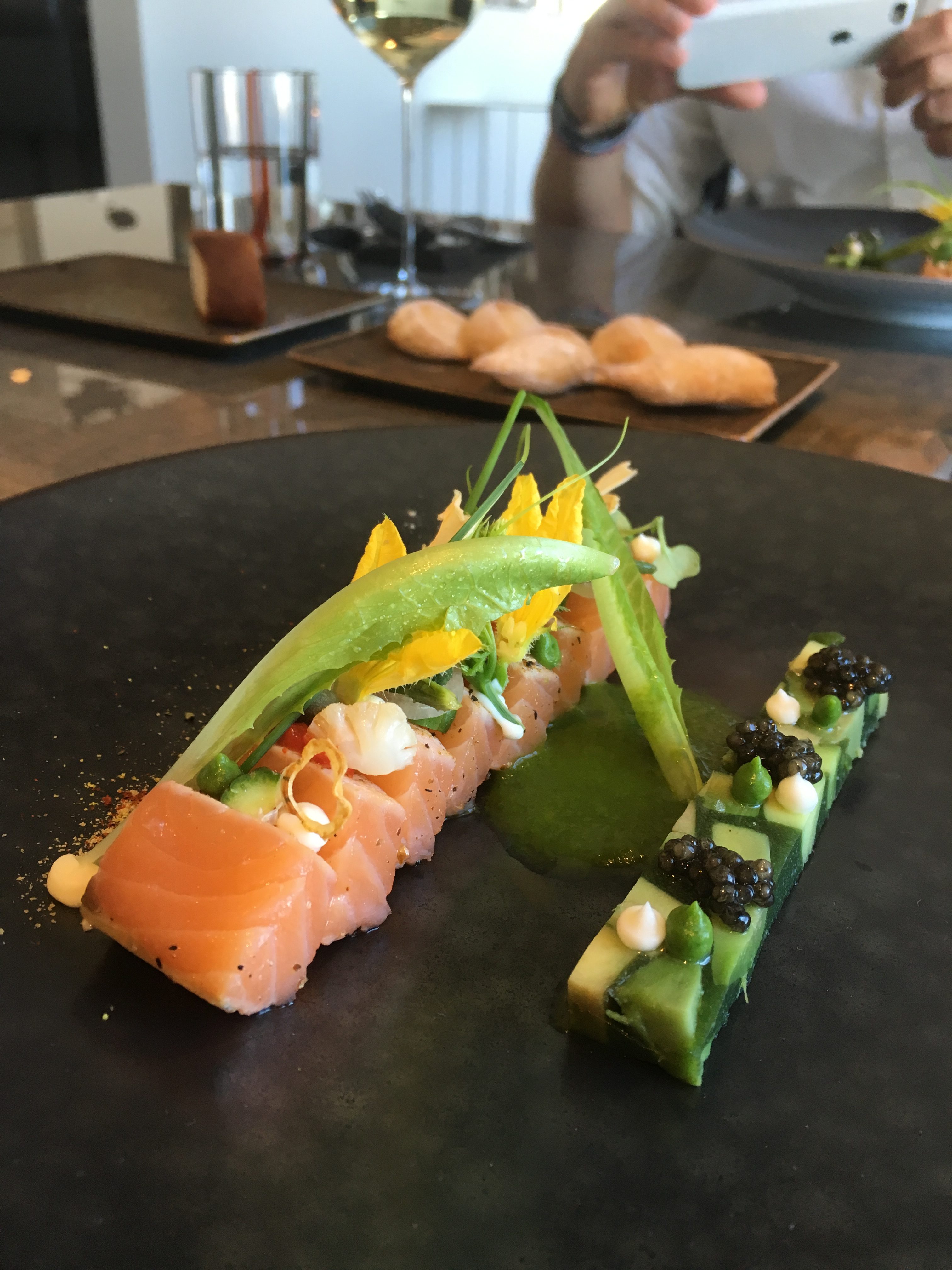 En jawel, de hapjes warmen zoals gezegd op. Bij de eerste gang merk je echter meteen: nu zijn we helemaal vertrokken… Als ik rauwe zalm zie, dan krijgen mijn smaakpapillen het instant lastig om het droog te houden. Jelly zaken ben ik niet meer echt gewoon, en toch charmeert het balkje van tuinkers en avocado met kaviaar. Wat een vrolijk plaatje ook! Daarbij starten we met een witte wijn van domein Köferhof in Zuid-Tirol, van de Kernerdruif. De sommelier voorziet ons van een professionele uitleg; wij luisteren, proeven en knikken goedkeurend.