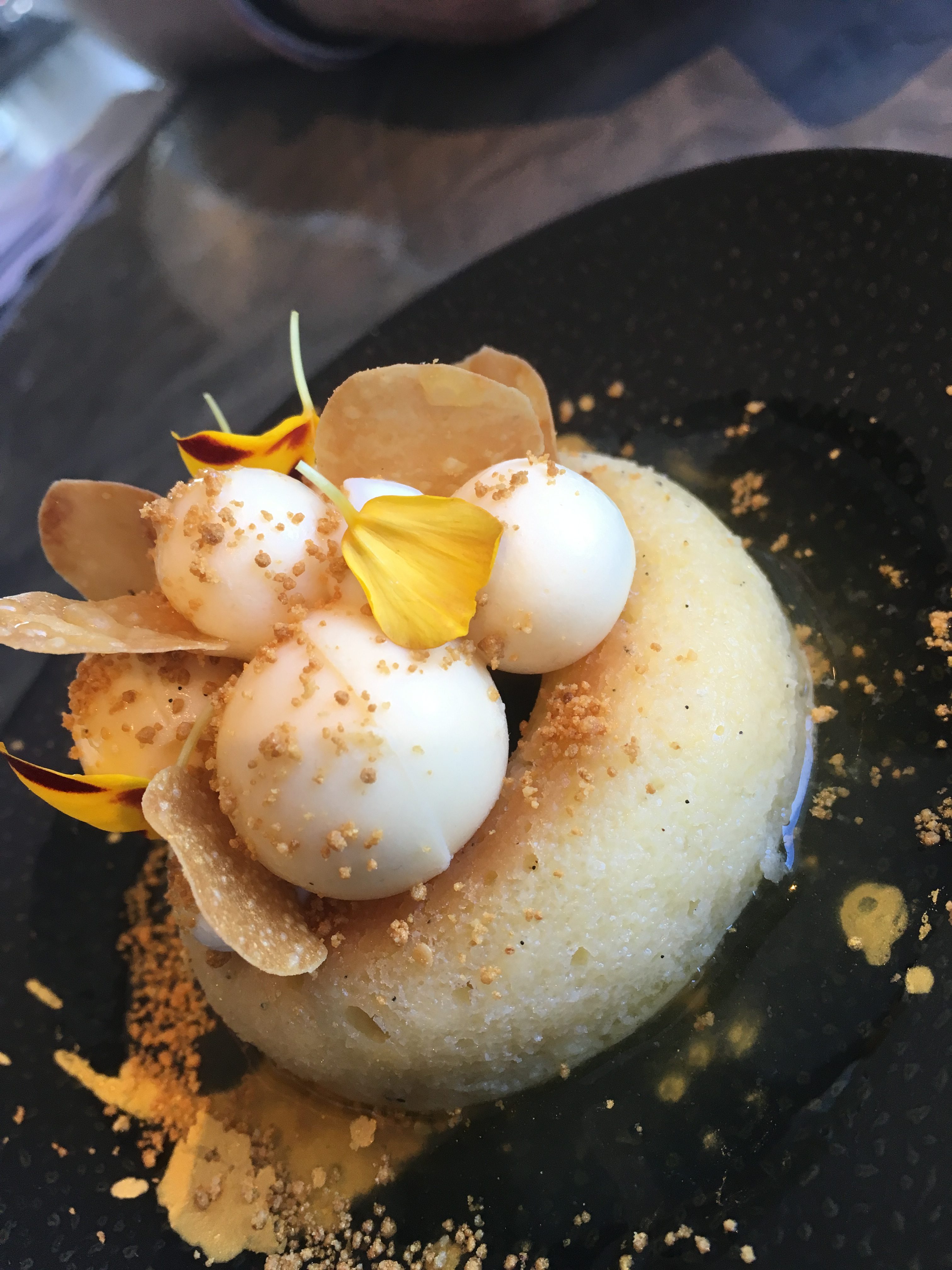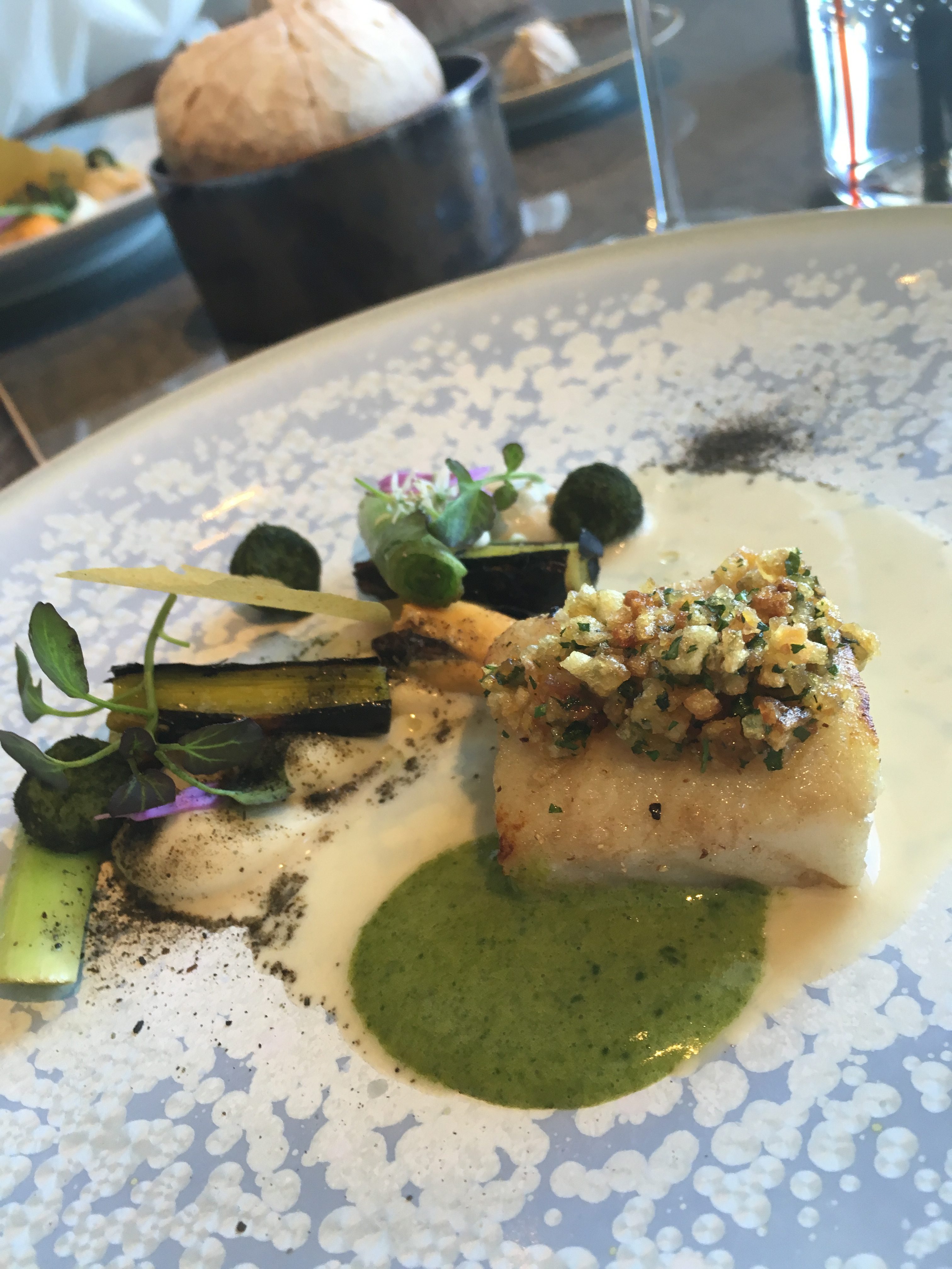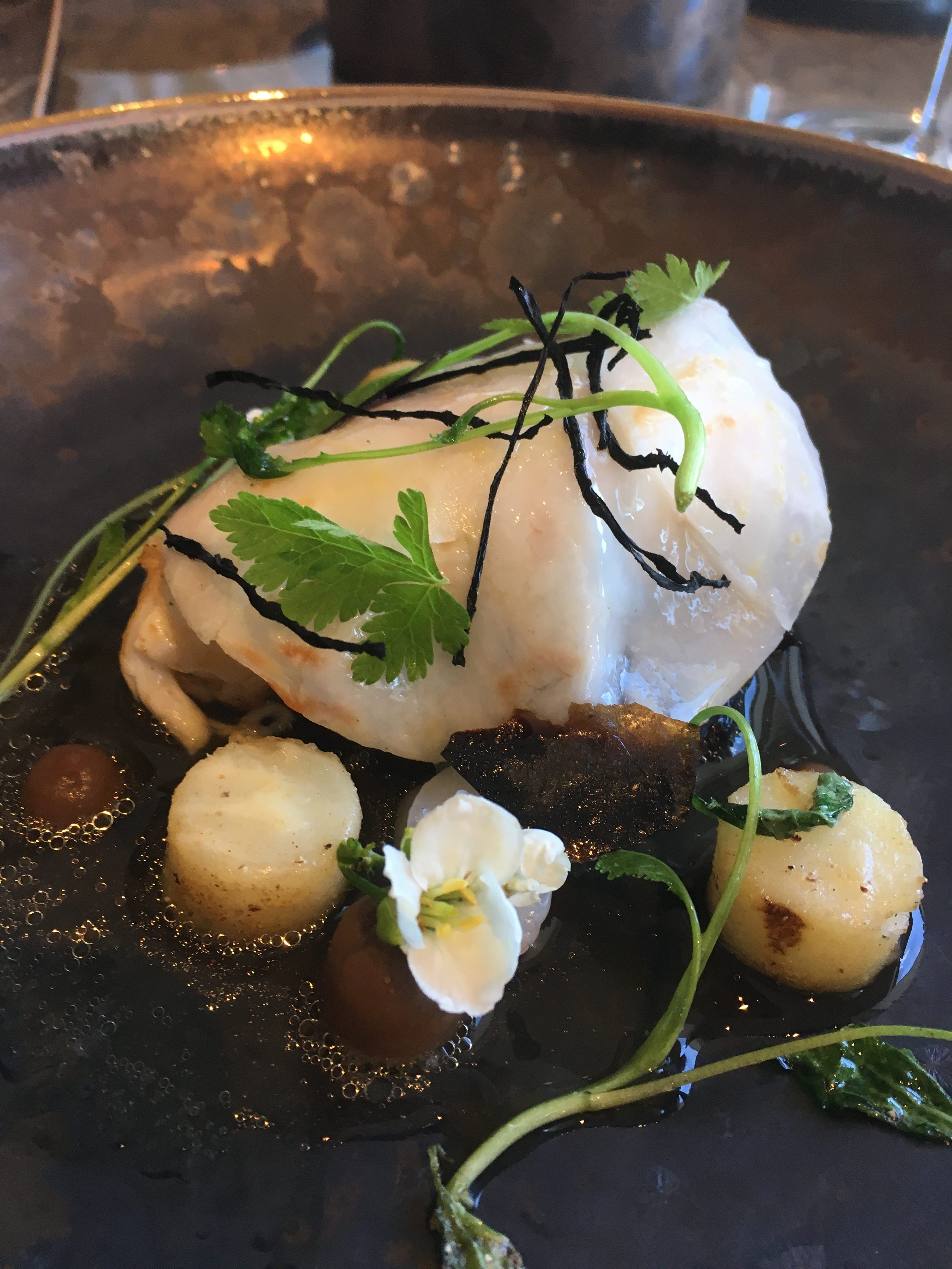 We zetten de zilte tocht verder met kabeljauw en mosselen. Met een jus op basis van mosselen kan je bij mij niet veel verkeerd doen… Ik weet niet wat ik met die schelpbeestjes heb, maar ik vind ze in al hun verschijningsvormen geniaal: gewoon natuur (met of zonder frietjes) of Aziatische gekruid, zelf geplukt nabij een Italiaanse camping of in een complexere sterrenbereiding. Always score! Ondertussen belanden we bij de vierde witte wijn en die wordt met enige trots voorgesteld wegens toch iets exotischer qua herkomst: de Viñátigo wordt verbouwd op de Canarische Eilanden.