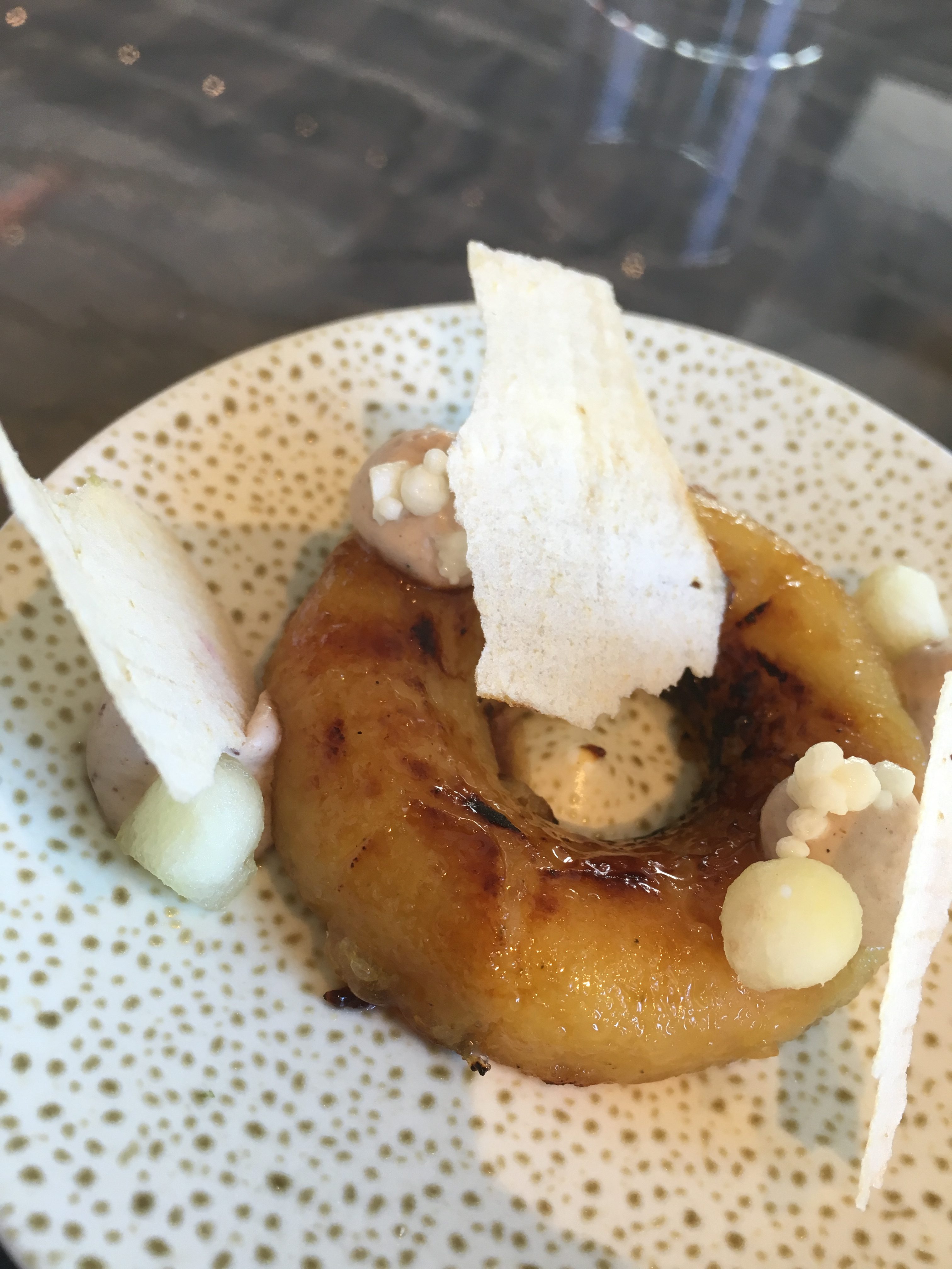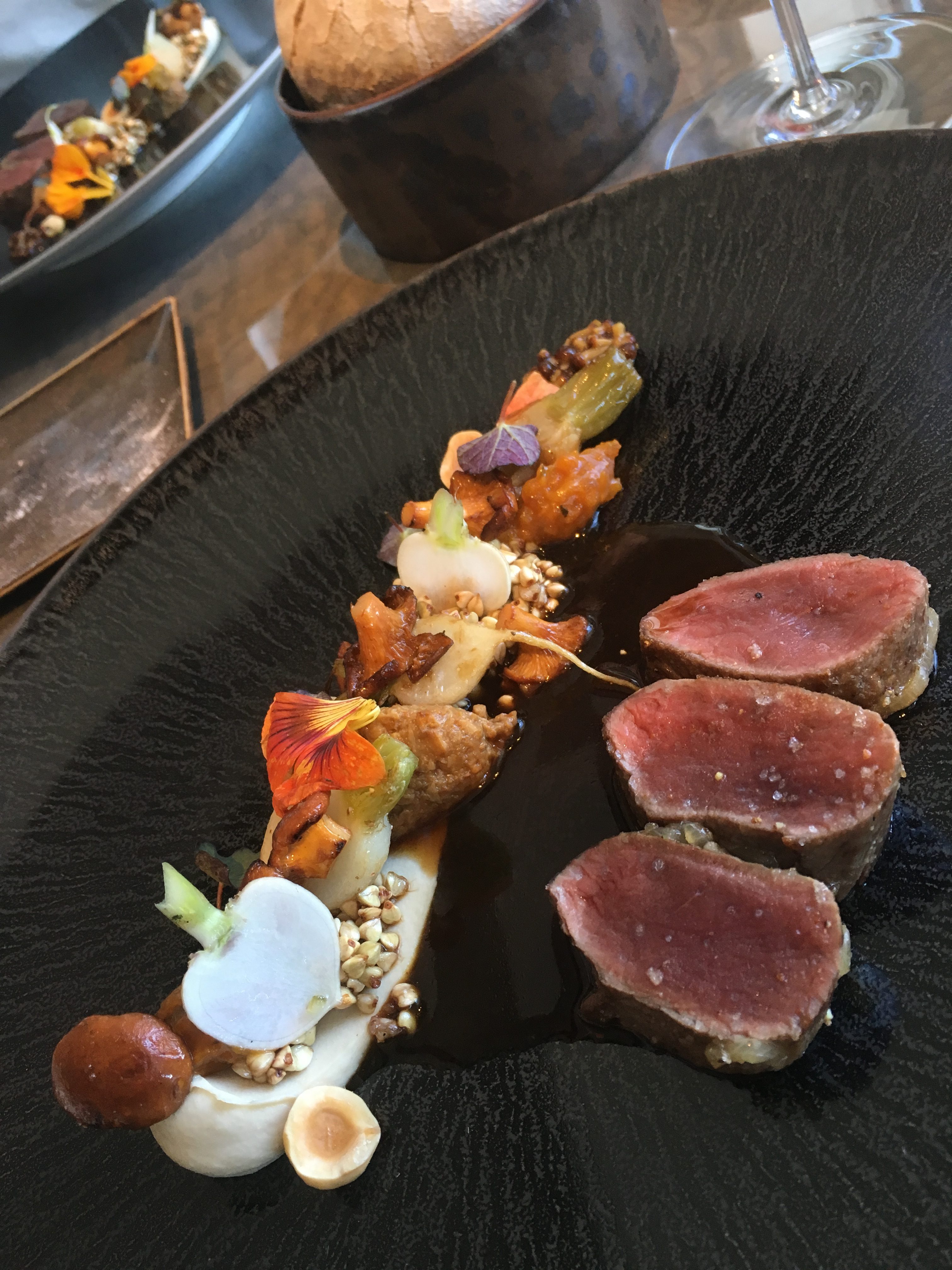 De volgende voltreffer presenteert zich: langoustine in een eerder ongewone combinatie met herfstige ingrediënten zoals spitskool en knolselder. Mij intrigeert voornamelijk het dunne schijfje knolselder dat de langoustine toedekt met daarop flinterdunne sneetjes lardo. Wit op wit, je kan de groente en het vlees / vet quasi niet van elkaar onderscheiden en van zo’n spitsvondigheden hou ik wel. De begeleidende Bourgogne Blanc van Champ Perrier zet de smaken nog extra in de verf.