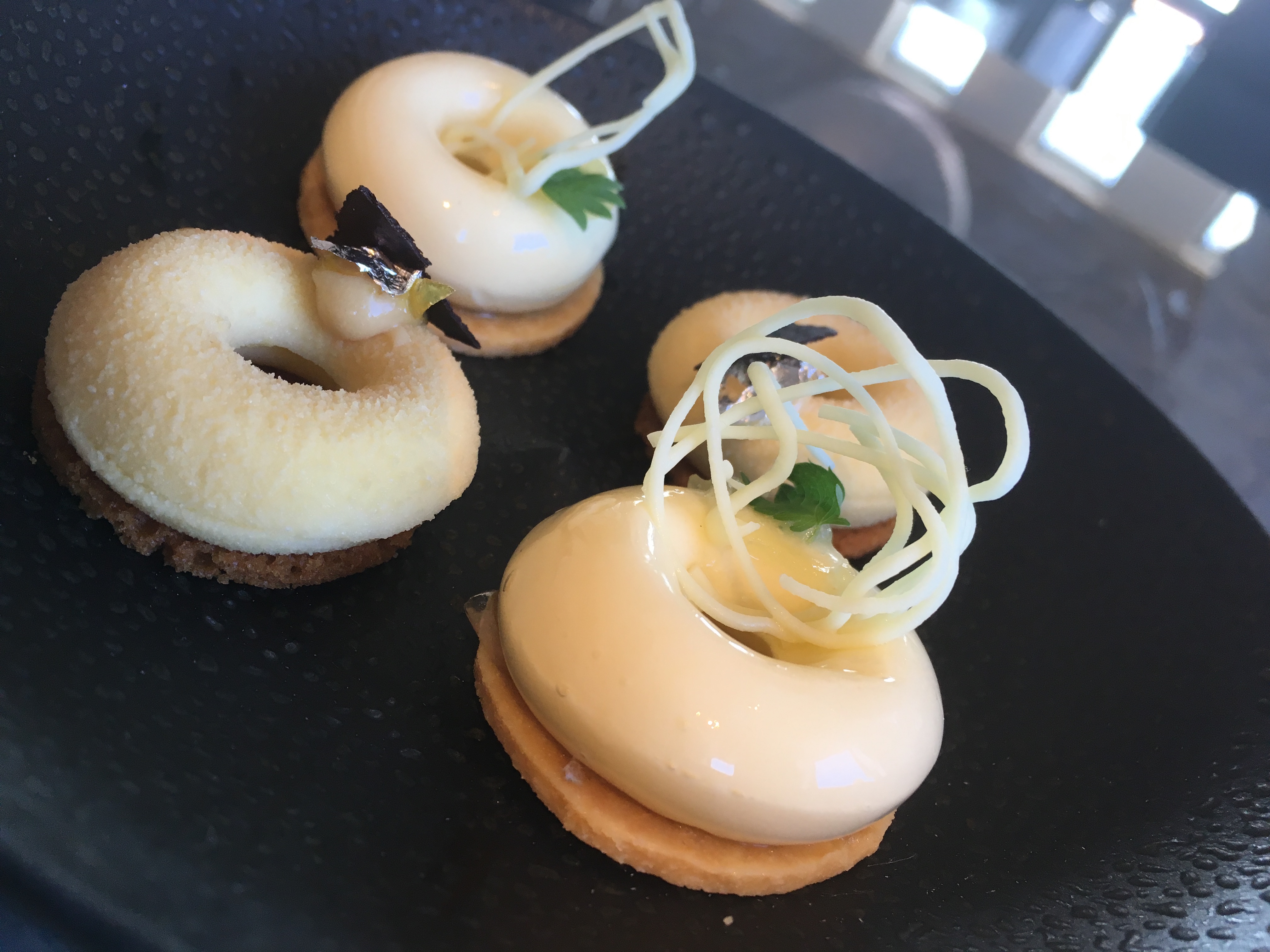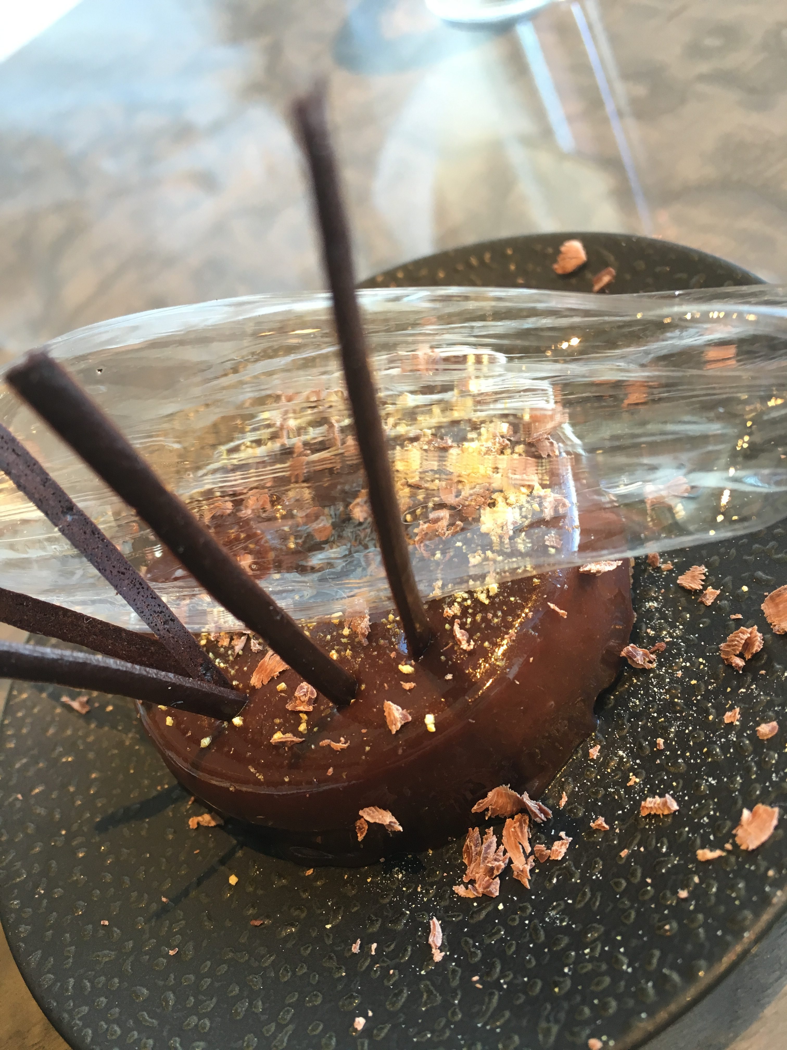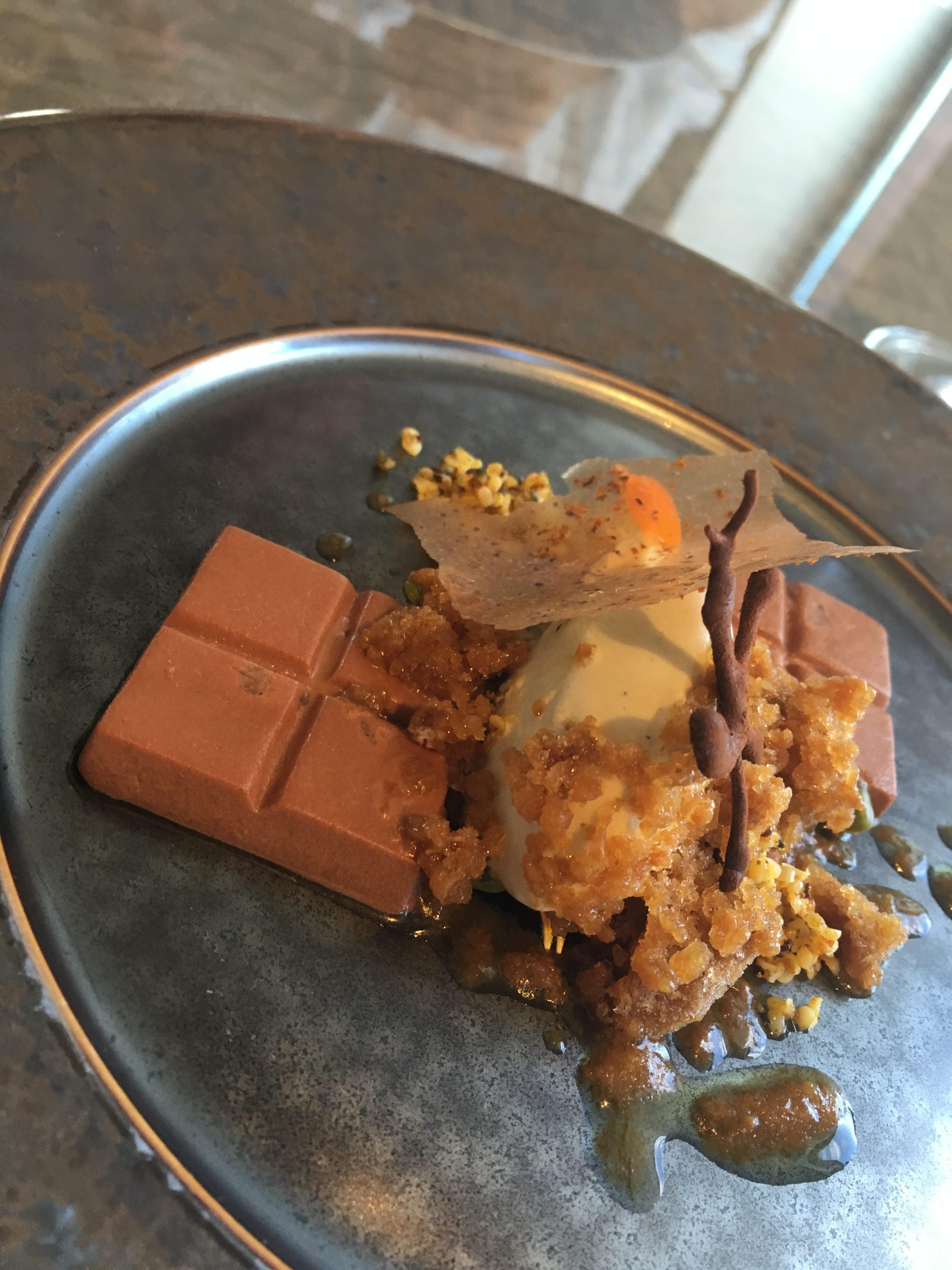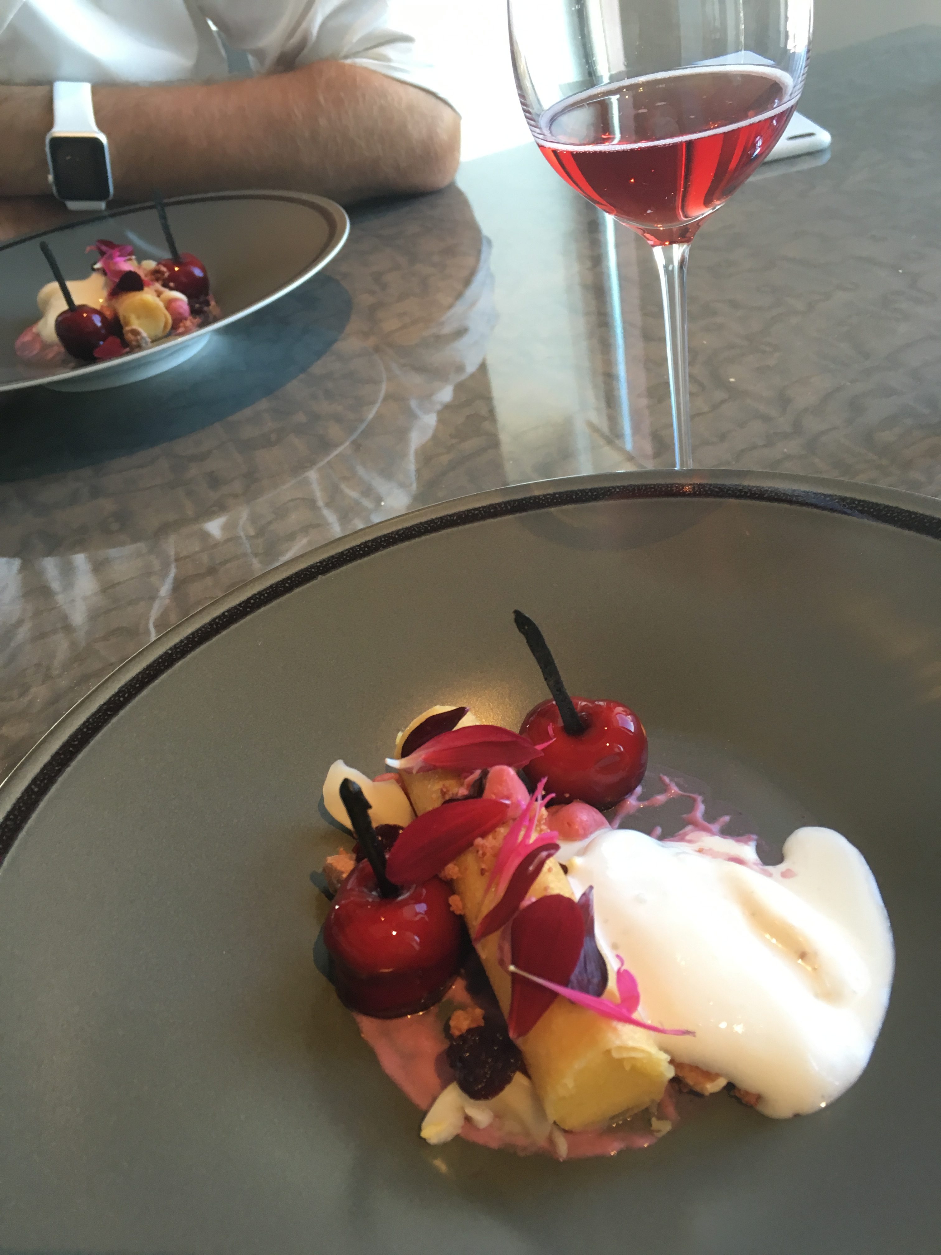 Bij het eerste dessert primeren chocolade en koffie. De zachte chocolade presenteren in de vorm van een tablet doet mij wel even glimlachen en deze mind trick keert terug bij het volgende nagerecht met kersen die tevens uit een kersenmousse bestaan. Applausje nog voor het yoghurtijs, zonder twijfel mijn favoriete ijssmaak. Hierbij horen de laatste alcoholische consumpties: Oloroso El Galéon (een soort sherry) bij de chocolade en Brachetto d’Aqui (een lichtrode Italiaanse wijn) bij de kersen.