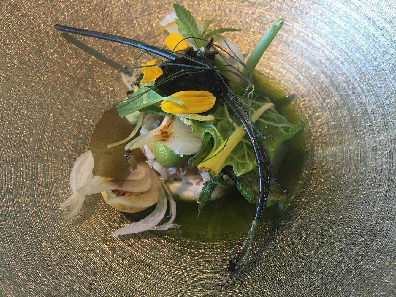 Langoustine – spitskool – lardo – knolselder – zwarte knoflook
