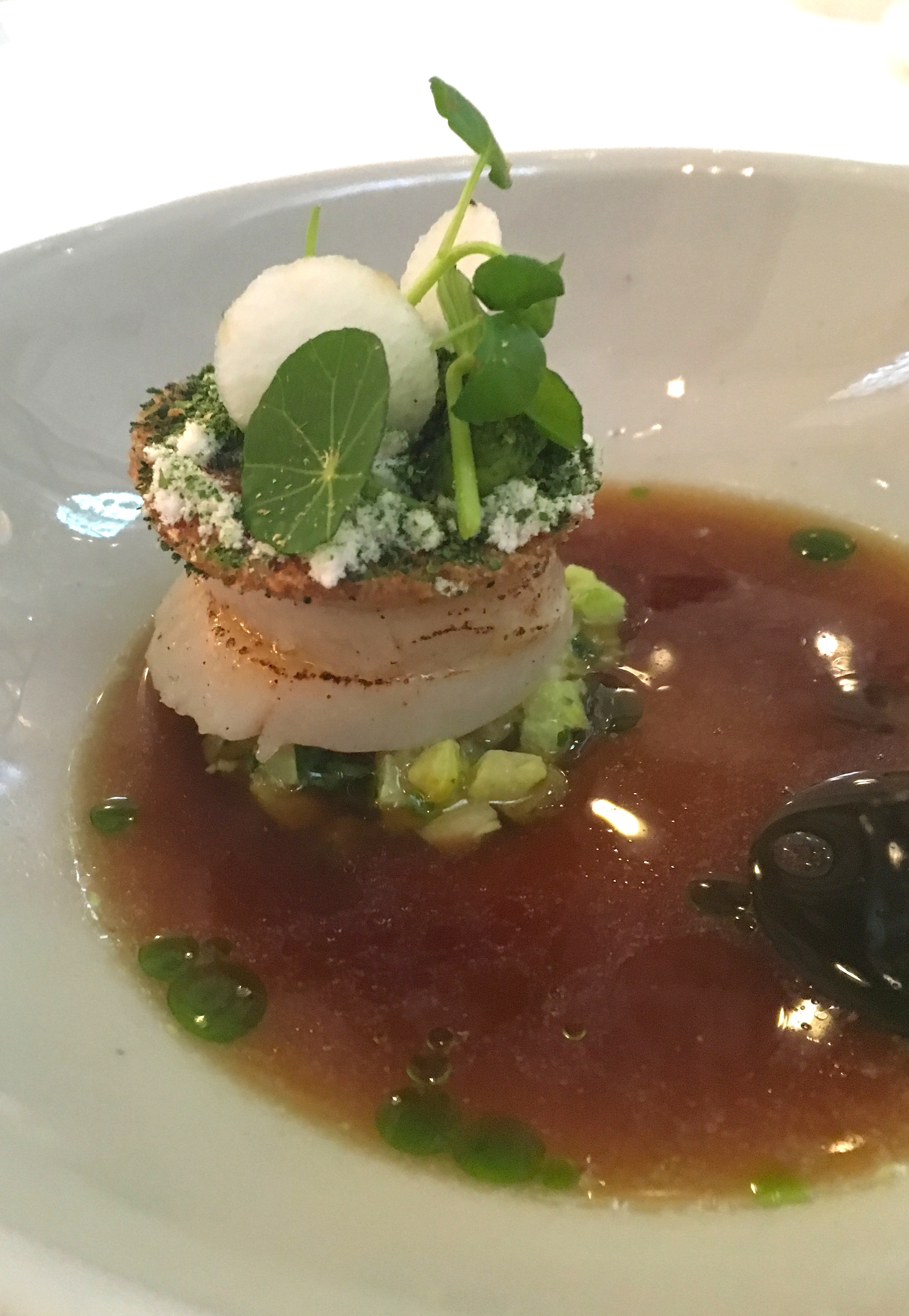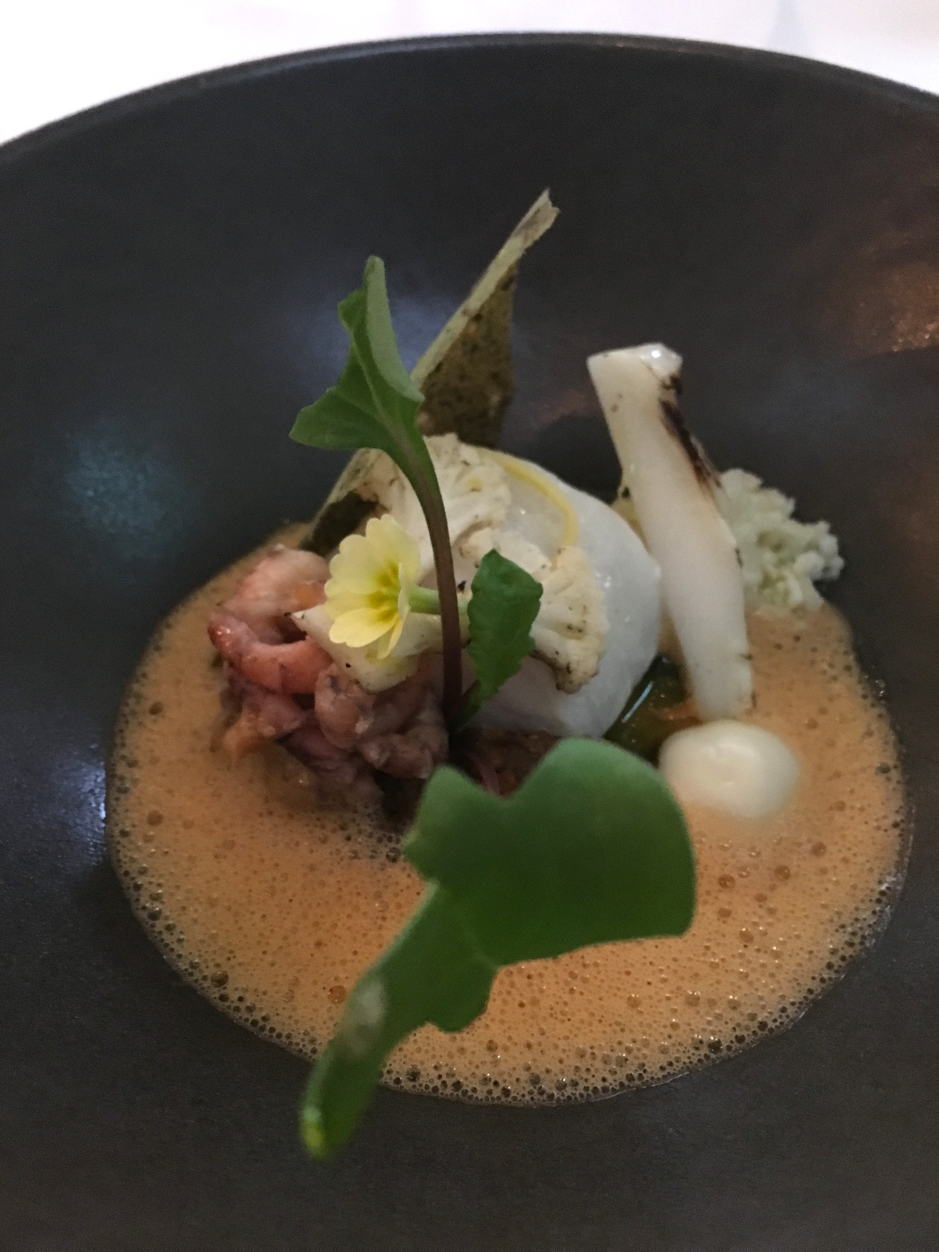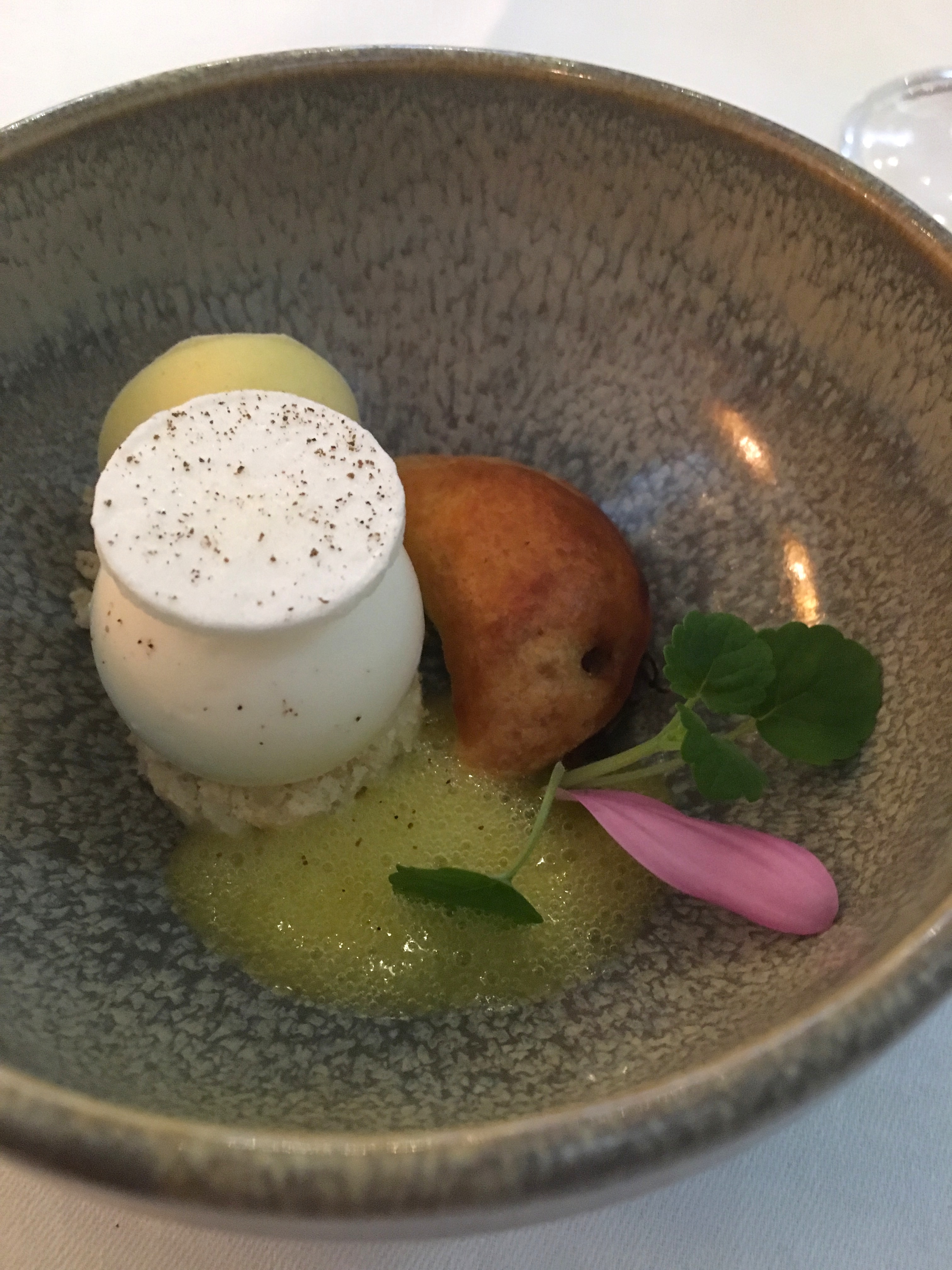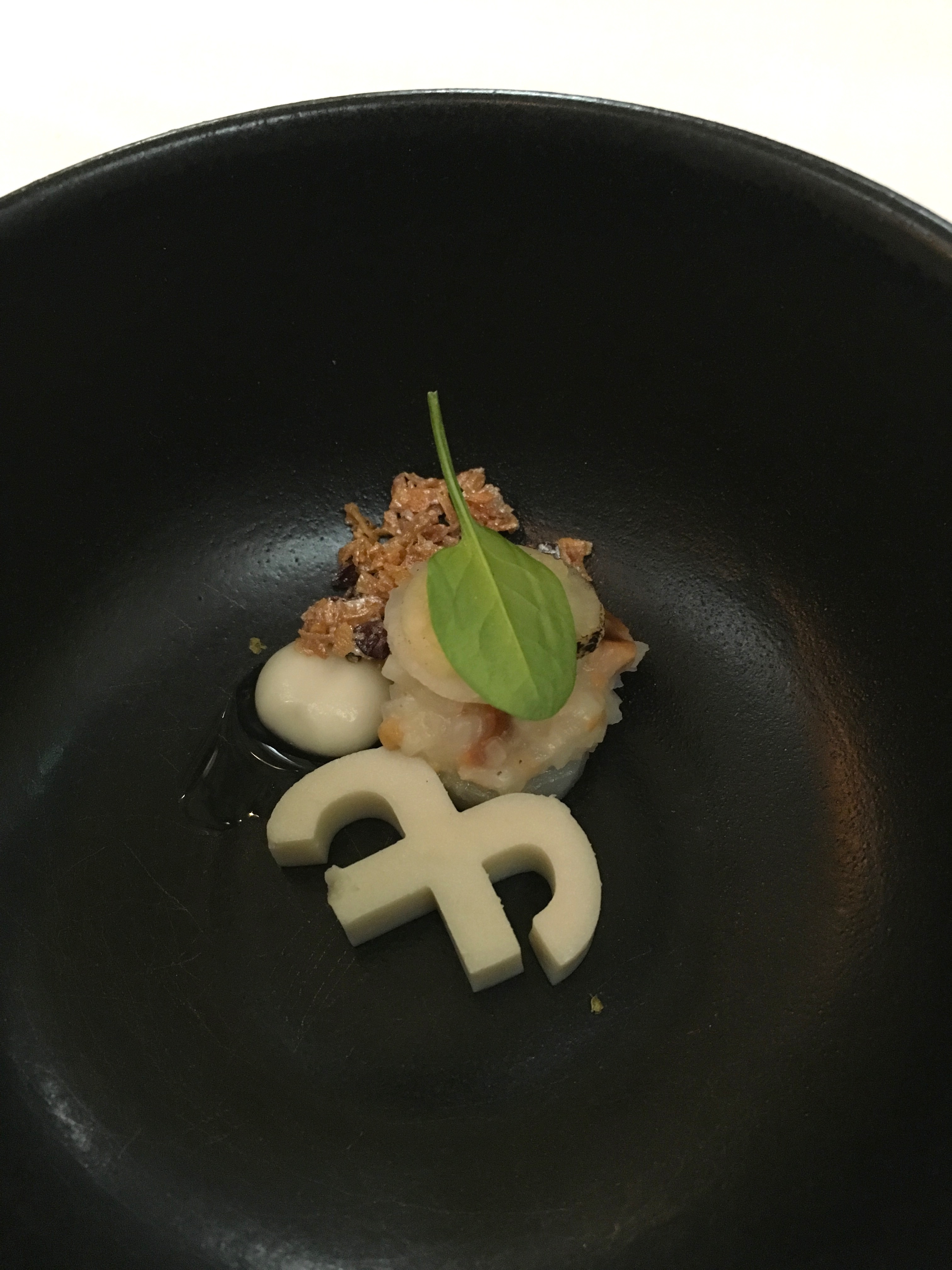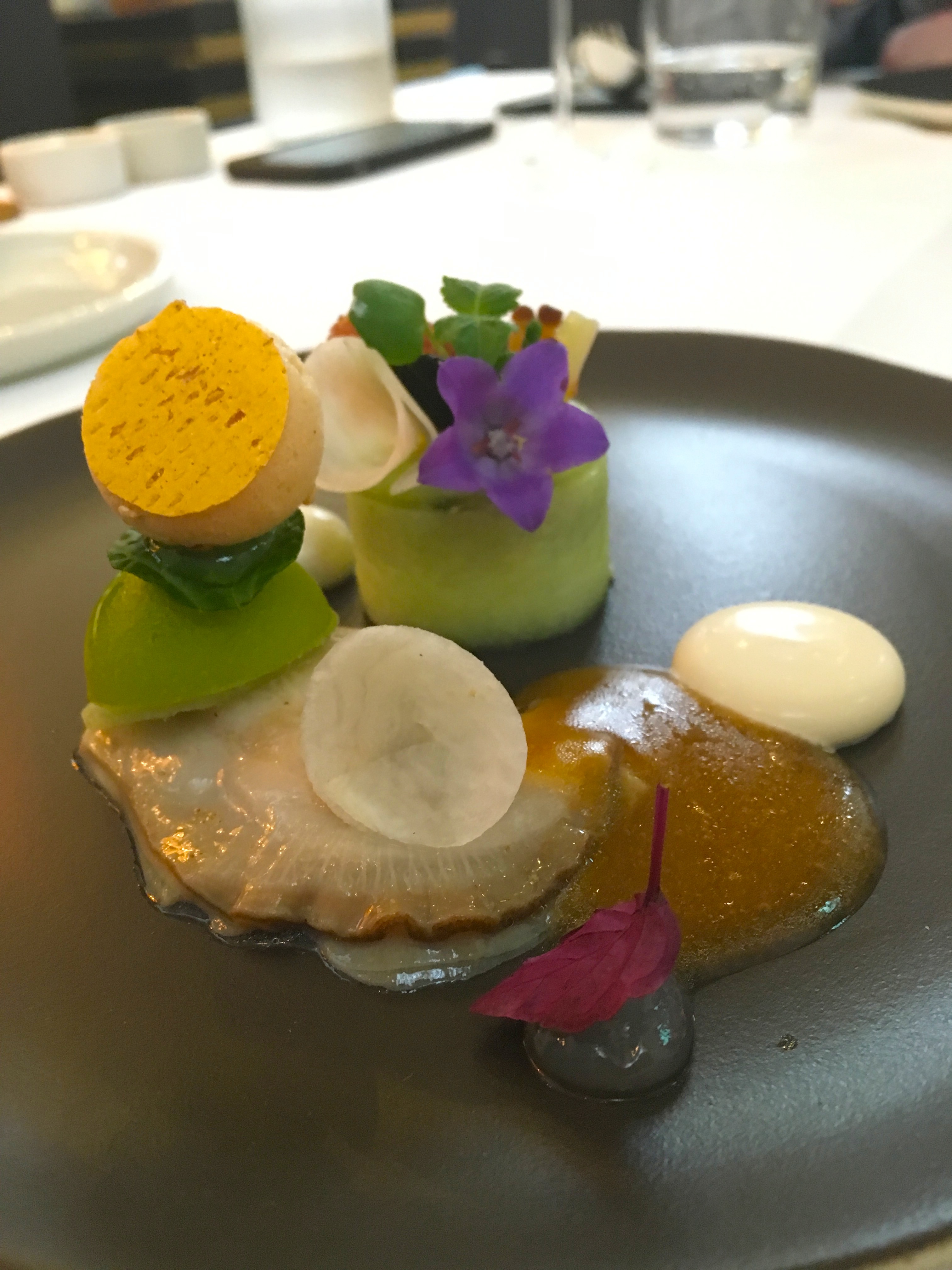Daar waar de amuses de juiste toon zetten, zorgt het eerste voorgerecht meteen voor een echt hoogtepunt. Zo’n mooie, grote, stevige oester in combinatie met Aziatische smaken (soja en citrus). Wat de oester bijzonder maakt, is dat je die met mes en vork in stukjes kan snijden en bij wijze van spreken opeet als een lapje vlees. Totnogtoe slurpte ik oesters doorgaans uit de schelp… Je ziet het niet goed op de foto, maar het achterste groene torentje is een echt kunstwerkje met mini-enoki, bloemetje en zo meer.