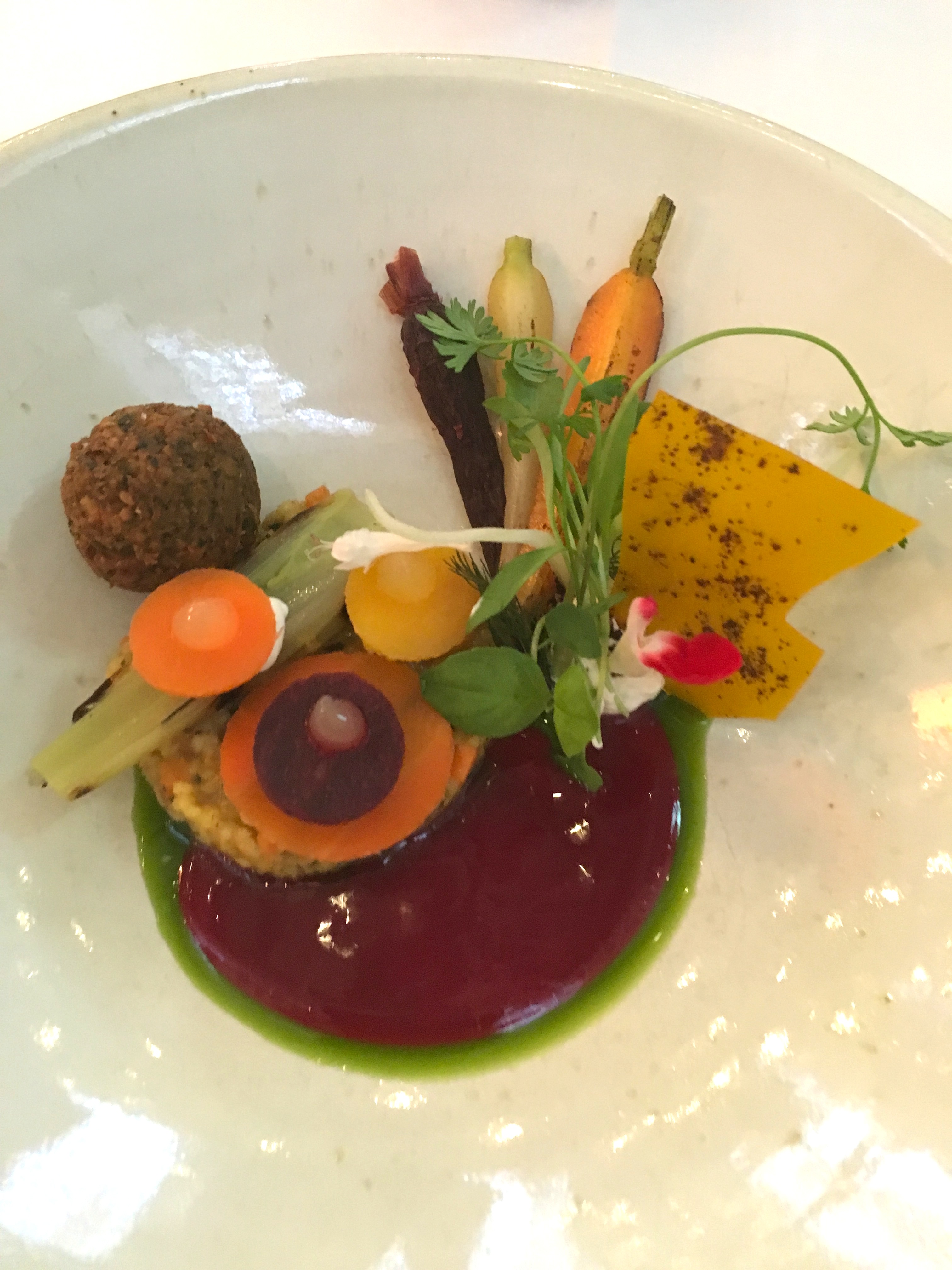 De wijn – Peter Lauer uit het Duitse Saarland – die we bij deze borden drinken, valt bij mij ongelofelijk in de smaak. Mijn voorkeur voor witte wijn ten voeten uit! Hier kan ik wel meerdere glazen van op. Gelukkig blijkt de sommelier voor dit eerste glas even vergeten dat ik een BOB-arrangement bestelde en krijg ik de volle lading.