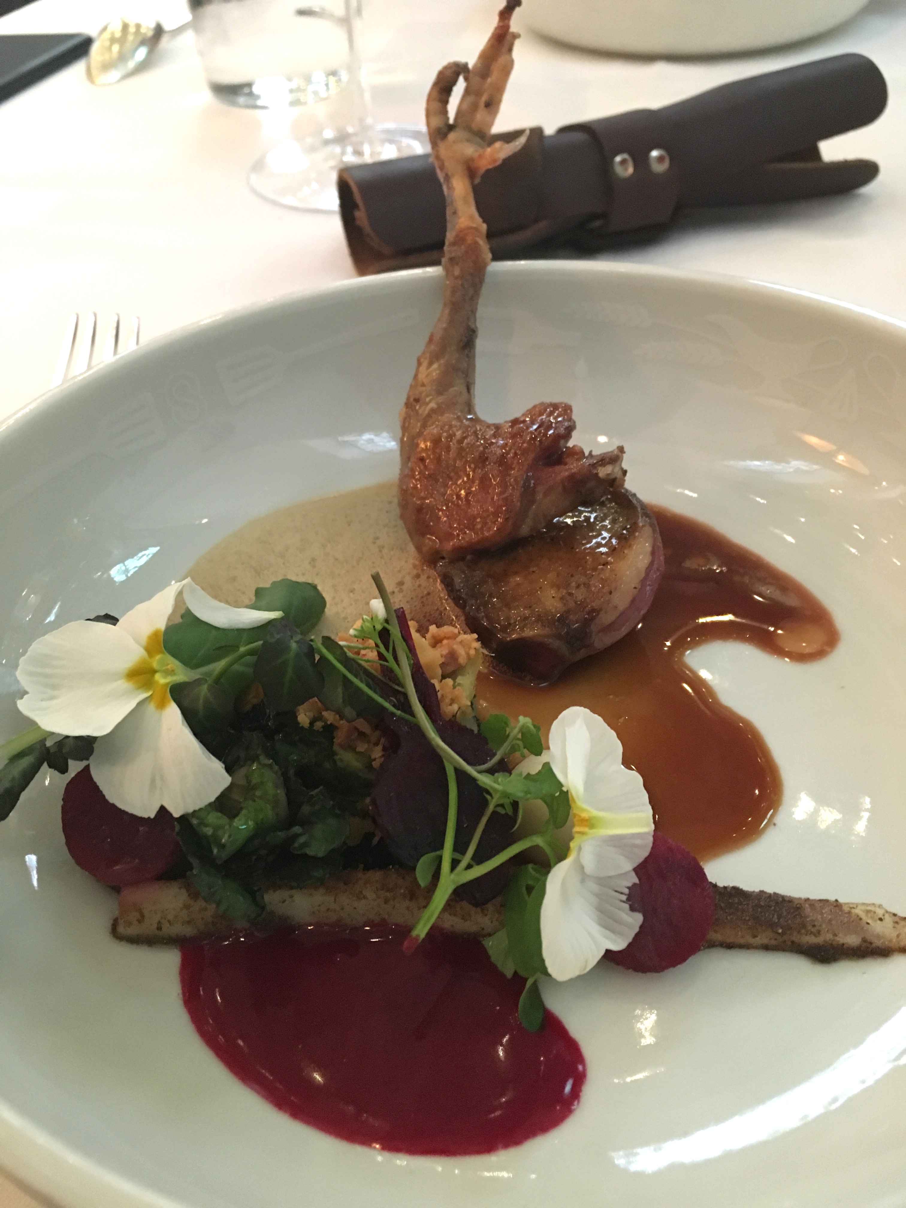 Dan zien we ineens iets meer stress in de keuken: alle hens – zowel de koks als het zaalpersoneel – aan dek voor het duifje. Ik snap het wel. Dit vlees moet perfect gegaard en dus nog een beetje rosé zijn. Op een zo kort mogelijke tijd worden de borden gedresseerd, de kannetjes met saus gevuld, de dienbladen geladen en vervolgens geserveerd. Om deze duif te snijden, krijgen we de prachtige Florentive Kitchen Knives van het huis die samen met nog wat andere merchandising (een ander woord kan of wil ik er niet voor bedenken) ter plekke aangekocht kunnen worden.