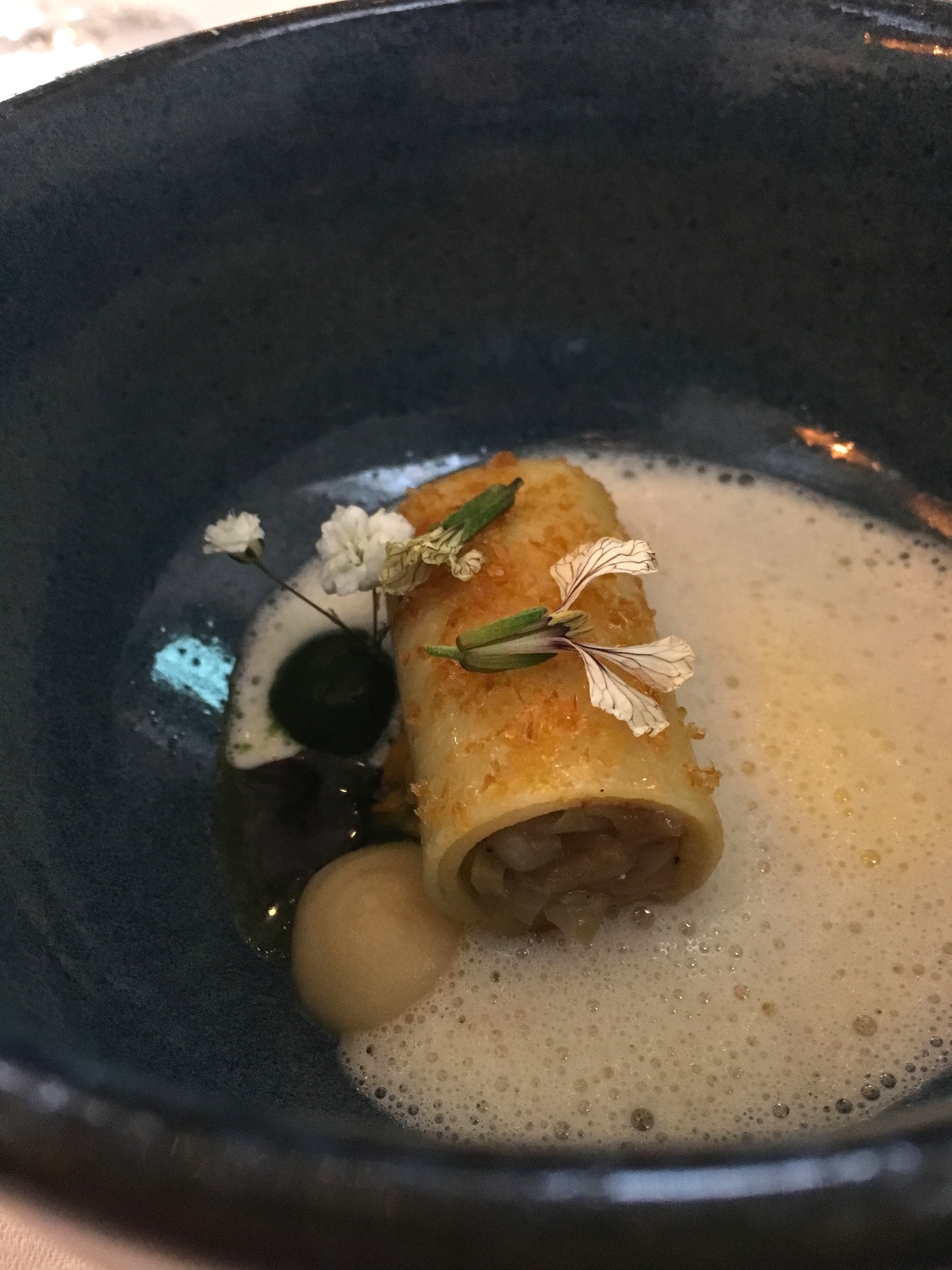 Het volgende voorgerecht pakt de draad van helemaal-ons-ding terug op: op enkele Zeeuwse mosselen ligt een rolletje cannelloni met gebarbecuede spitskool en bottarga van tevens Zeeuwse oorsprong. Je merkt dat de chefs hun afkomst blijven koesteren en dat juichen wij alleen maar toe.