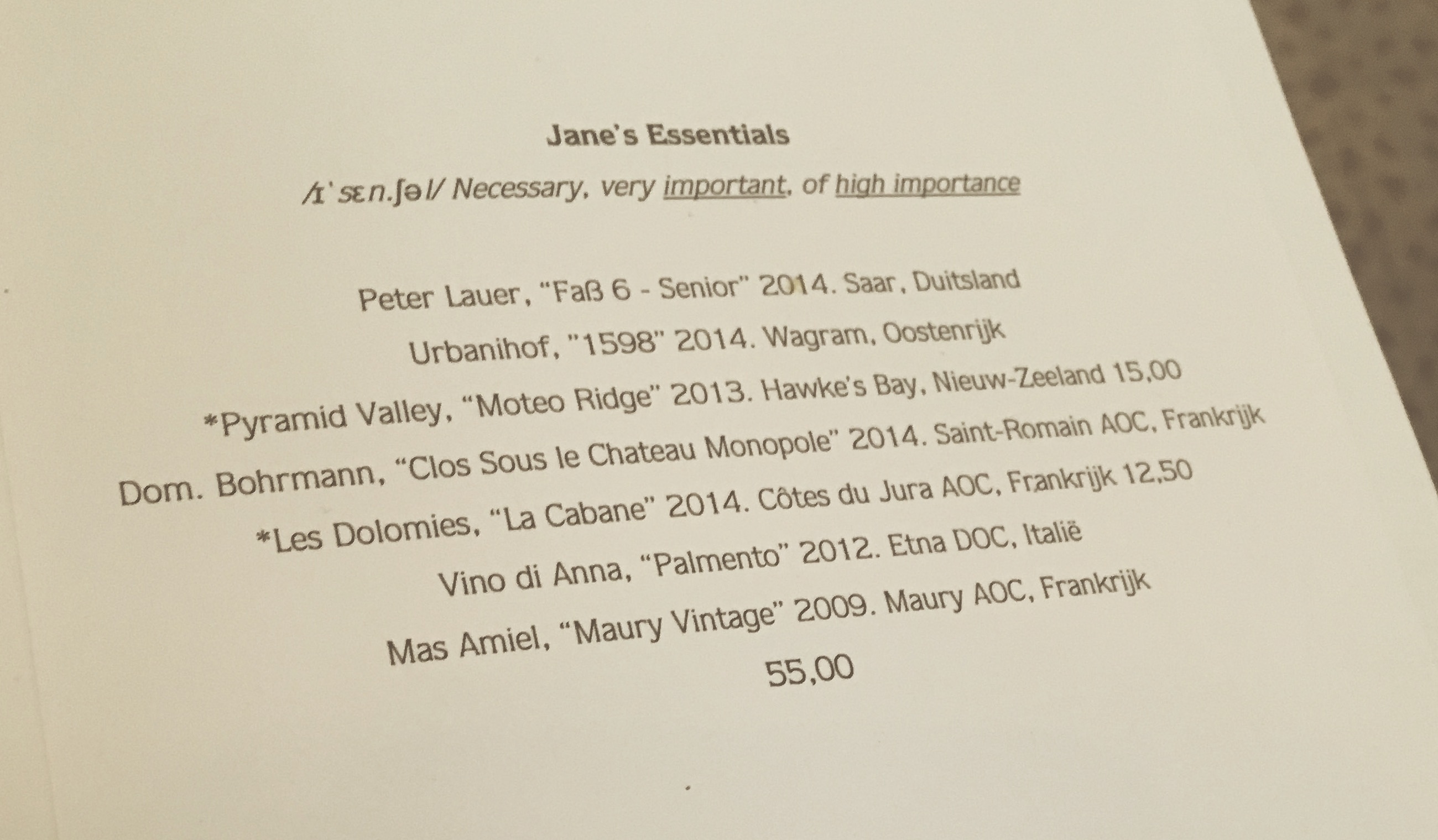 Wijngewijs kunnen we kiezen uit Jane’s Essentials (€ 55) of Jane’s Inimitables (€ 77). We redeneren dat ook de ‘gewone’ wijn in een tweesterrenzaak tongstrelend moet zijn en ik kan nu al verklappen dat we ons vermoeden tijdens de lunch bevestigd zien. Mijn vriend wil graag de normale hoeveelheid, ik informeer naar een BOB-arrangement (€ 27,50). Perfect! Zo geraken we straks nog veilig terug in Gent.