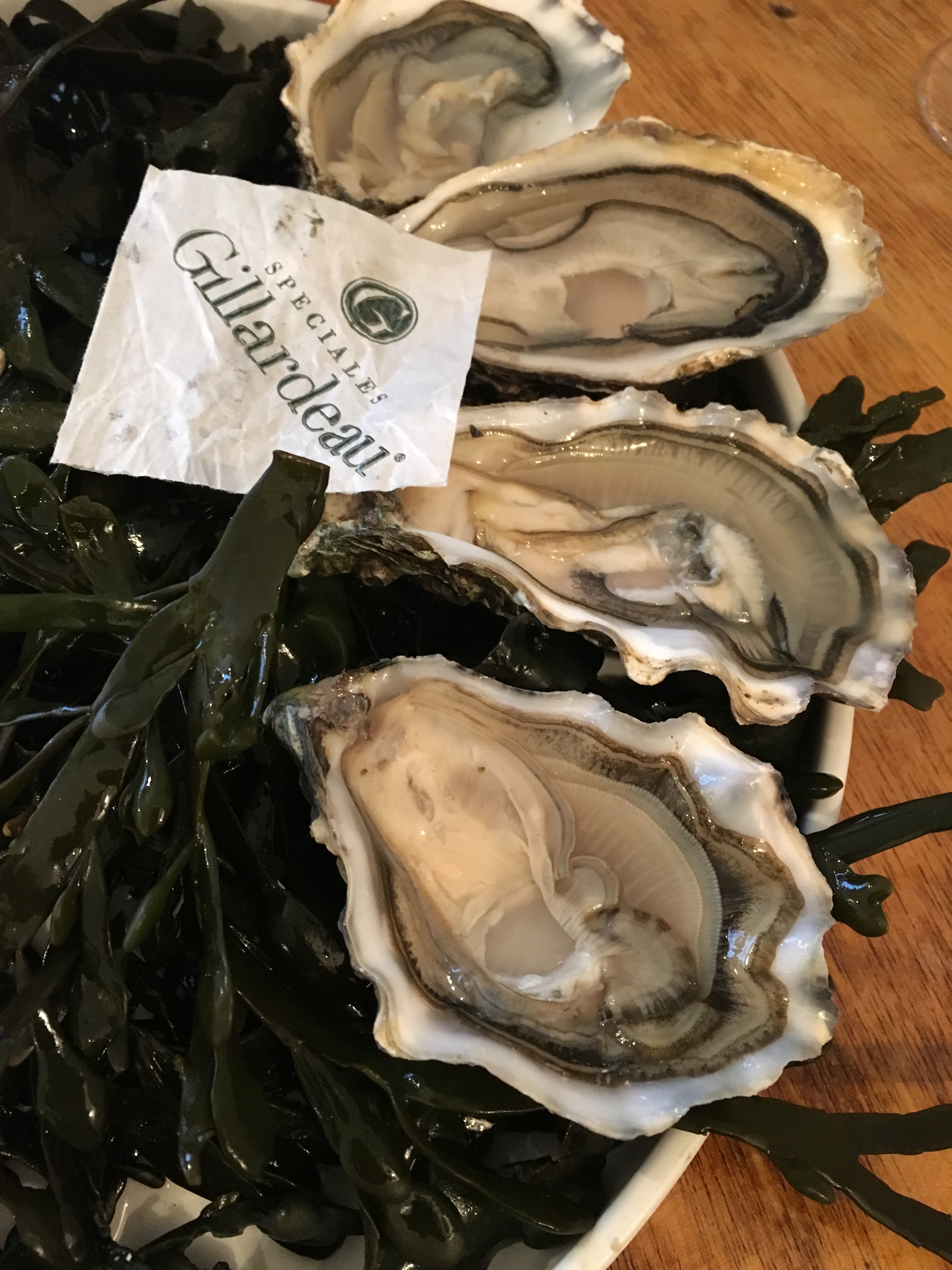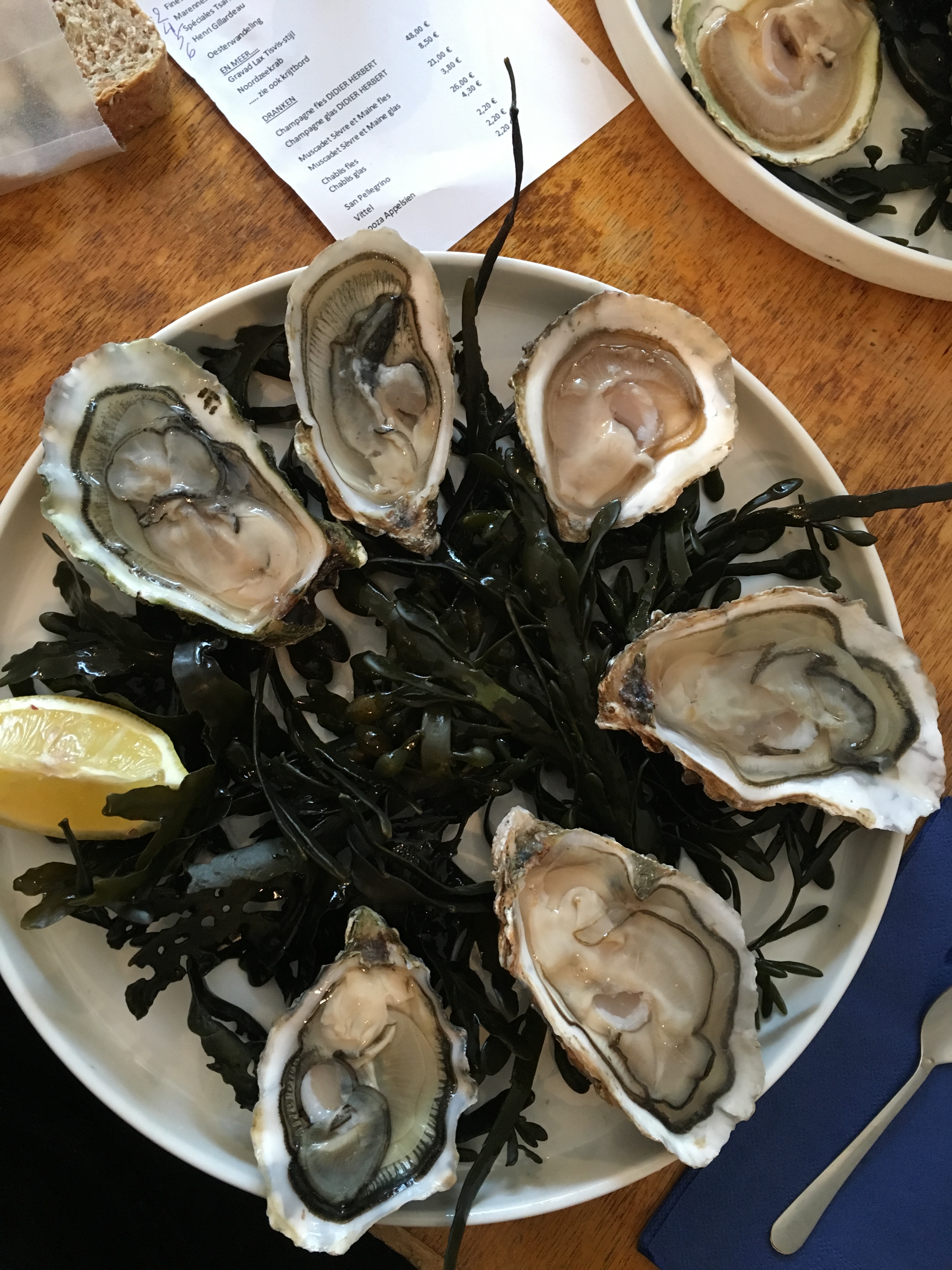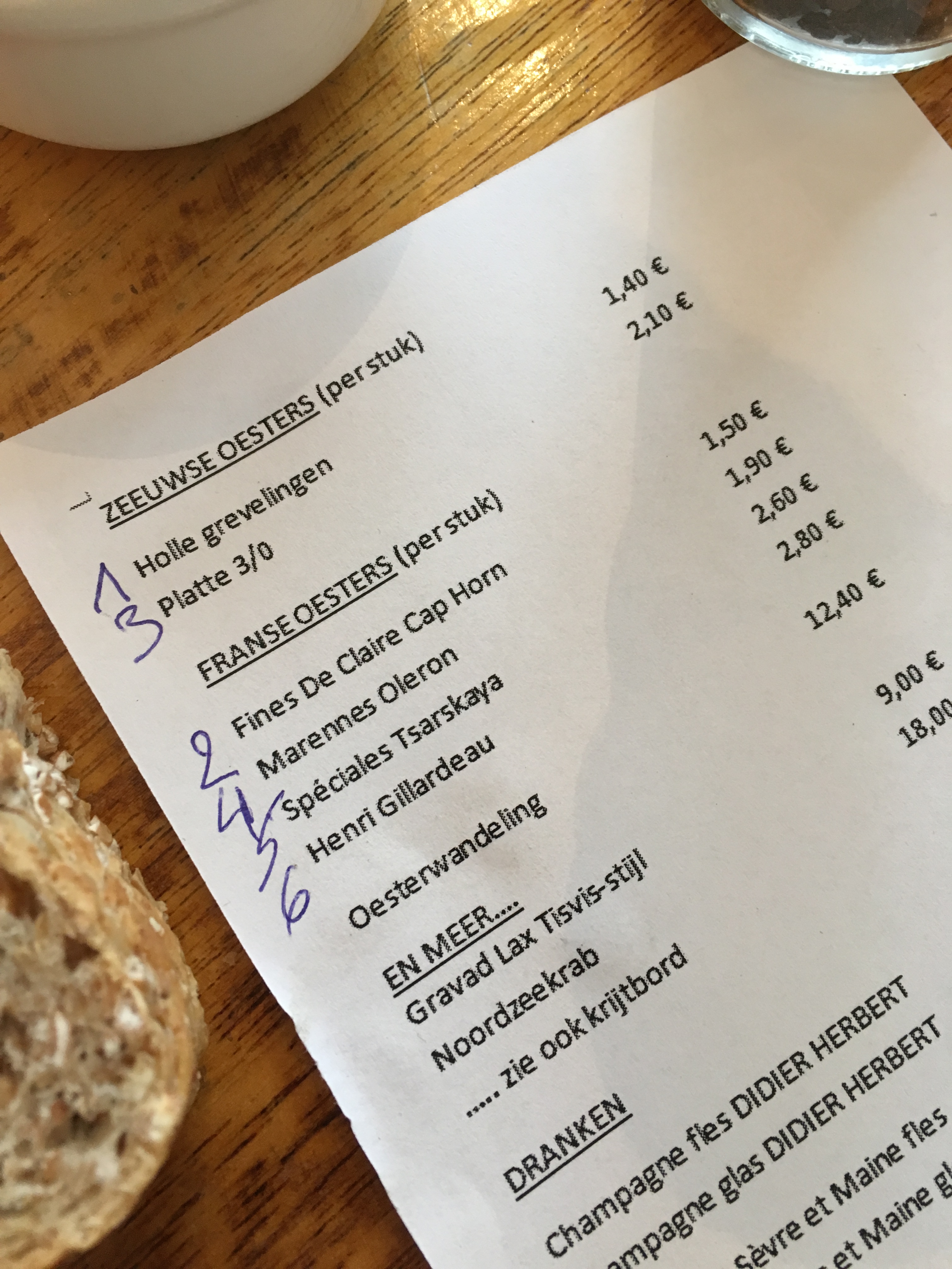 Maar goed, doe ons maar een fles Chablis (€ 26) en voor elk de oesterwandeling (€ 12,40) om kennis te maken met de zes soorten die hij in huis heeft. Spannend! We krijgen elk een bord met zeewier, oester en citroen. Daarbij hoort ook onderstaande legende, om zeker te zijn waar we precies aan het wandelen zijn. Hij raadt ons wel aan om geen citroen toe te voegen en vanaf nummer vier tevens geen peper. Puur natuur.
