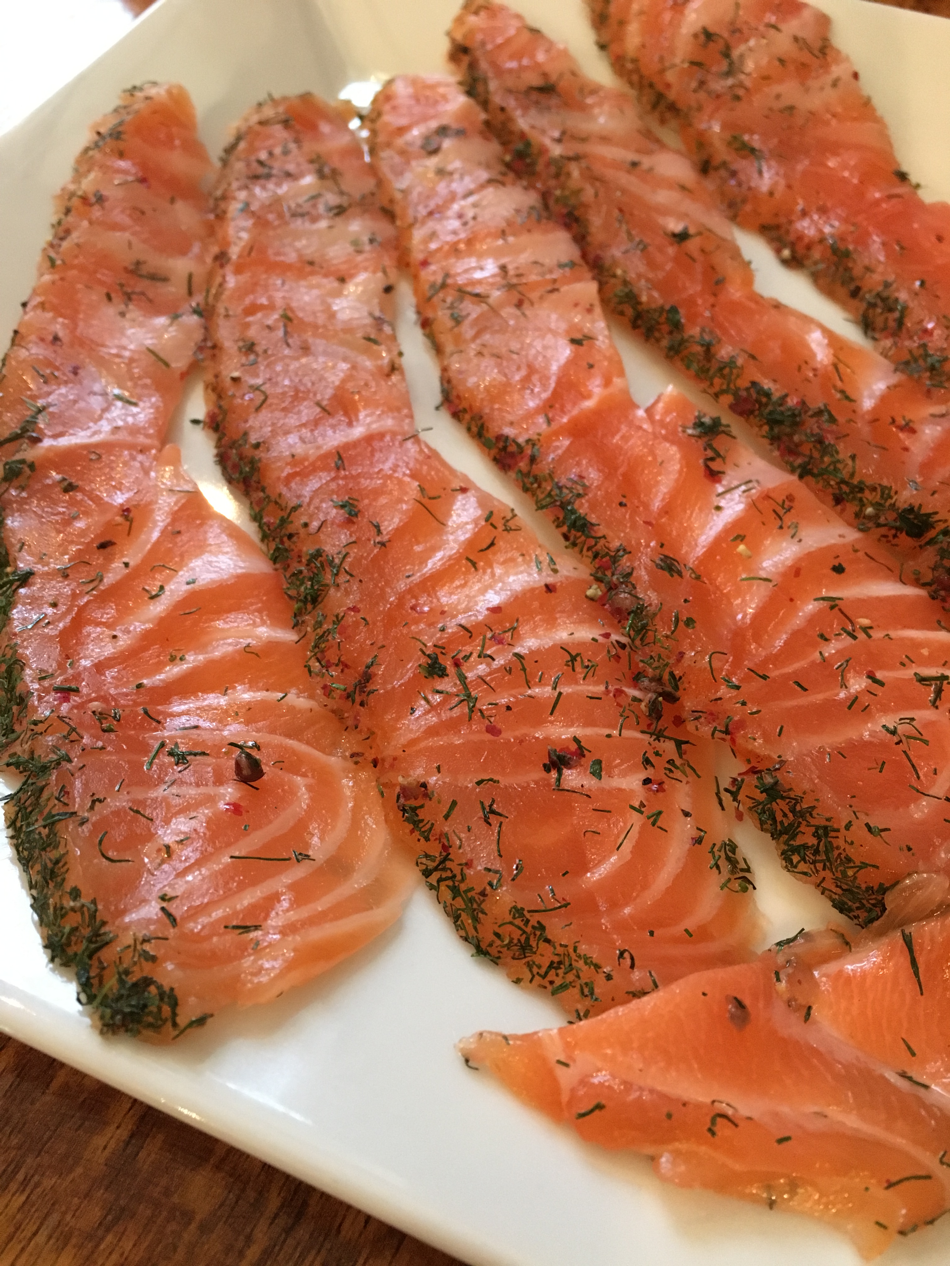 Ik zit met mijn rug naar de toog, toch kijk ik soms eens achterom om Meneer Tisvis in de weer te zien met bijvoorbeeld grote stukken zalm. Zalm ligt mij wel als vis en deze gravad lax absoluut. Hij vertelt dat de rauwe zalm drie dagen tijd nodig heeft om te trekken en te ver-gravad-lax’en. Dit moet ik thuis dringend eens uitproberen… Al vrees ik wel dat ik niet zo vlotjes kan fileren als hem.