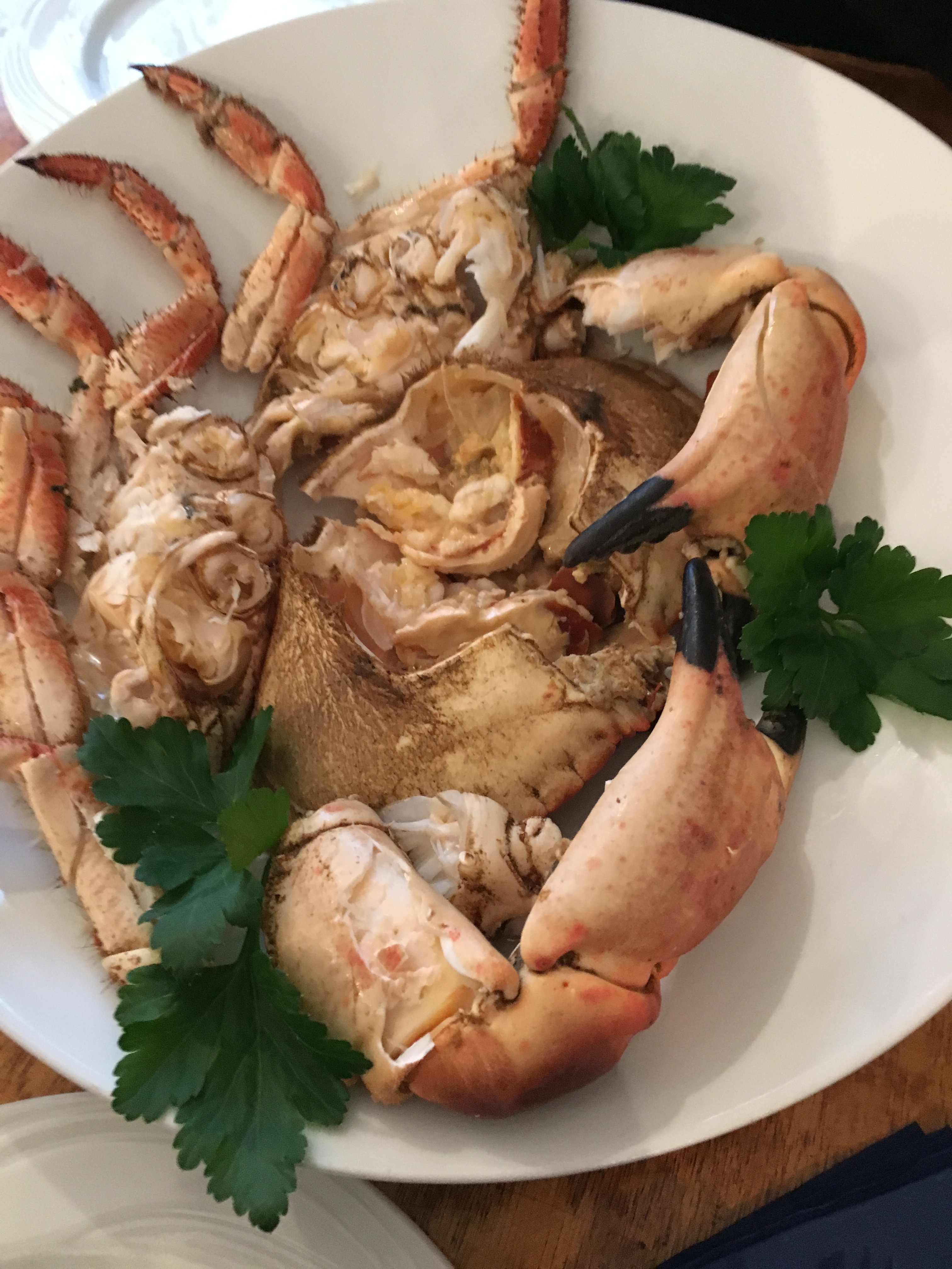 Ondertussen meldde hij ook dat de krab (€ 18) binnen een kwartier toch beschikbaar zal zijn en wij gaan maar al te graag op dat voorstel in. Hij vraagt of het beestje reeds gekraakt mag worden: dat klinkt handig! Ik ben een grote fan van krab, meer zelfs dan van kreeft. Met volle teugen geniet ik dus van het friemelen met onze zeevruchtenprikker om alle stukjes krabvlees er uit te halen. Beetje dippen in een mayo-achtige dressing en klaar!