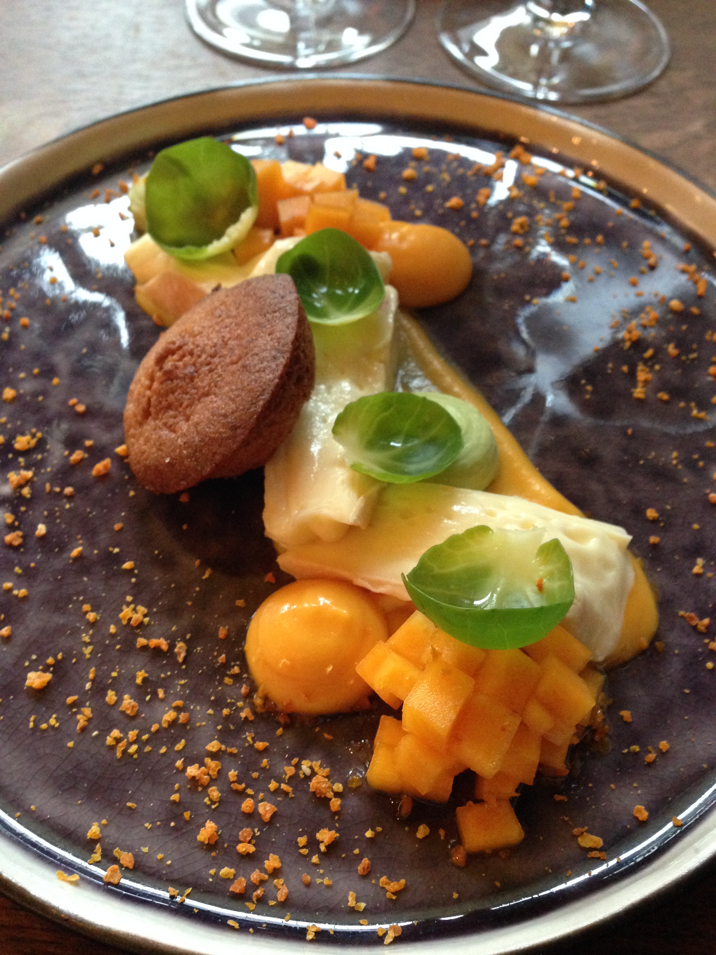 Daar komt dan mijn karnemelkijs met appelsien en curryplant. Hier haalt menig dessertmens ongetwijfeld zijn of haar hartje aan op. Hoezeer ik ook van de smaak van karnemelk in bereidingen (niet puur!) hou, mij zegt dit nagerecht niet veel. Als er desserts zijn die mij wel kunnen verleiden, dan bevinden die zich meer in de gecombineerde geburen van koffie, caramel en yoghurt. Dus zeker geen verwijt naar de chef toe, ik moest het simpelweg bij een cappuccino houden in plaats van die ander te volgen.
